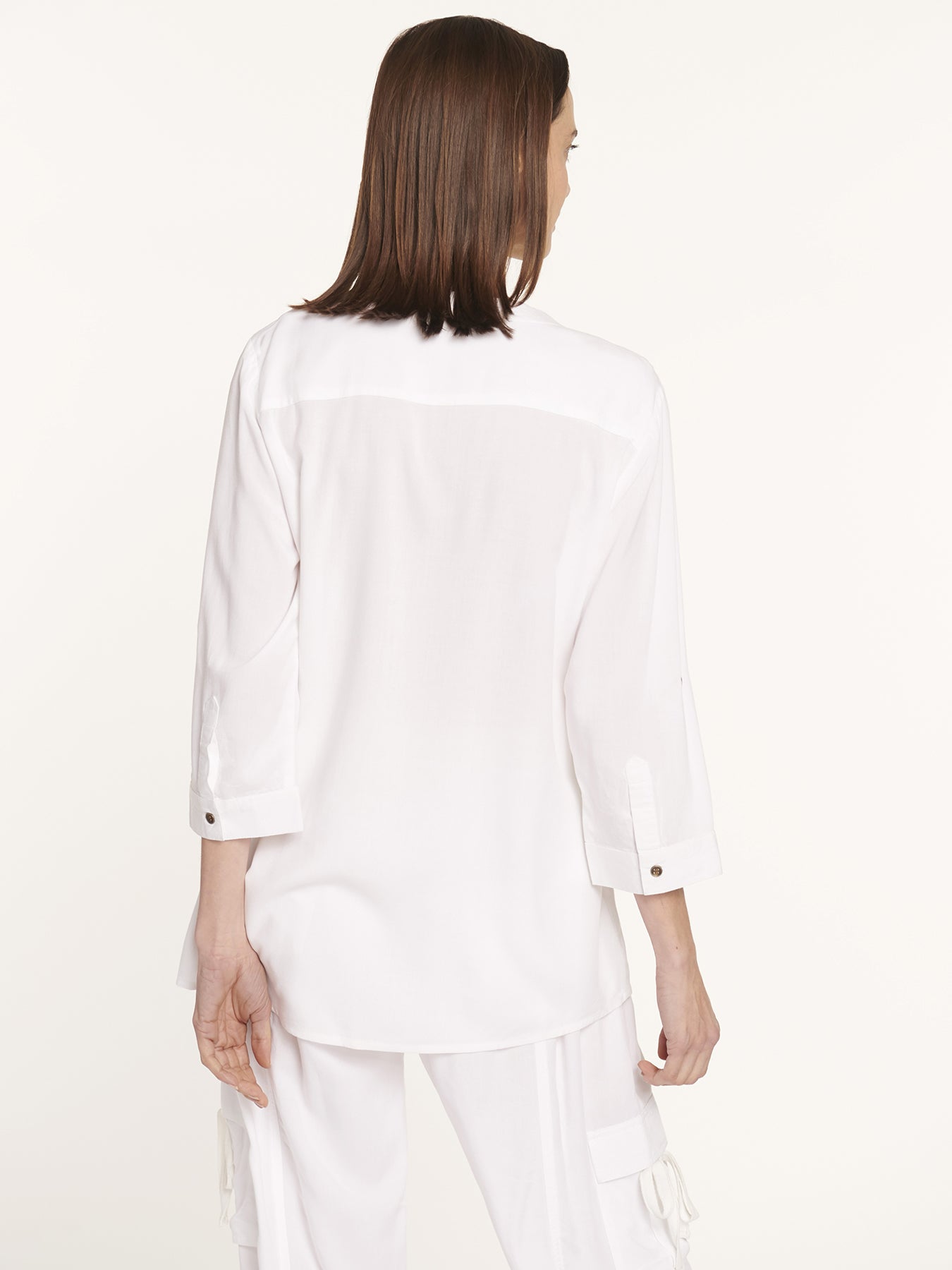Blusa abotonada de manga larga con botón al lateral para poder acortar su largo, tiene dos bolsillos en la parte delantera. Cuello tipo moa.