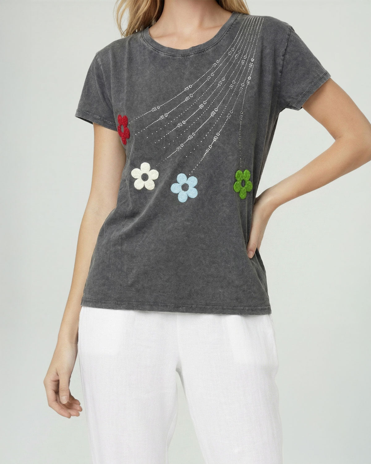 La polera Olinda Lineatre destaca por su estilo relajado con un toque divertido y femenino. Confeccionada en algodón suave de efecto desgastado, presenta un calce recto y cuello redondo clásico. Su encanto radica en las flores aplicadas en fieltro de colores vivos que se distribuyen en la parte frontal, acompañadas de líneas brillantes bordadas que cruzan el pecho como un guiño lúdico y artístico. Esta prenda combina lo cómodo con lo visualmente atractivo, ideal para elevar un look casual sin perder frescura. Perfecta para usar con jeans blancos, pantalones amplios o shorts de lino. Ideal para días de paseo, fines de semana o momentos relajados con un toque de personalidad.