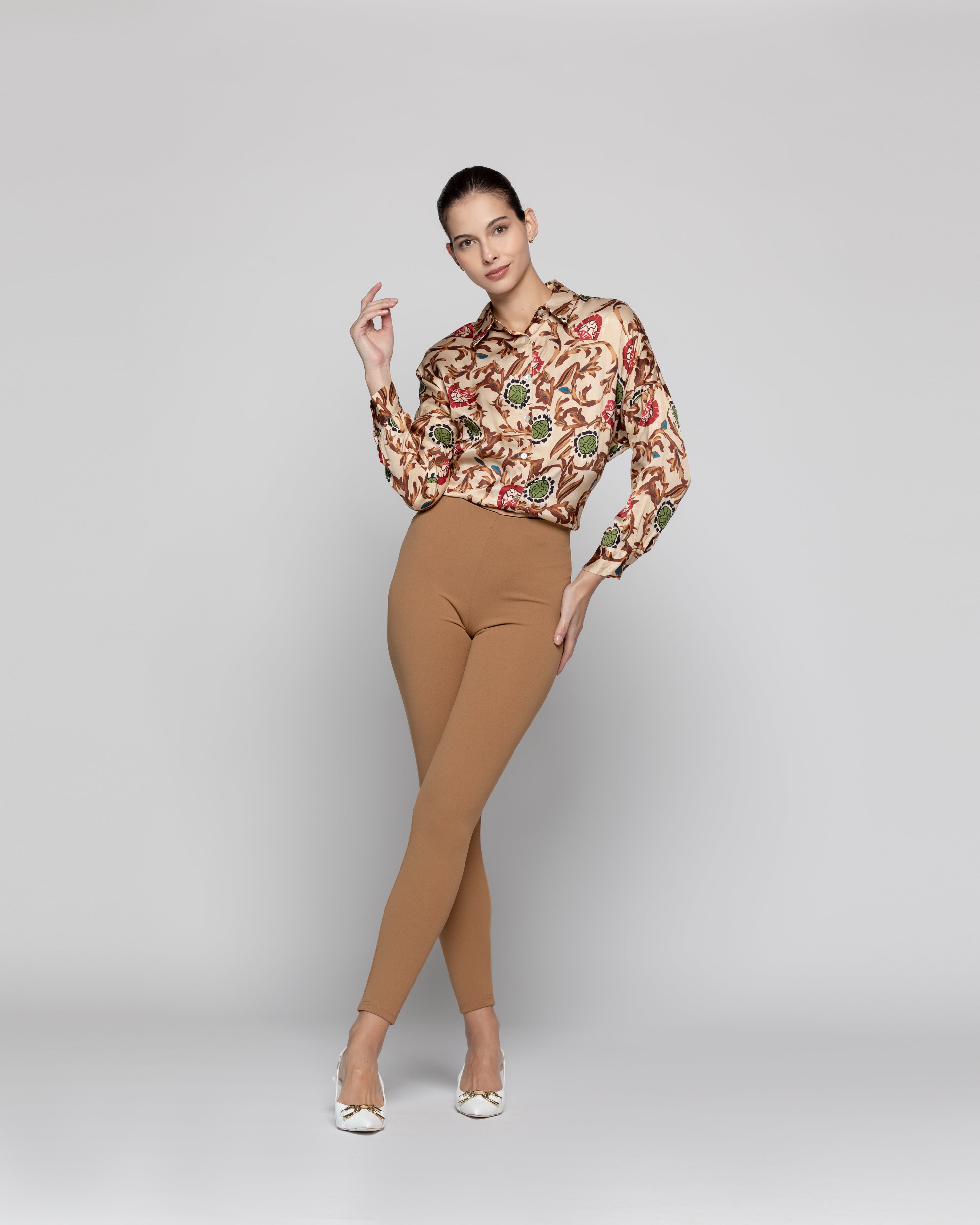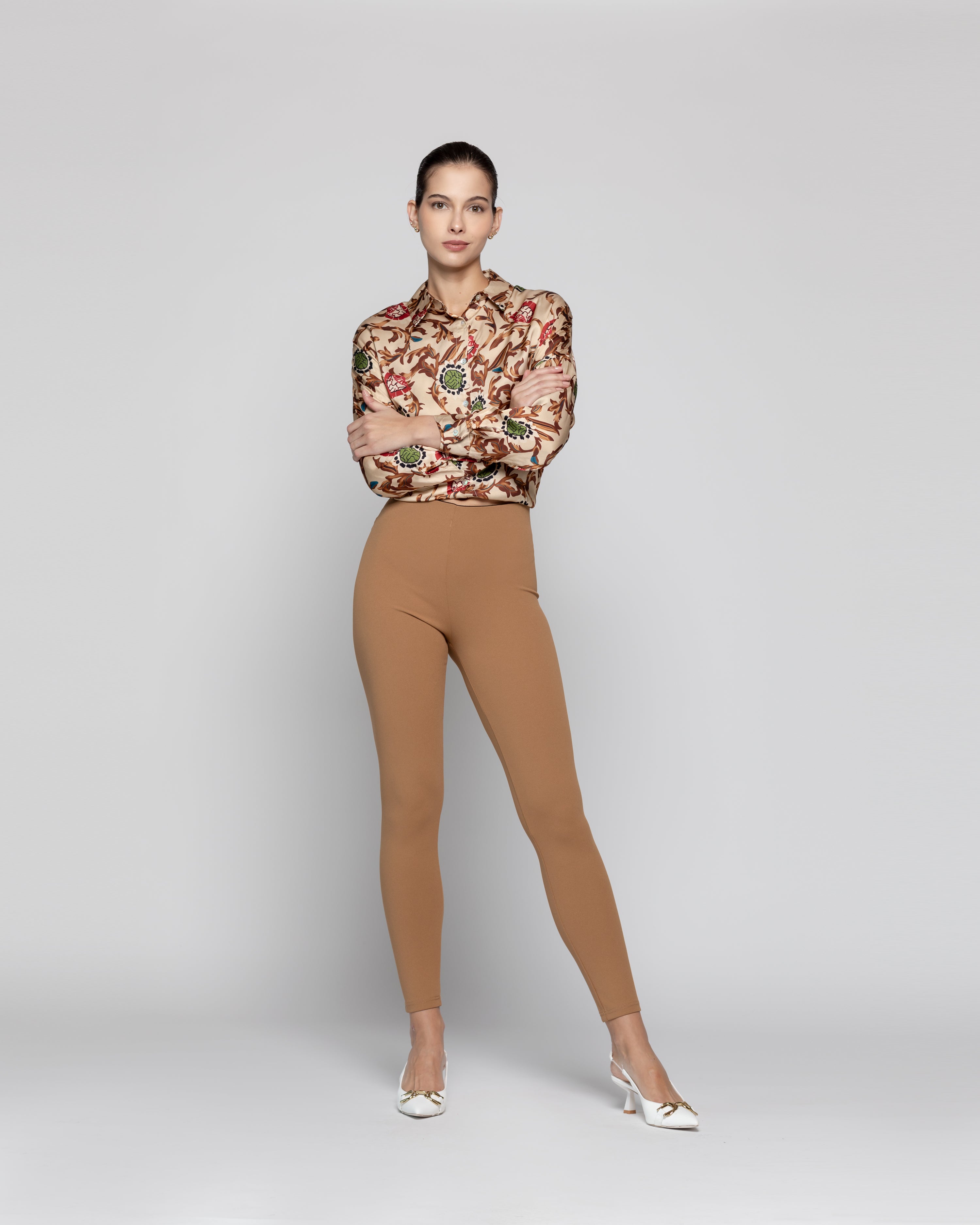 Calza pantalón color café camel. Tela elasticada con ajuste de pretina. Pensada para resaltar en cada salida.