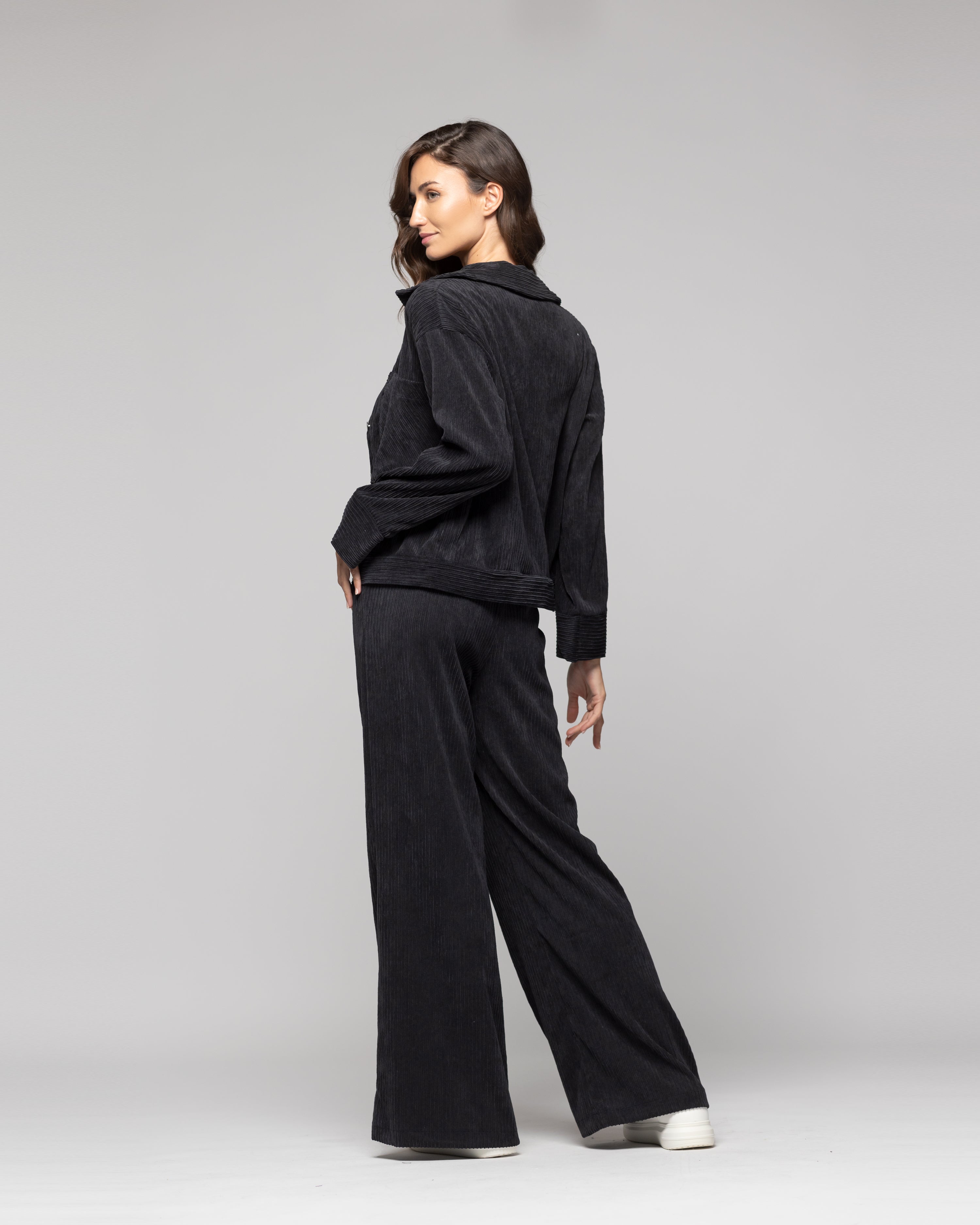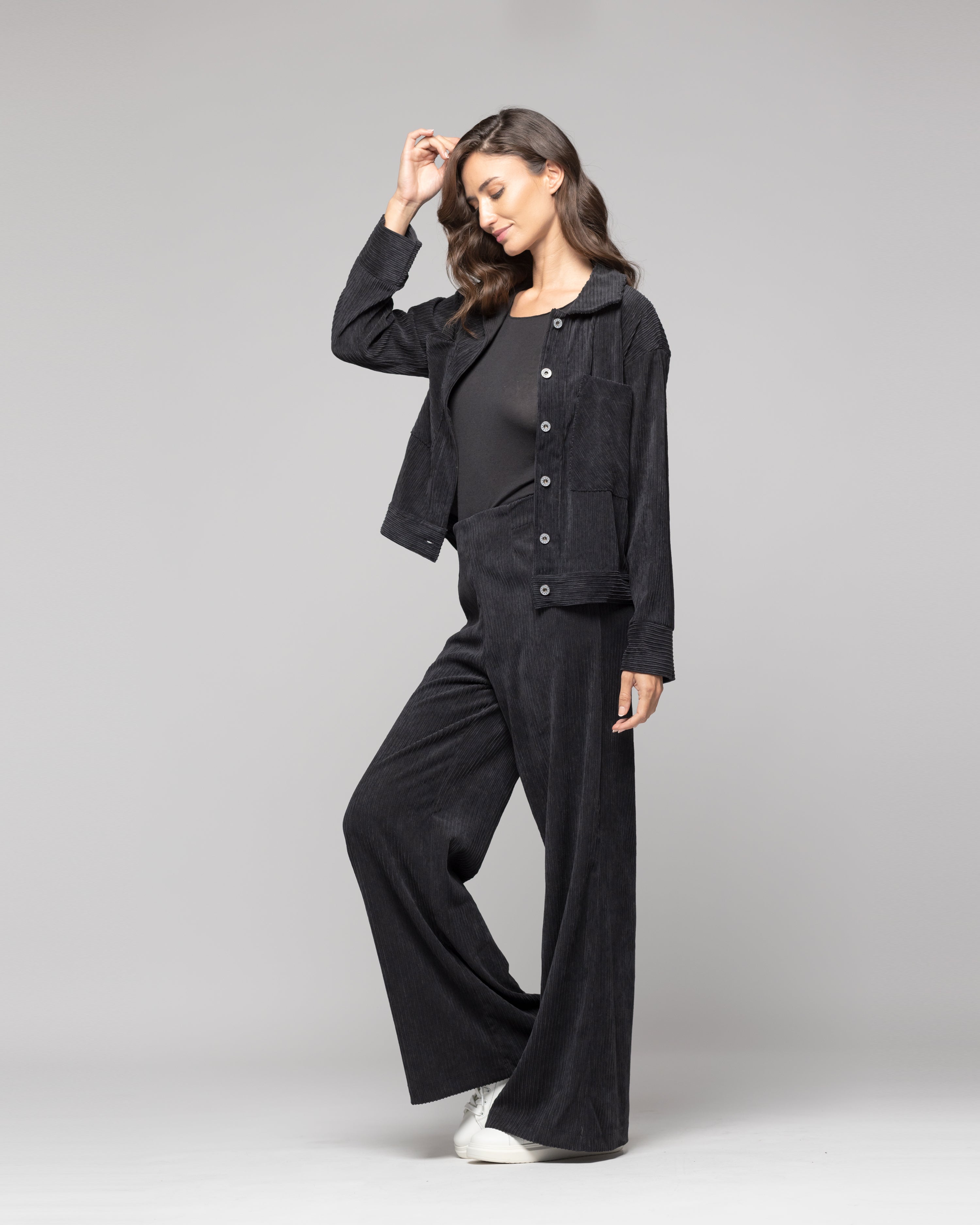 Pantalón tipo palazzo de tiro alto, tela cotelé color negro. Ajuste con elástico. Un básico moderno para quienes saben llevar lo suyo con actitud. Combínalo con la chaqueta del conjunto para obtener un look completo.