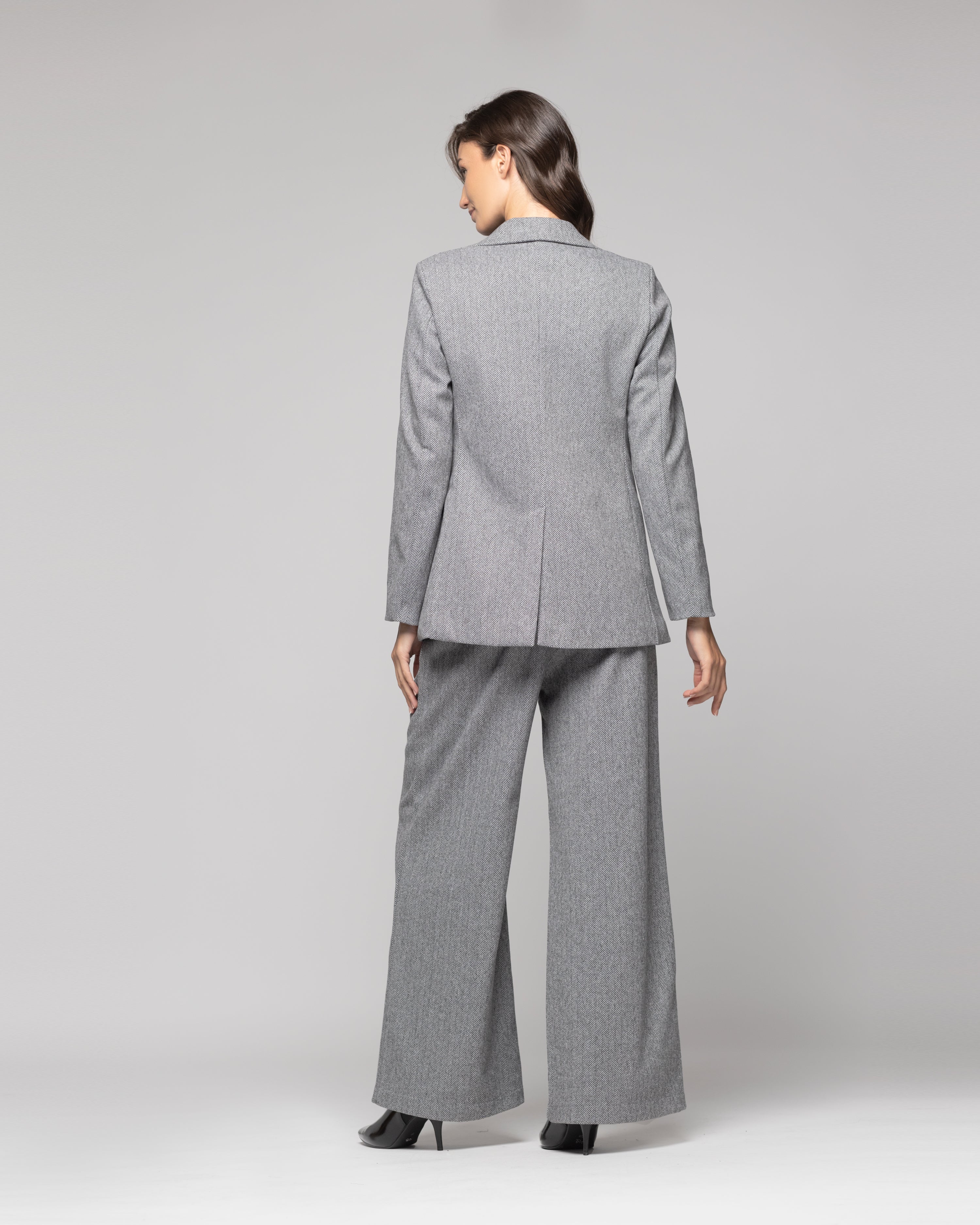 Chaqueta tipo blazer de traje color gris. Calce relaxed fit y cierre de botón. Ideal para complementar conjuntos sofisticados. Completa el look con el conjunto de pantalón.