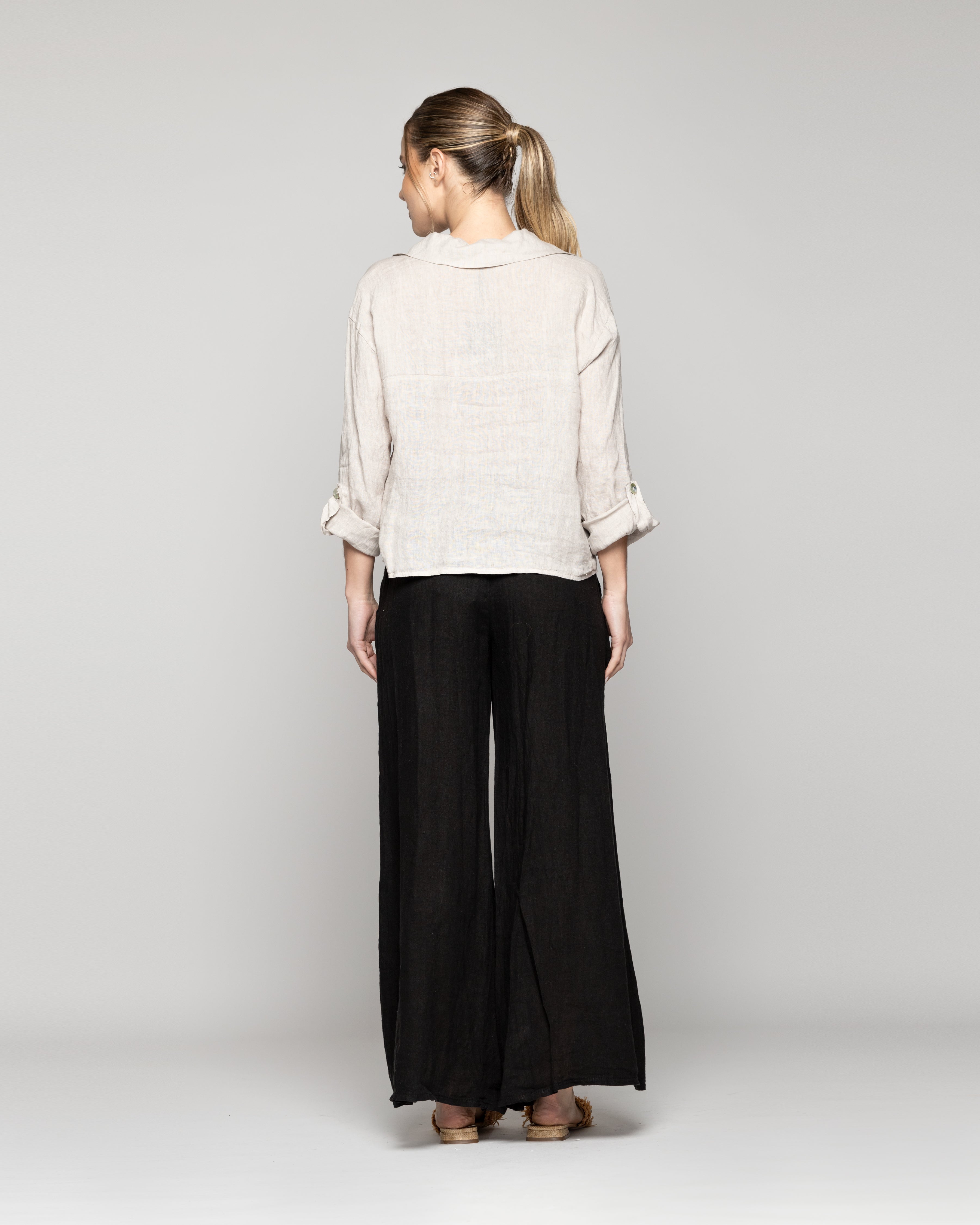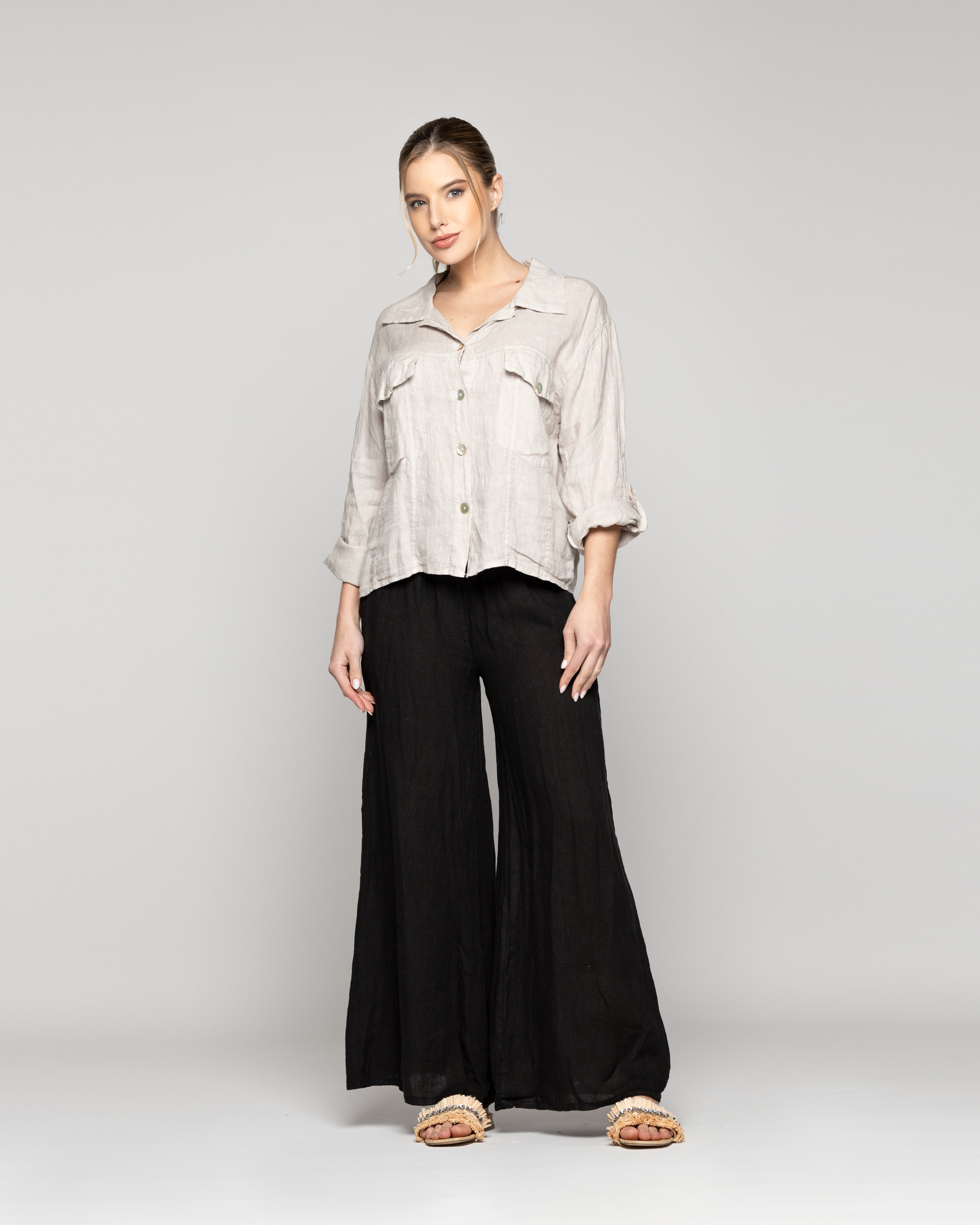 Chaqueta Chiara Lineatre destaca por su estilo relajado y natural. Su diseño es de un color liso beige, que logra un equilibrio entre frescura y sofisticación. De calce recto y cómodo, esta chaqueta cuenta con bolsillos frontales con solapa y mangas largas ajustables con botón. El lino aporta textura, frescura y suavidad, ideal para climas cálidos o para looks casuales con un toque distintivo. Combínala con pantalones de lino a juego o jeans claros para un outfit armónico. De largo hasta la cintura esta prenda es un básico para el verano.