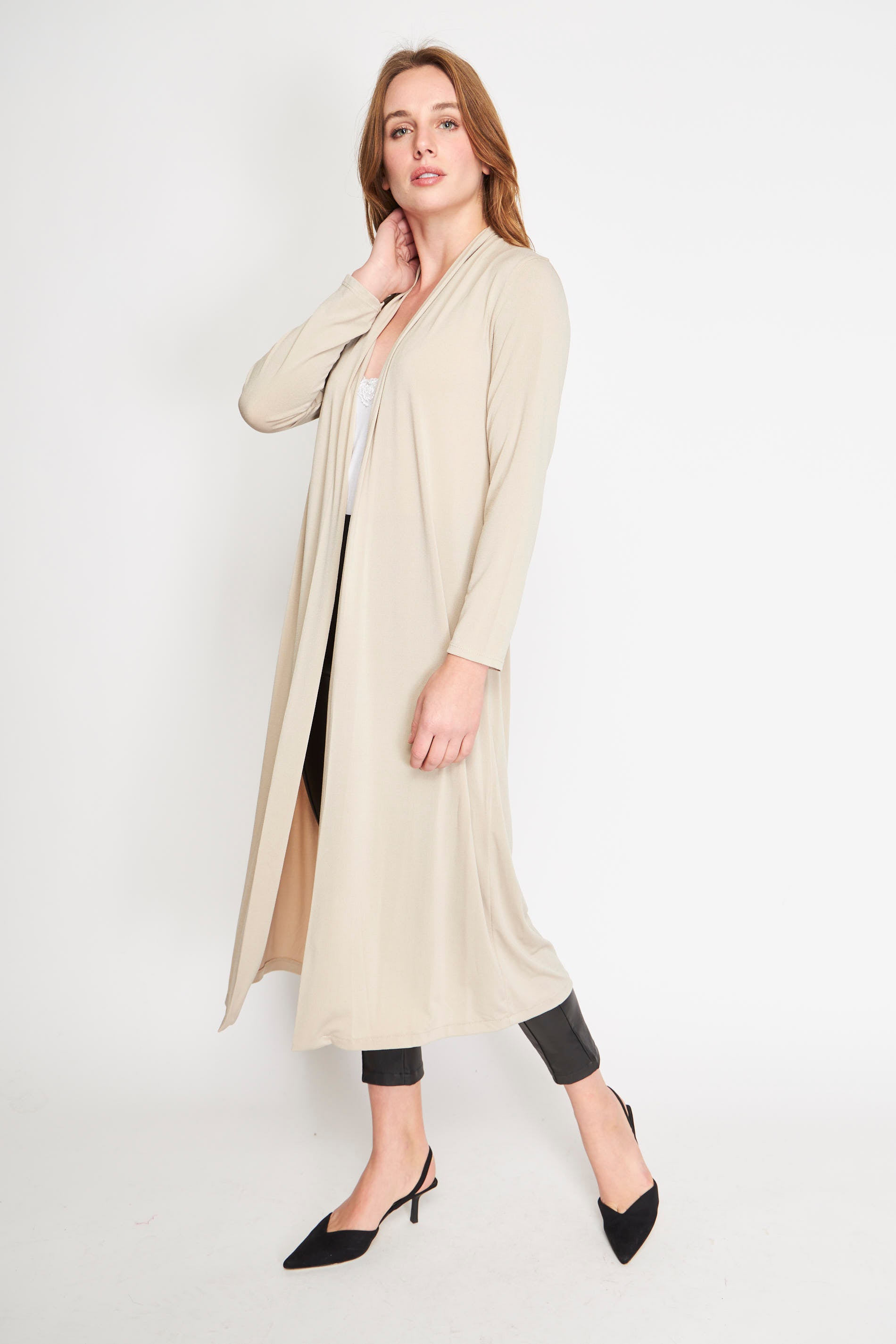 Spolverino largo de manga larga, ideal para un look sofisticado. Úsalo con pantalones ajustados y tacones.