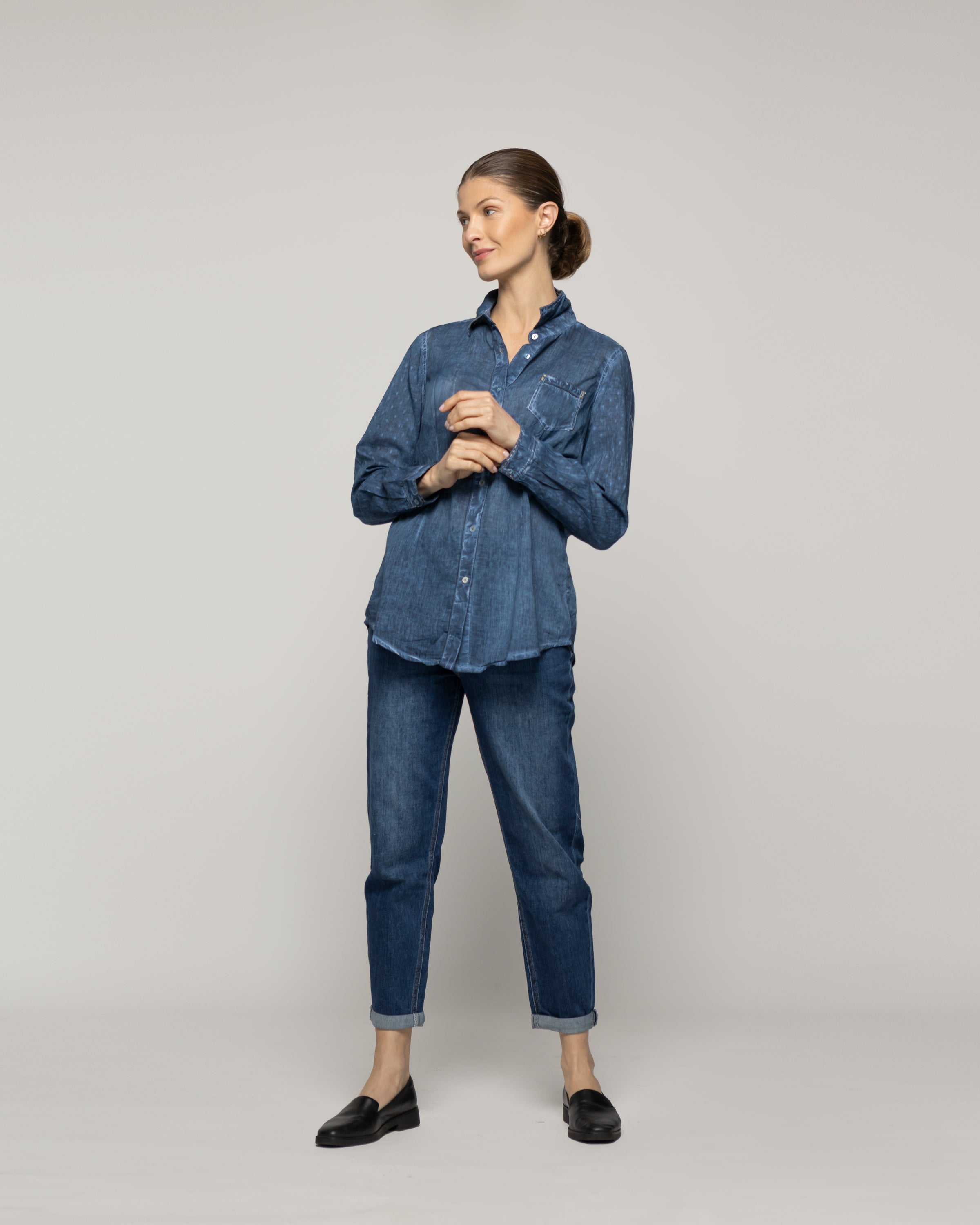 Brisela Lineatre es una reinterpretación moderna de la clásica camisa. Esta prenda está confeccionada en una tela ligera, ideal para usar durante todo el año. Presenta un corte ajustado con caída fluida, mangas largas, cuello camisero y cierre frontal con botones. El bolsillo en el pecho añade un detalle funcional y relajado, mientras que el sutil efecto jaspeado le da un toque visual interesante sin perder versatilidad. Perfecta para looks casuales o semi formales, ya sea abotonada o como sobrecamisa, esta camisa es un básico infaltable para armar capas con estilo y comodidad.