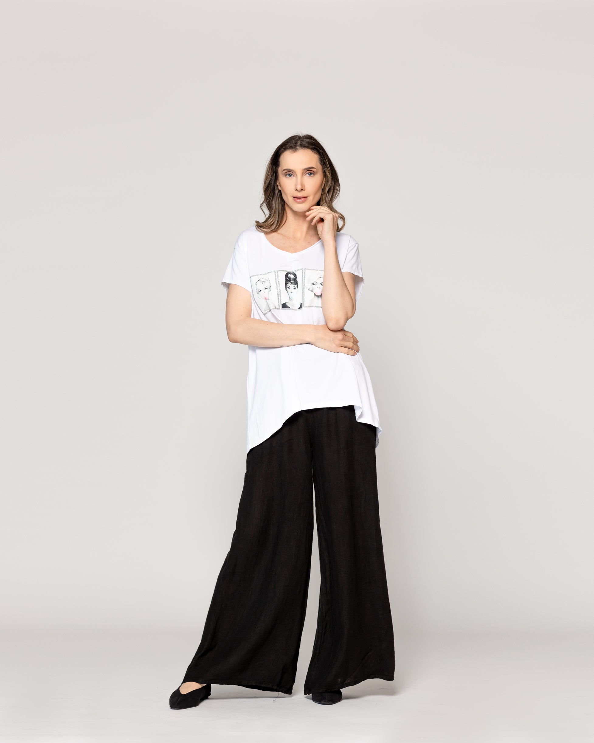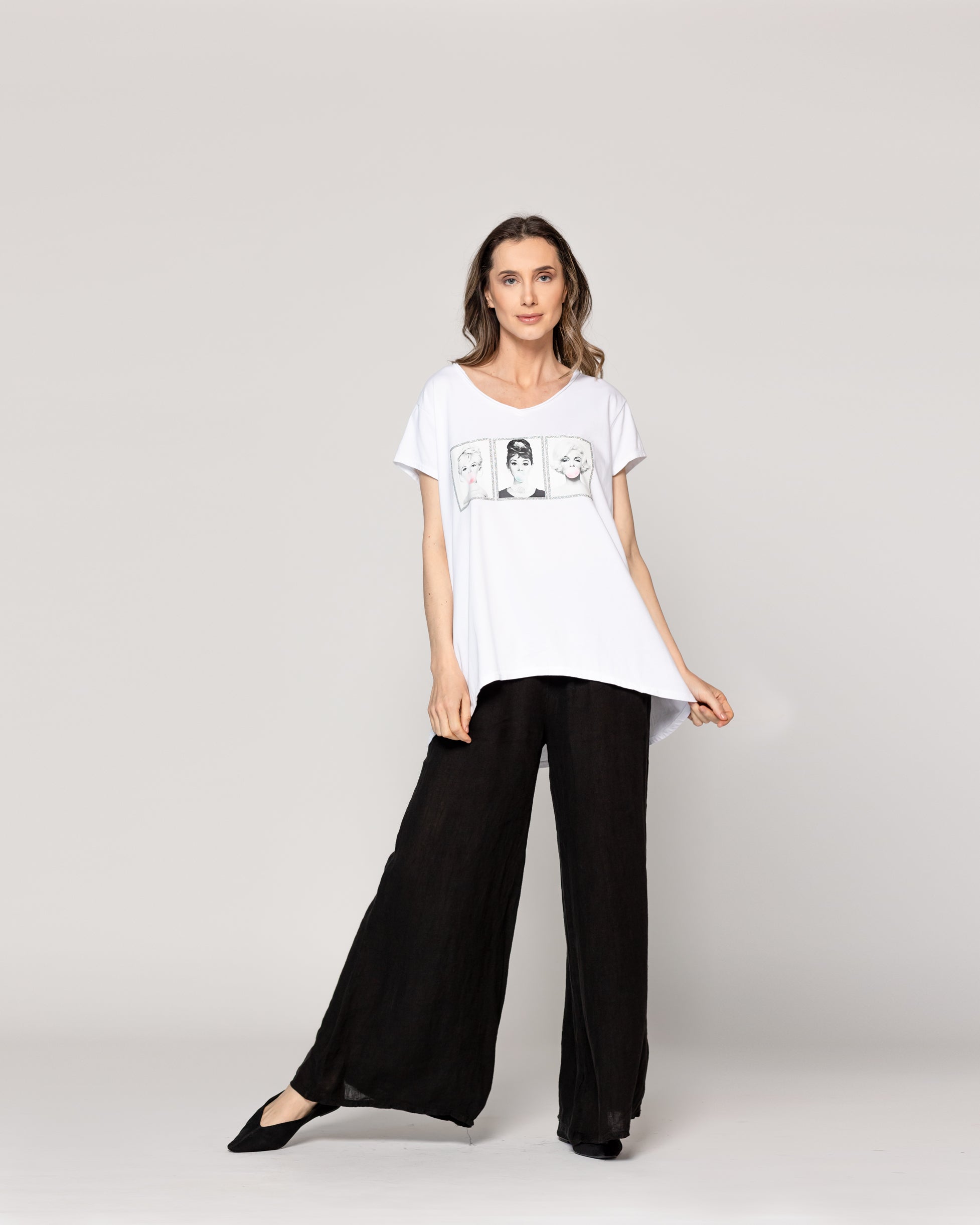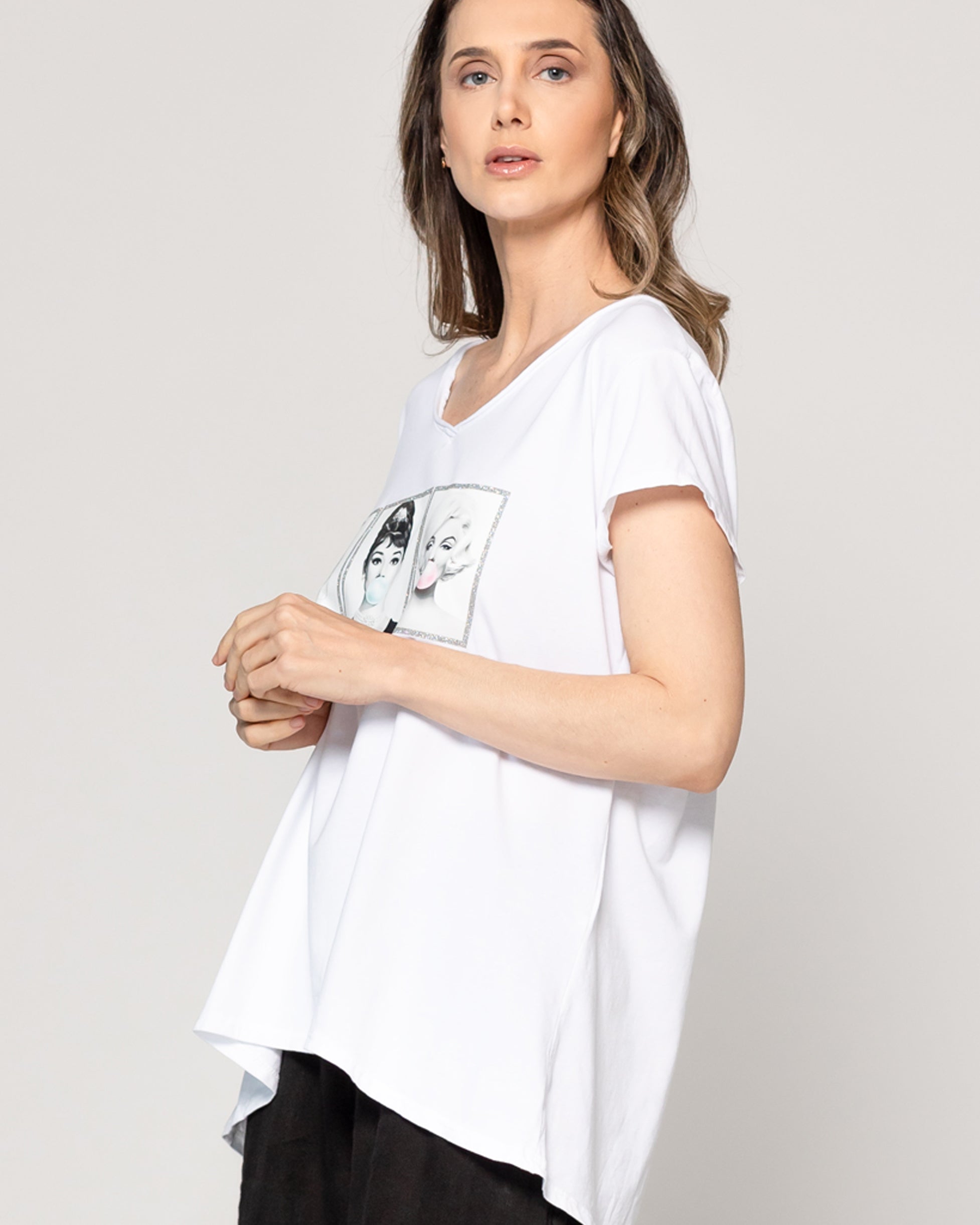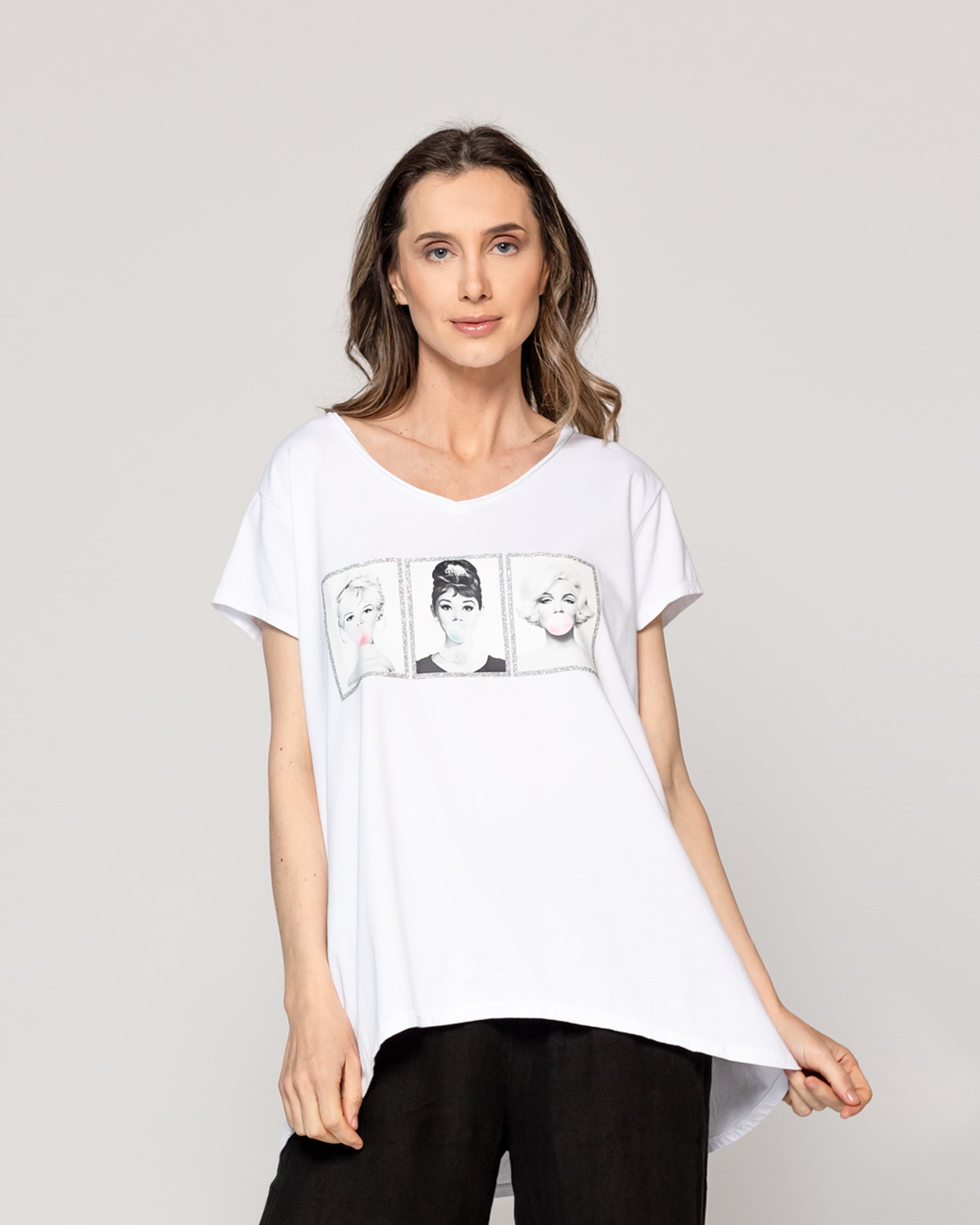 Polera Odelia Lineatre es un modelo oversize con una fusión entre estilo relajado y nostalgia pop. El diseño destaca por su estampado frontal con tres íconos femeninos del cine clásico en blanco y negro, todas masticando goma de mascar rosada, lo que le da un giro divertido y contemporáneo al look. Cada imagen está enmarcada con un borde de glitter plateado que aporta brillo y un toque glam. De calce suelto, cuello redondo y manga corta, esta prenda ofrece comodidad sin sacrificar estilo. Ideal para looks urbanos o casuales con actitud, perfecta para combinar con jeans o leggings y zapatillas. Una prenda con personalidad propia.