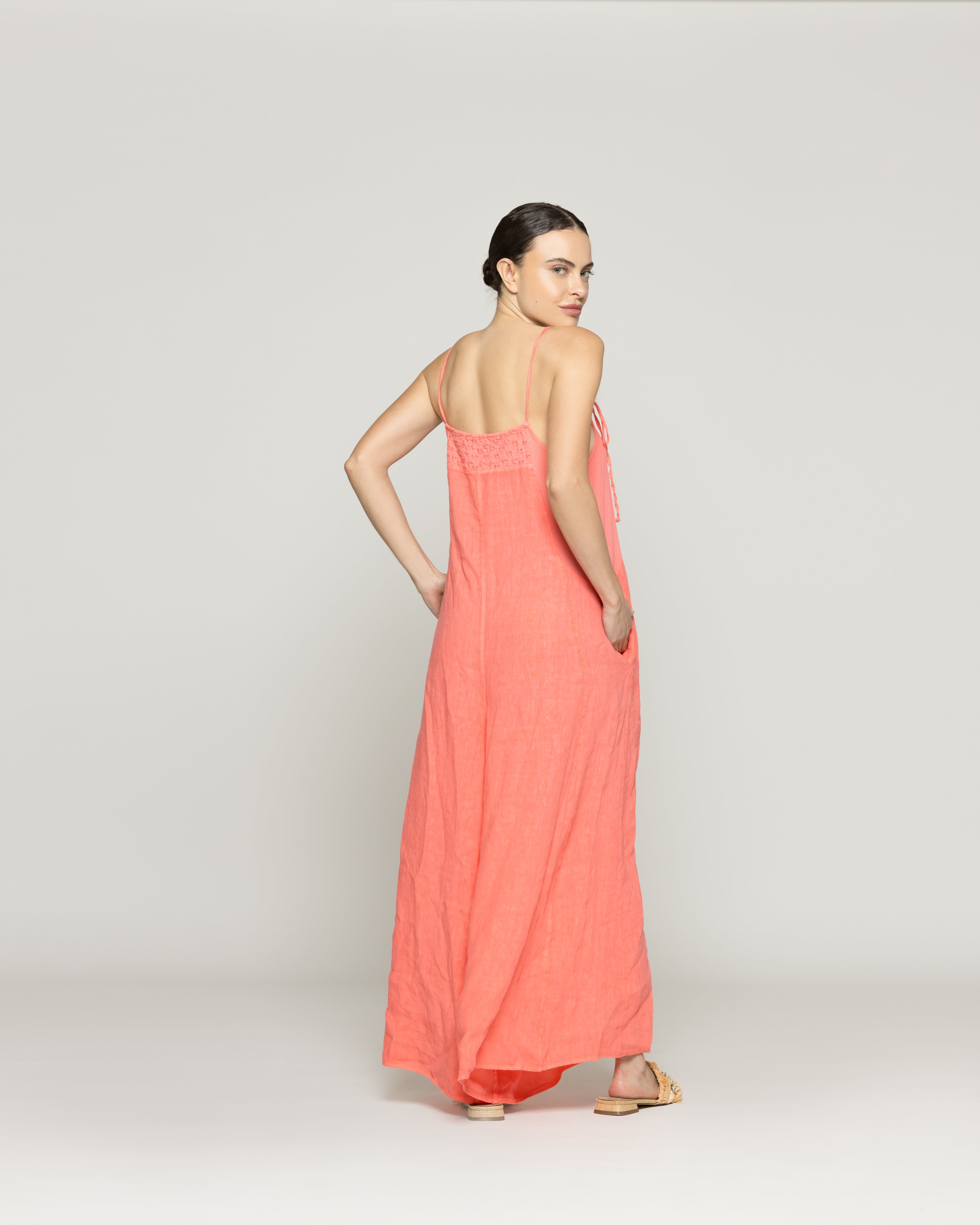Enterito Roxana Lineatre es una propuesta fresca y descomplicada para los días cálidos. Confeccionado 100% en lino, liviano y natural, destaca por su silueta amplia y fluida que brinda movimiento y comodidad. Los tirantes delgados se ajustan con lazo sobre los hombros, permitiendo regular el calce. Su escote recto y bolsillos laterales aportan un aire relajado y funcional. El tono coral vibrante añade un toque alegre y femenino, ideal para paseos, vacaciones o eventos al aire libre. Combínalo con sandalias planas o alpargatas y disfruta de su versatilidad sin esfuerzo.
