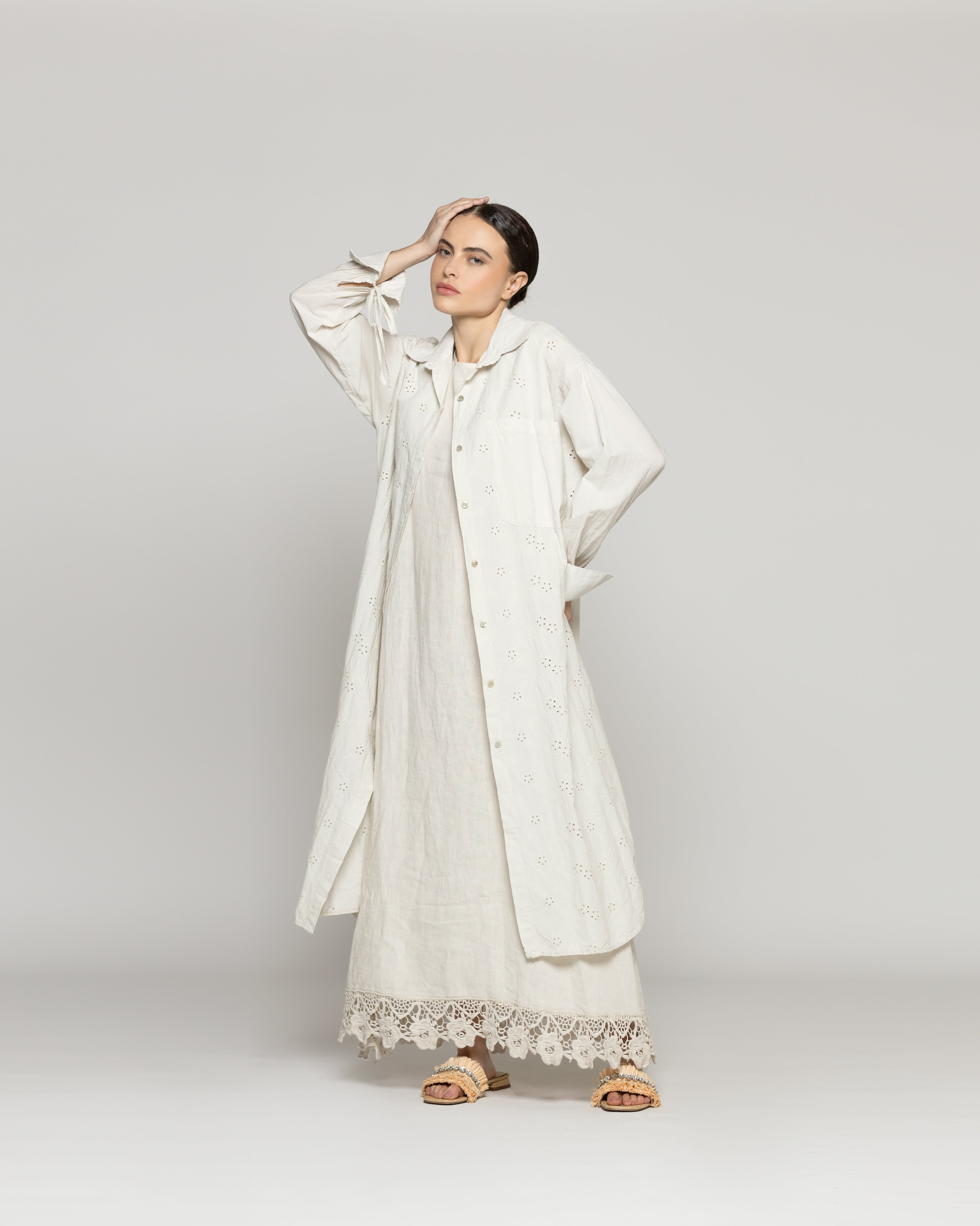 Dianella Lineatre es una prenda versátil y femenina. Su diseño largo y amplio destaca por los delicados bordados en forma de pequeñas flores, que le dan un aire romántico y artesanal. Cuenta con cuello clásico, manga larga con puño abotonado, bolsillos frontales y cierre frontal con botones ocultos. Puedes cerrarlo para un look más definido o llevarla suelta para un estilo relajado. Combínalo con su vestido del mismo color o también es perfecta para complementar looks pantalones de lino, esta pieza aporta frescura y elegancia con el sello distintivo de Lineatre.