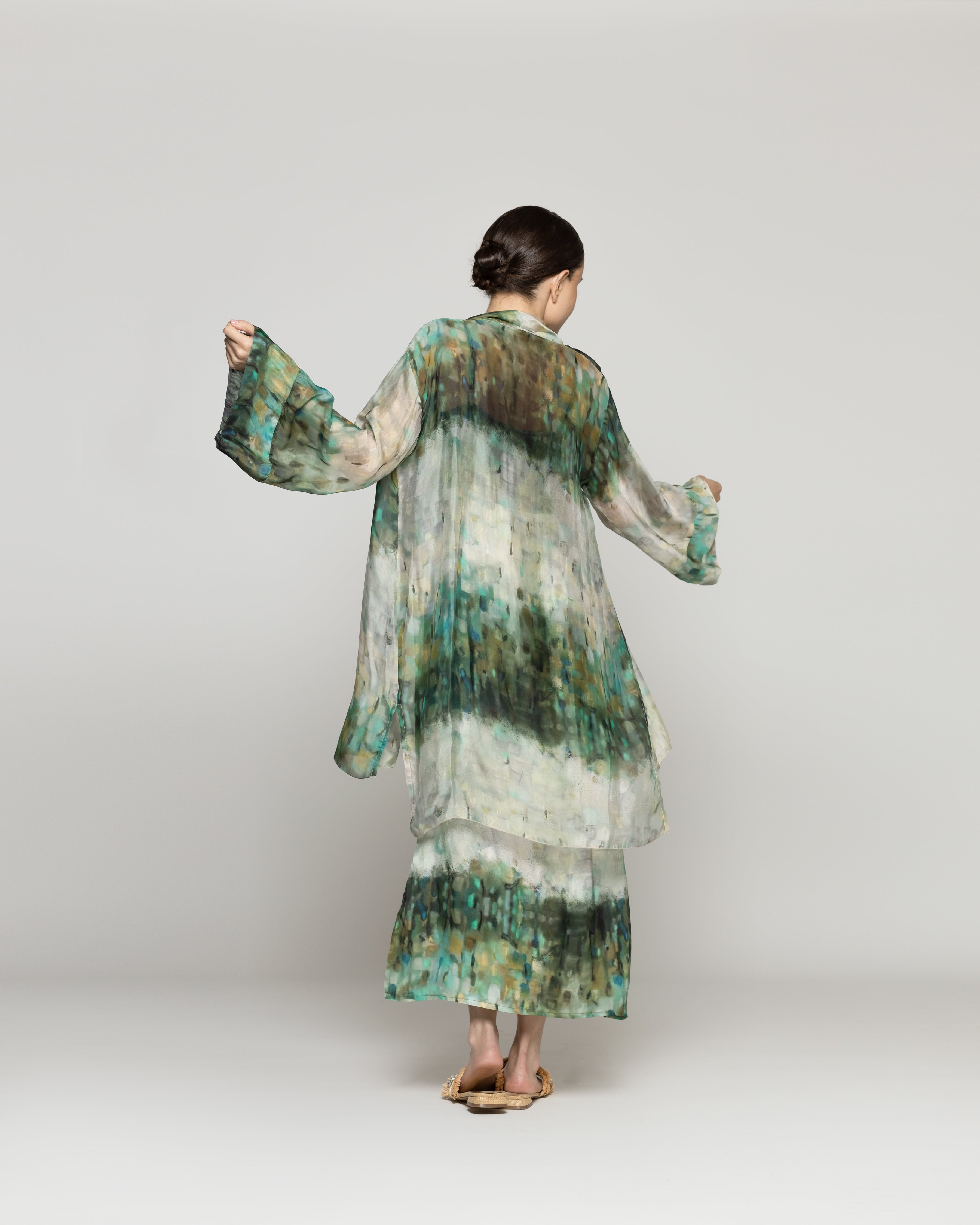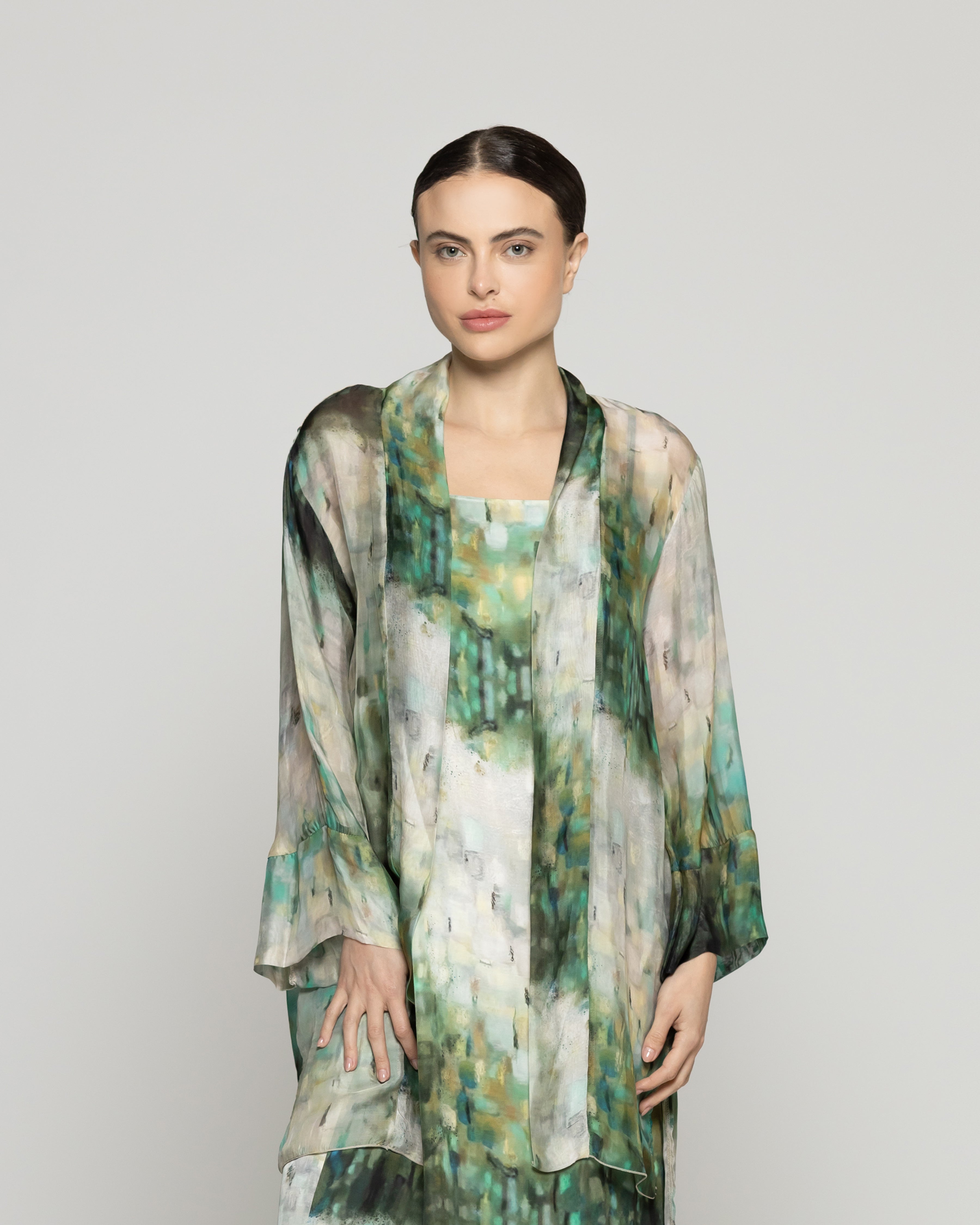 Dafne es un spolverino Lineatre que combina estilo y comodidad con un aire sofisticado. Un tapado con diseño abstracto y transparencia. Su diseño liviano y fluido lo convierte en una prenda perfecta para capas ligeras durante la temporada. Ideal para complementar atuendos de día o elevar un look sencillo, su confección cuida cada detalle para ofrecer una caída elegante y natural. Lo puedes combinar con pantalones de lino o jeans rectos. La viscosa aporta fluidez y frescura, mientras la seda suma un brillo sutil y una sensación delicada sobre la piel. Una prenda ligera, elegante y envolvente.