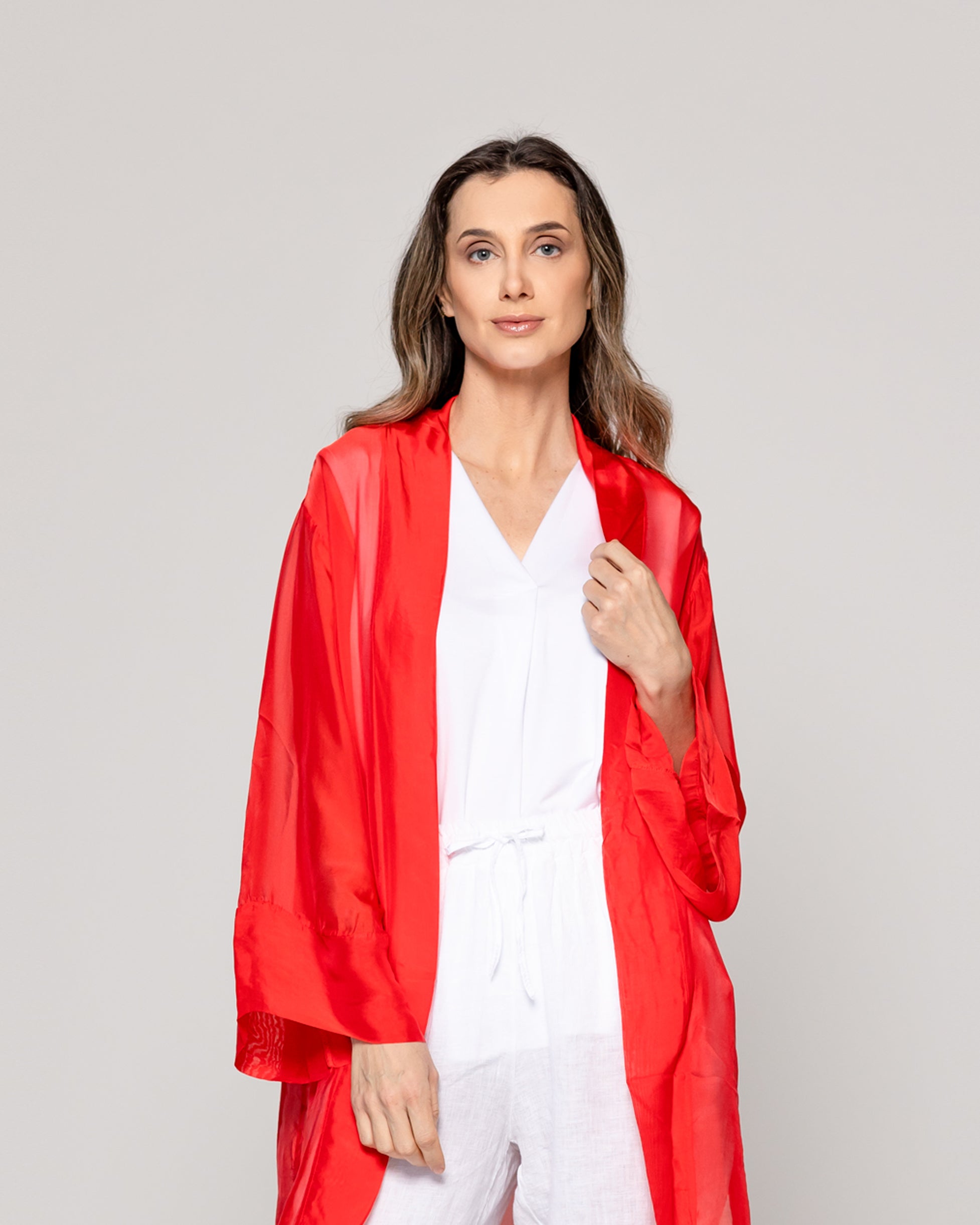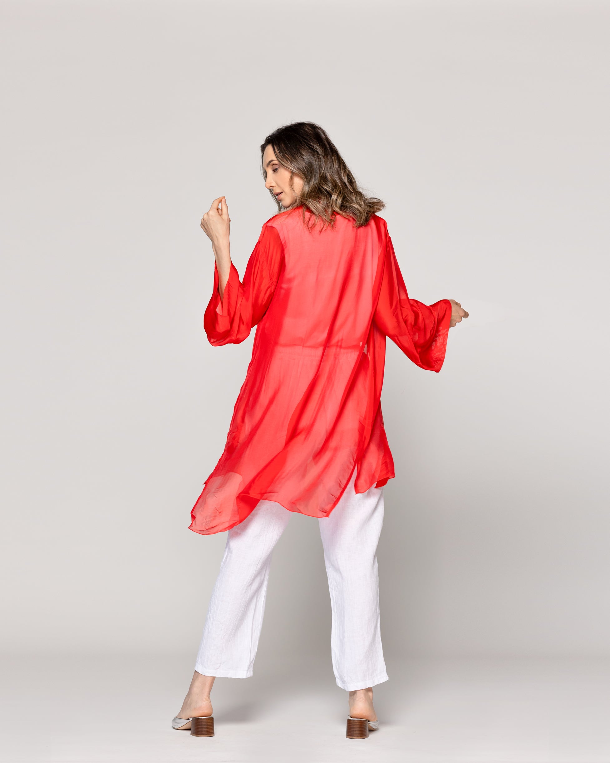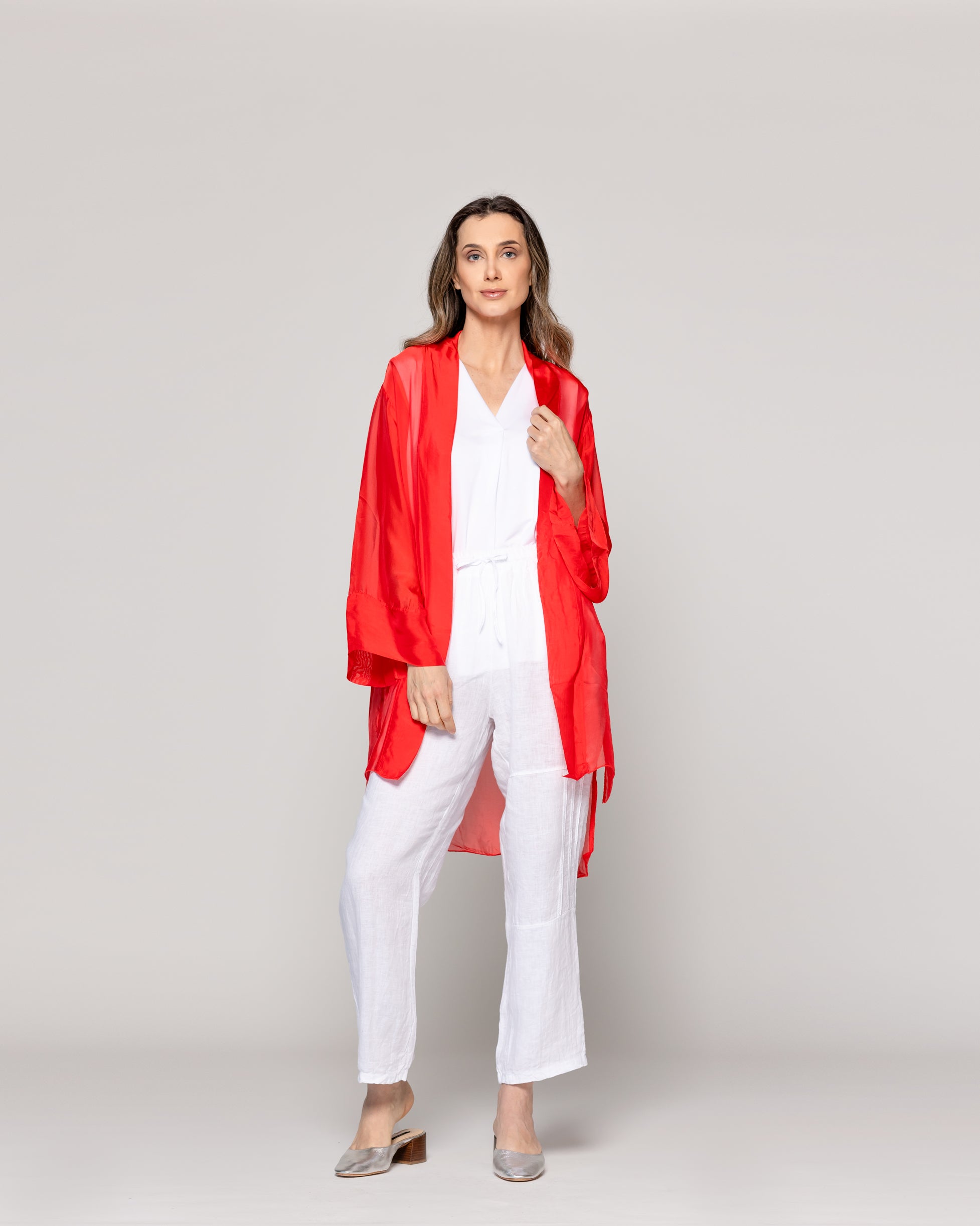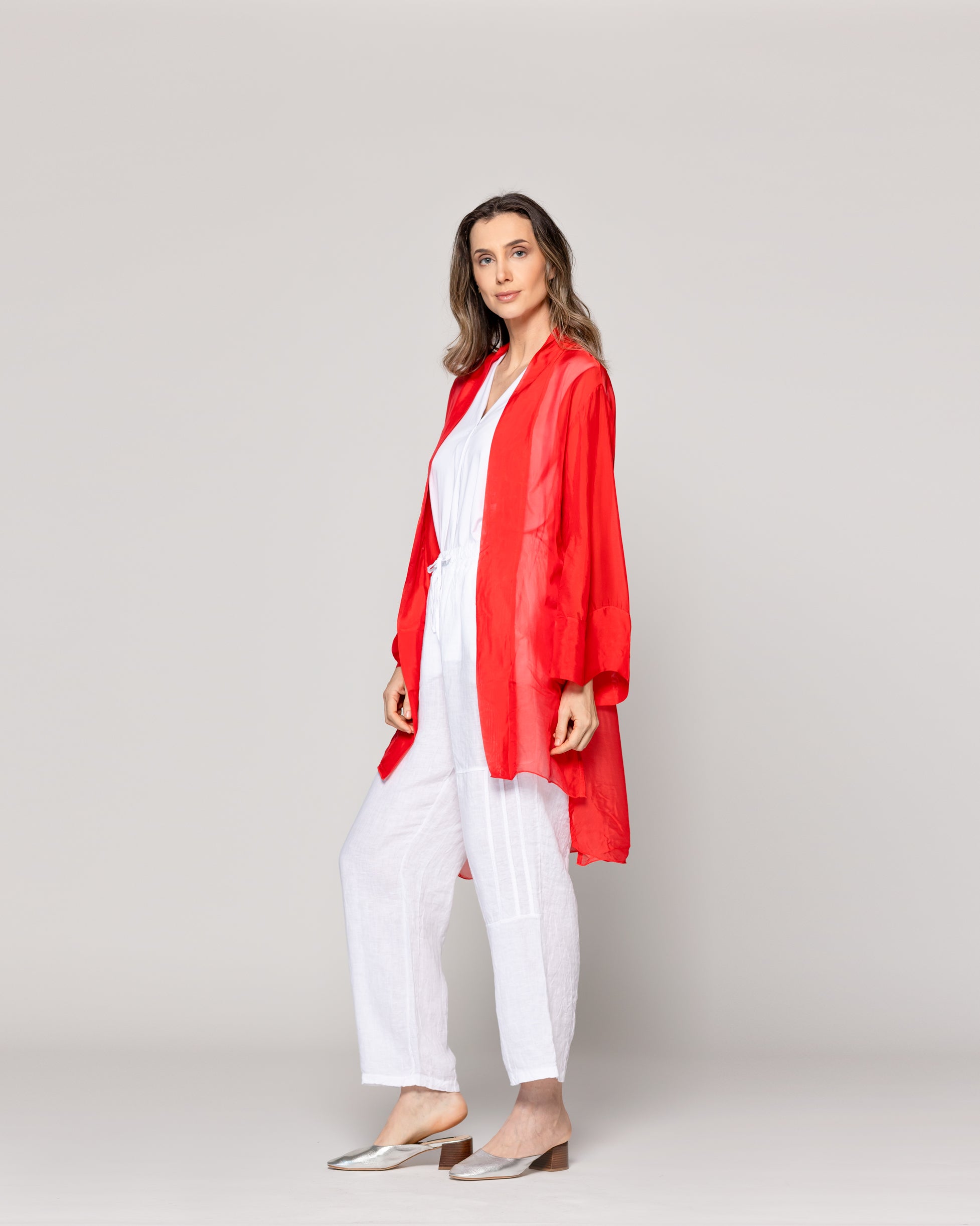 Diana es un spolverino Lineatre que combina estilo y comodidad con un aire sofisticado. Un tapado de un solo tono y transparencia. Su diseño liviano y fluido lo convierte en una prenda perfecta para capas ligeras durante la temporada. Ideal para complementar atuendos de día o elevar un look sencillo, su confección cuida cada detalle para ofrecer una caída elegante y natural. Lo puedes combinar con pantalones de lino, jeans rectos o vestidos elegantes de la misma textura. La viscosa aporta fluidez y frescura, mientras la seda suma un brillo sutil y una sensación delicada sobre la piel. Una prenda ligera, elegante y envolvente.