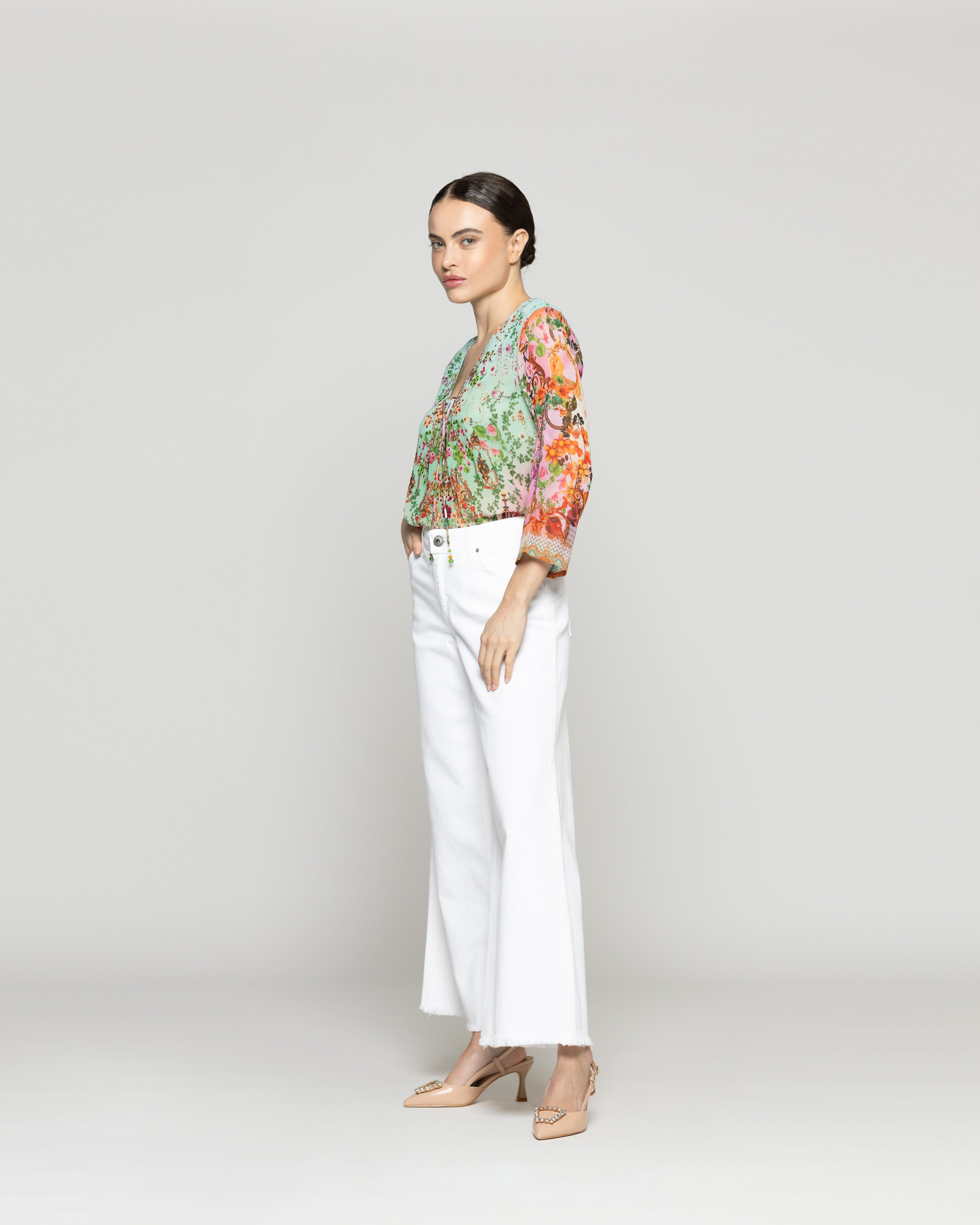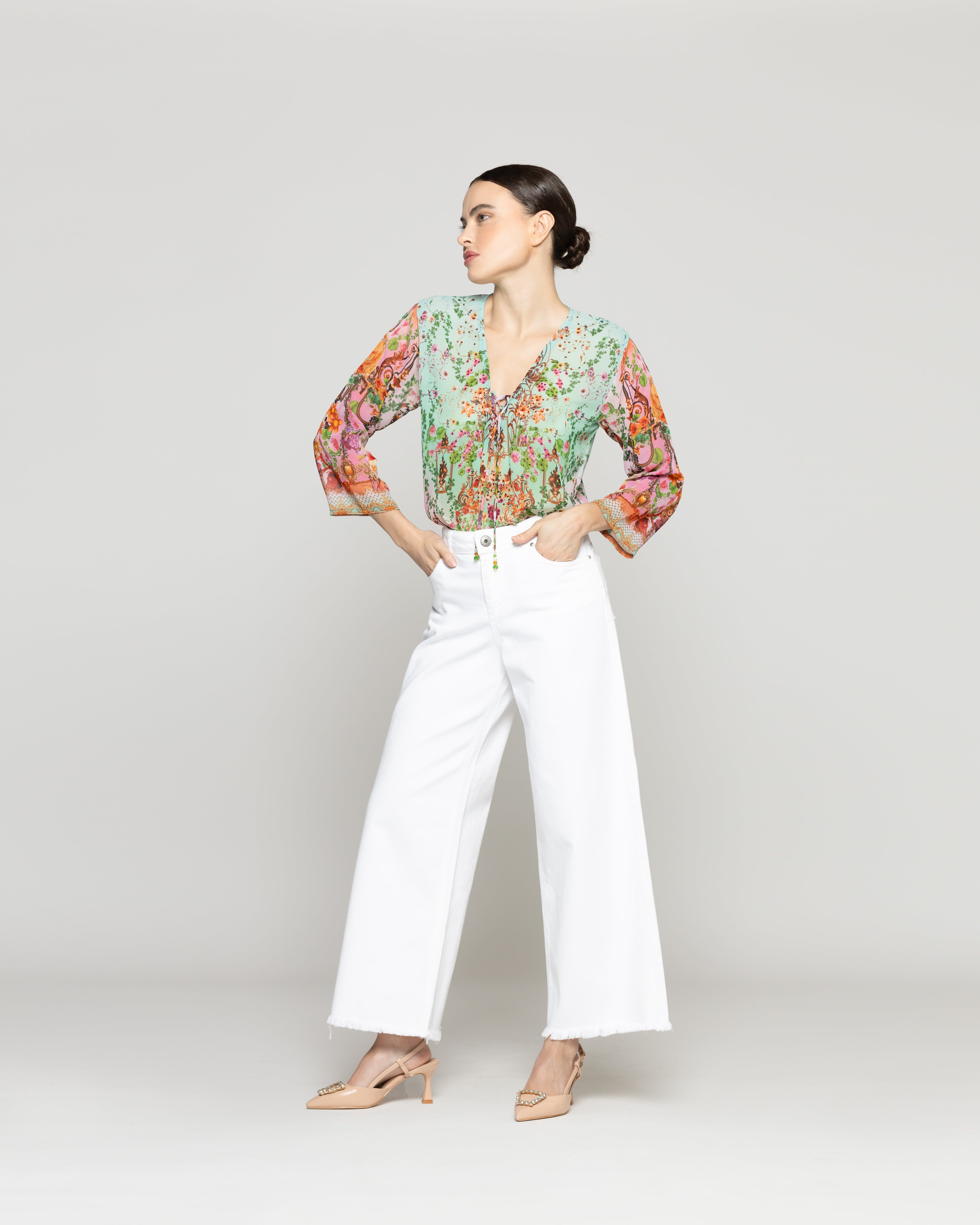 Julia Lineatre es un jeans de tipo wide leg. Su silueta amplia y de calce relajado aporta un estilo contemporáneo y cómodo, ideal para la temporada primavera-verano. Este pantalón es versátil y favorecedor para varios tipos de cuerpo ya que crea una silueta equilibrada. El diseño incluye tiro medio, cierre con botón metálico y detalles de terminación deshilachada en la basta, que suman un toque moderno. Confeccionado en algodón con un leve stretch, garantiza suavidad y libertad de movimiento. Perfecto para combinar con blusas coloridas, tops estampados o camisas de lino para un look fresco y versátil que funciona de día o de noche.