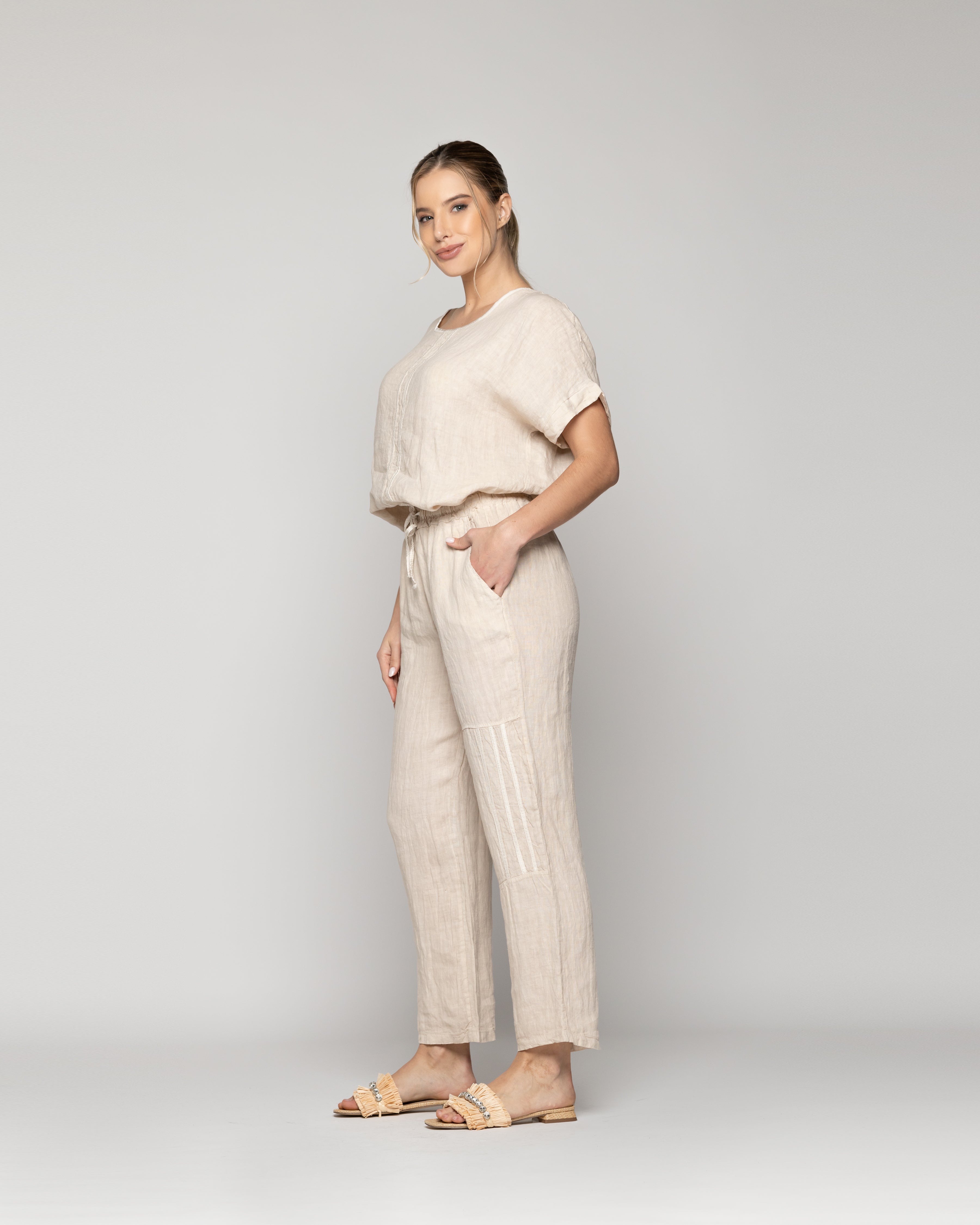 Pantalón Bianca Lineatre confeccionado es ideal para quienes buscan frescura y estilo durante los días más cálidos. Su diseño relajado con pretina elasticada y amarra ajustable en la cintura proporciona comodidad sin perder elegancia. El detalle acanalado en la parte inferior de las piernas agrega textura y un sutil toque artesanal. Su calce recto ligeramente entallado en los tobillos estiliza la silueta y lo convierte en una prenda versátil para looks casuales o más sofisticados. Combínalo con su blusa conjunto o camisas oversize para un outfit moderno.