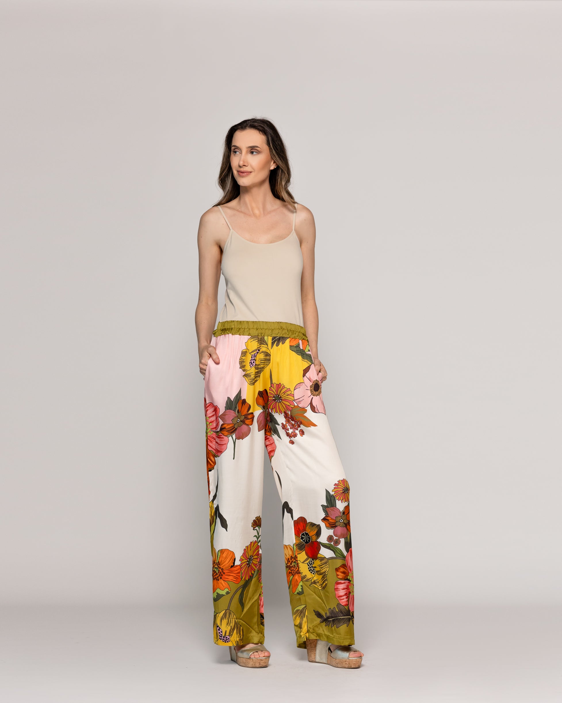 Pantalón Mujer Brenna Satinado Estampado Flores Verde Militar Lineatre