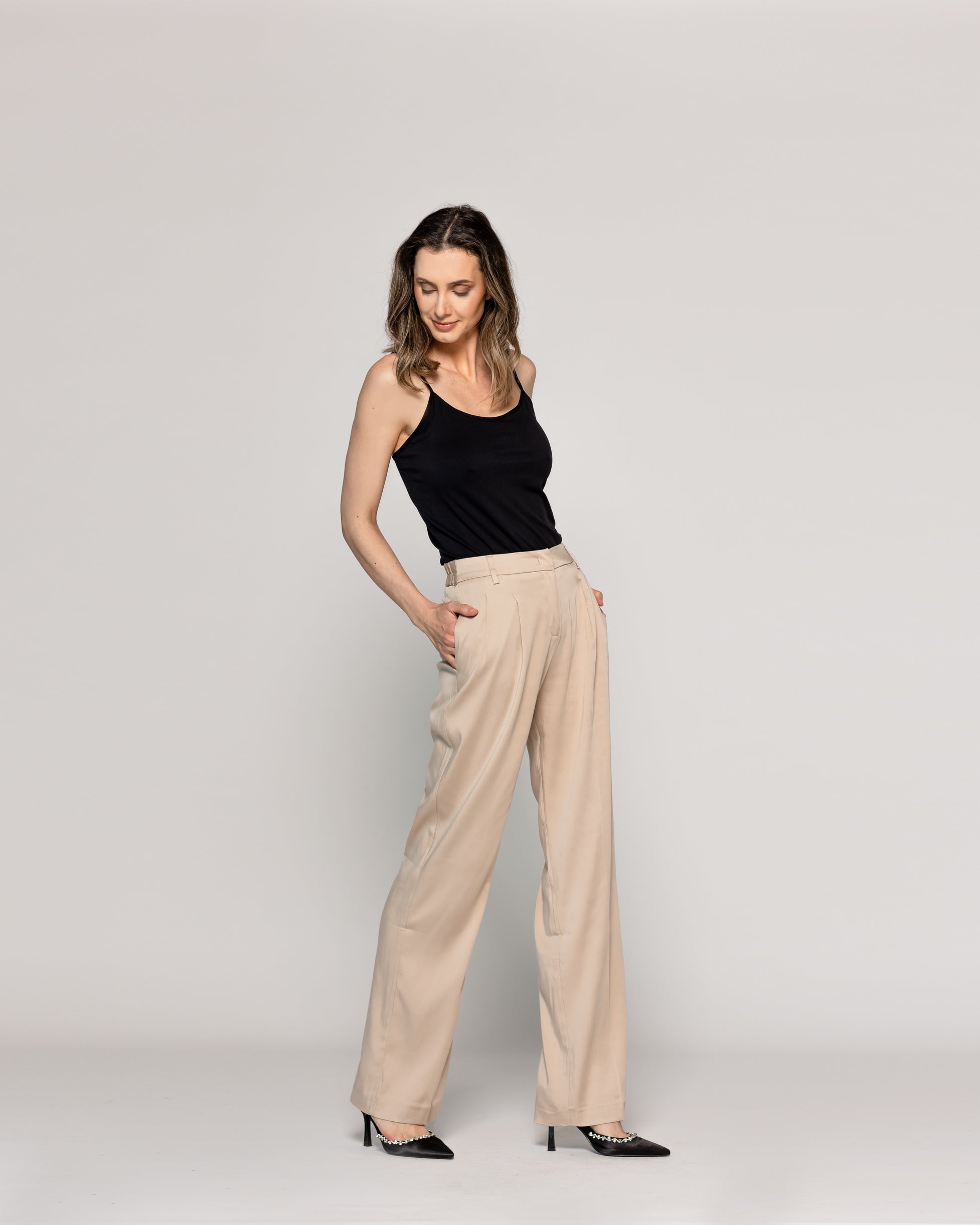 Pantalón Clarissa Lineatre es un básico infaltable con sello de sofisticación. De calce sastrero y pierna ancha, este diseño destaca por su estructura elegante y detalles pulidos como las pinzas frontales, bolsillos laterales y presillas para cinturón. Confeccionado en una tela firme pero con buena caída, logra una silueta fluida sin perder formalidad. Ideal para looks ejecutivos o combinaciones más relajadas con camisas oversize o blusas satinadas. El color neutro lo convierte en un comodín atemporal y versátil para toda temporada. Cuenta con chaqueta para completar el conjunto.