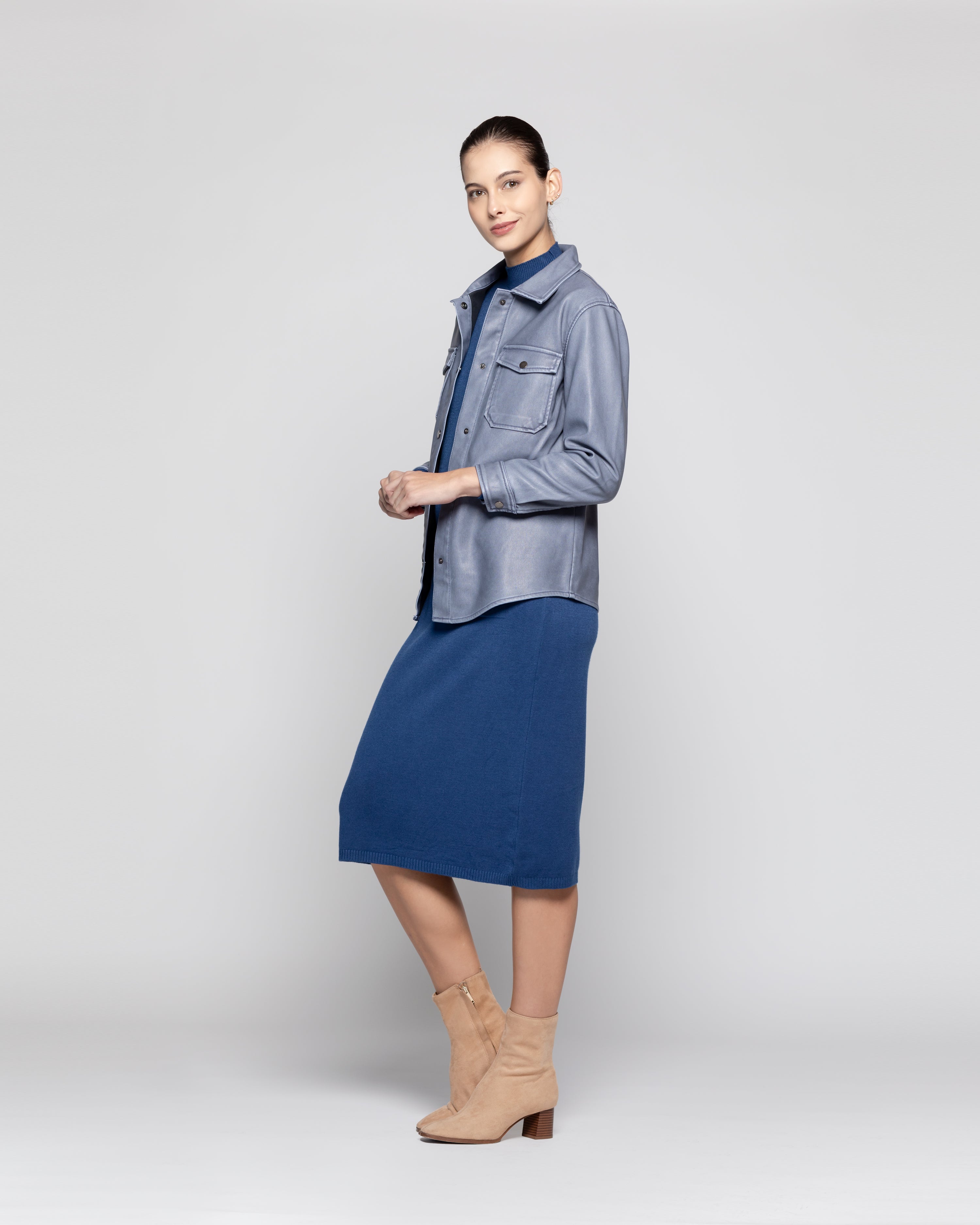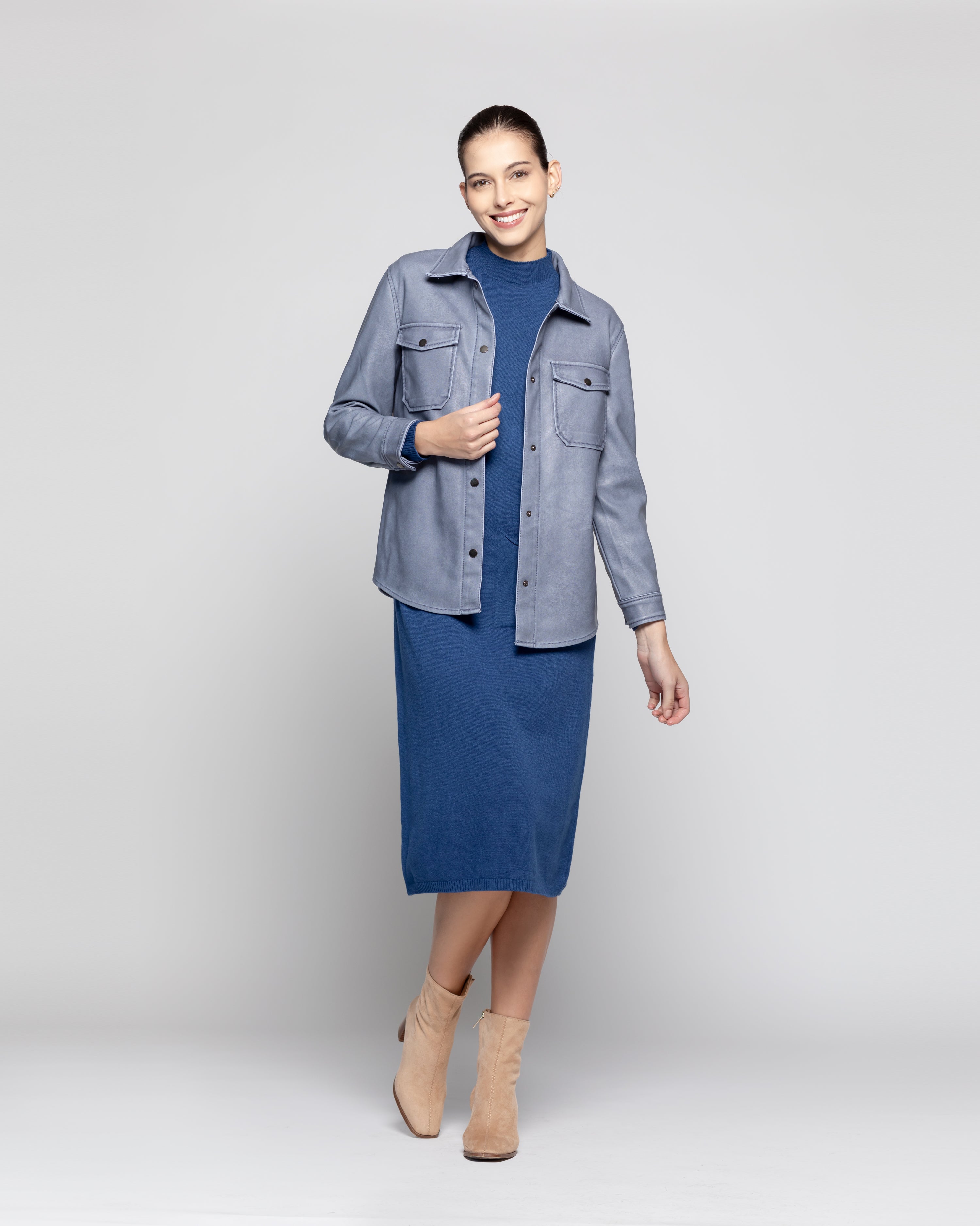Camisa azul grisaceo de cuero sintético con calce relaxed fit , puño con botones y ajuste de broche. Perfecta para días dinámicos con impronta personal.