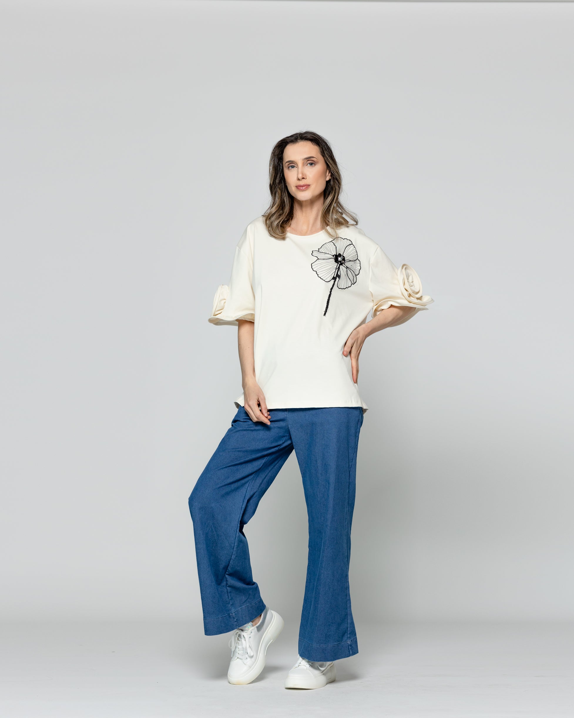 Polera Olenka Lineatre es una prenda de silueta amplia y estilo oversize, confeccionada en una tela ligera de algodón y que otorga frescura y movimiento. Su diseño destaca por una flor bordada con aplicaciones de piedras, creando un contraste llamativo y artístico. Con escote redondo y mangas caídas de largo medio con vuelos, esta prenda es perfecta para usar suelta o con un cinturón marcando la cintura. Ideal para quienes buscan una prenda original y cómoda que combine diseño y libertad. Llévala con jeans, pantalones sastre o incluso sobre un vestido para elevar cualquier look con personalidad y color.