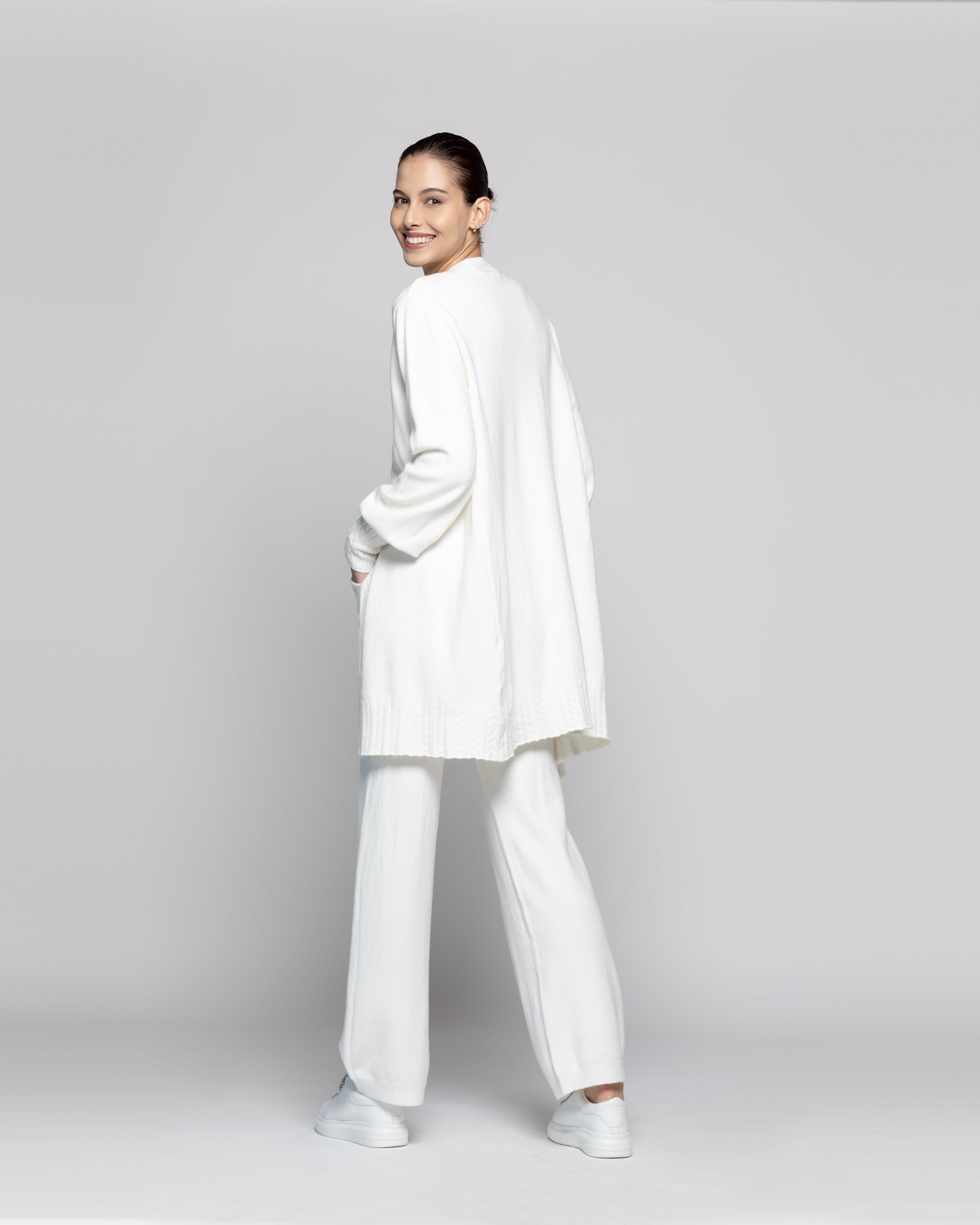 Cardigan color blanco y ajuste cruzado. Detalle tejido trenzado en los bordes y puños. Pensada para resaltar en cada salida.
