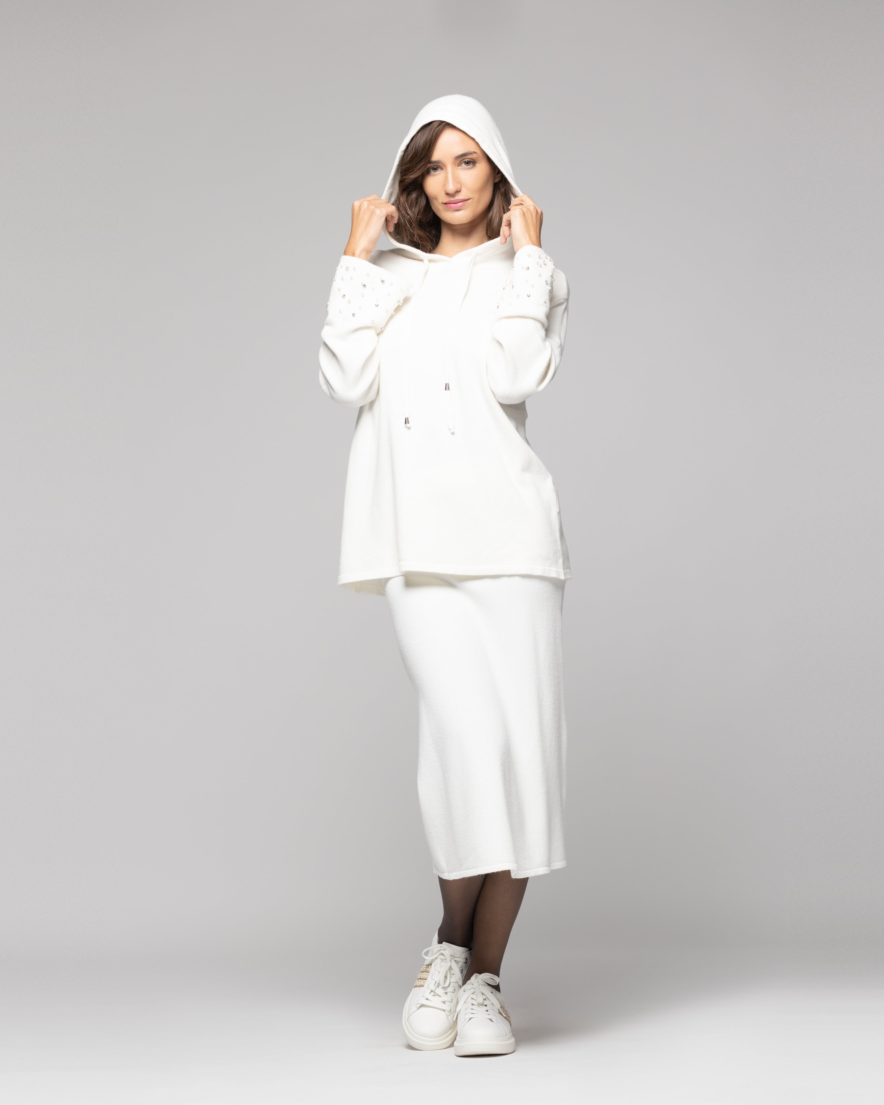 Sweater color blanco con gorro ajustable y detalle de perlas en los puños. Una pieza clave que transforma tu outfit.