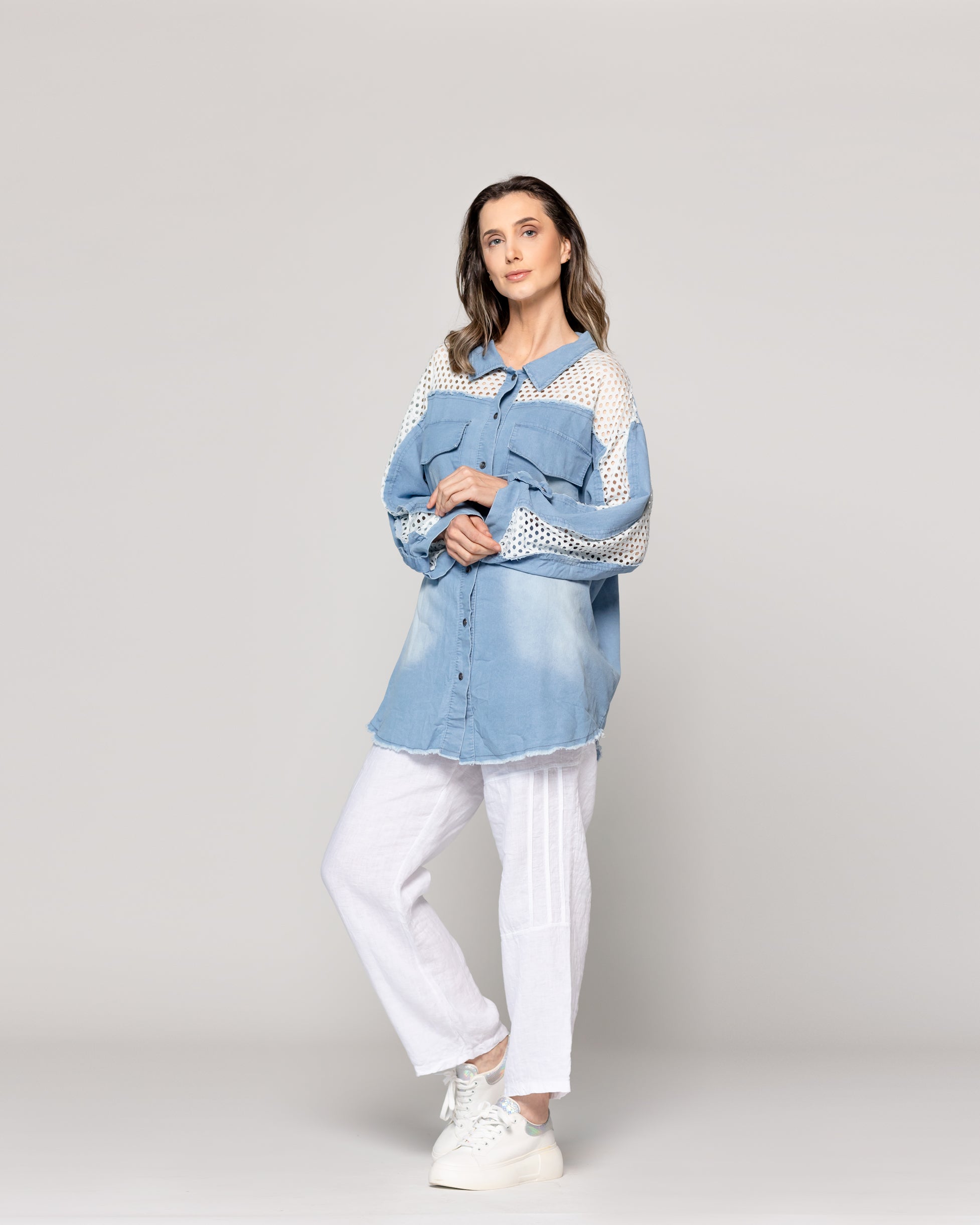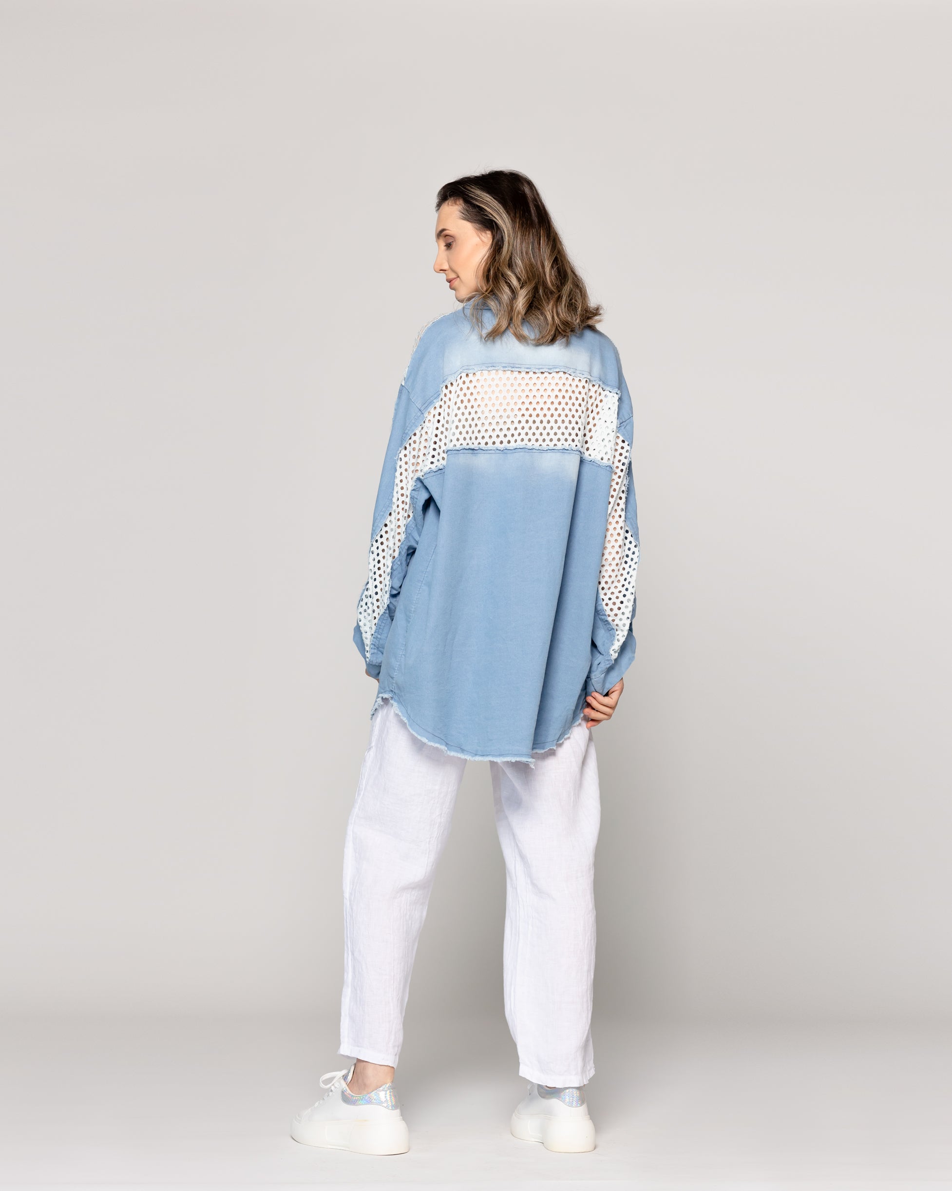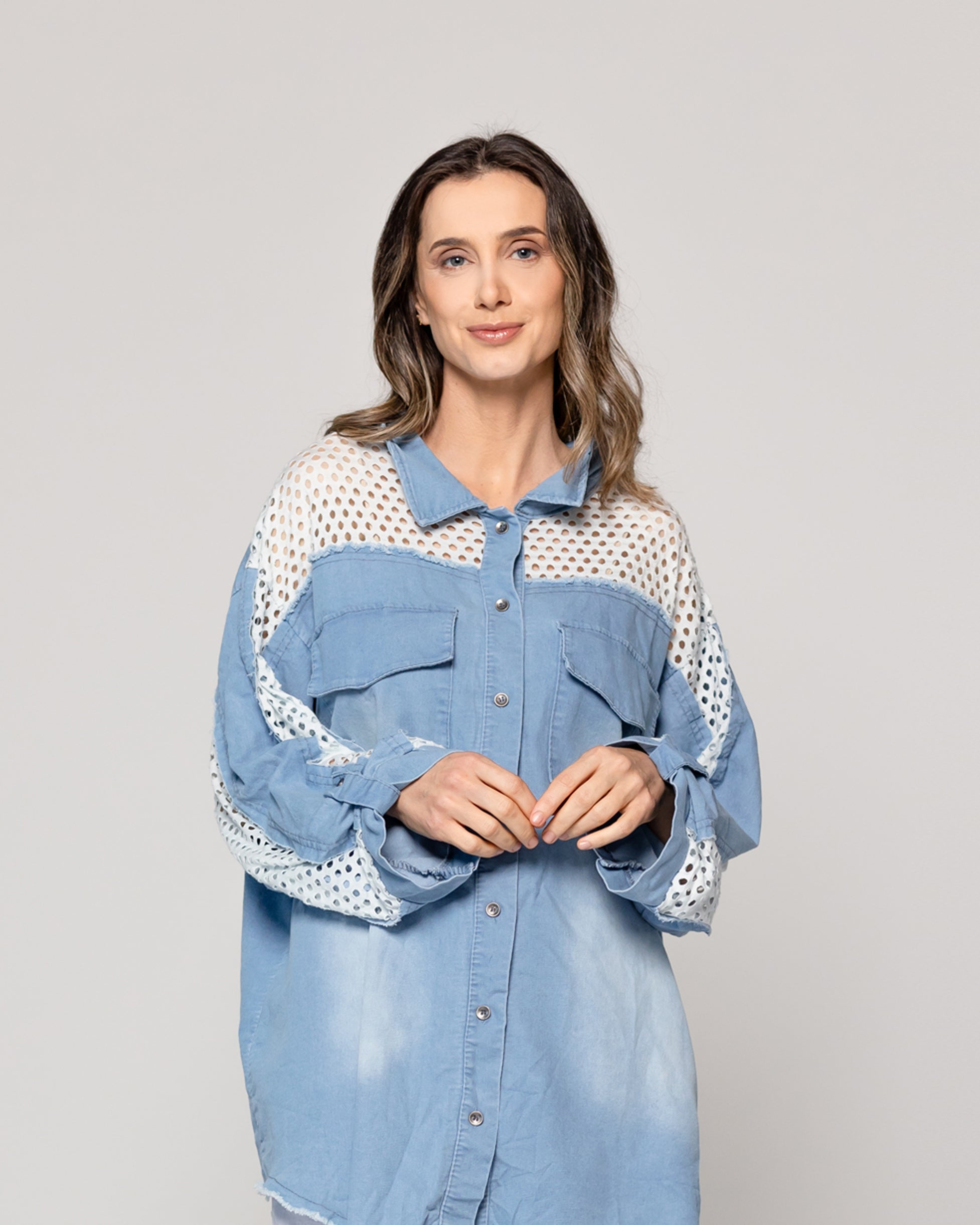 Lavinia Lineatre es una camisa oversize tipo chaqueta liviana, confeccionada en tela tipo denim con efecto desgastado, y un detalle de red calada blanca con diseño de lunares en hombros y espalda alta, que le aporta un look urbano y original. Tiene botones metálicos al frente, bolsillos grandes con solapa en el pecho y un ruedo sin terminar con efecto deshilachado, que refuerza su estilo relajado y moderno. El alto contenido de algodón asegura suavidad, frescura y transpirabilidad. Úsala abierta como sobrecamisa o cerrada y combínala con un pantalón suelto para un look relajado. Perfecta para cualquier ocasión, especial para días de primavera.