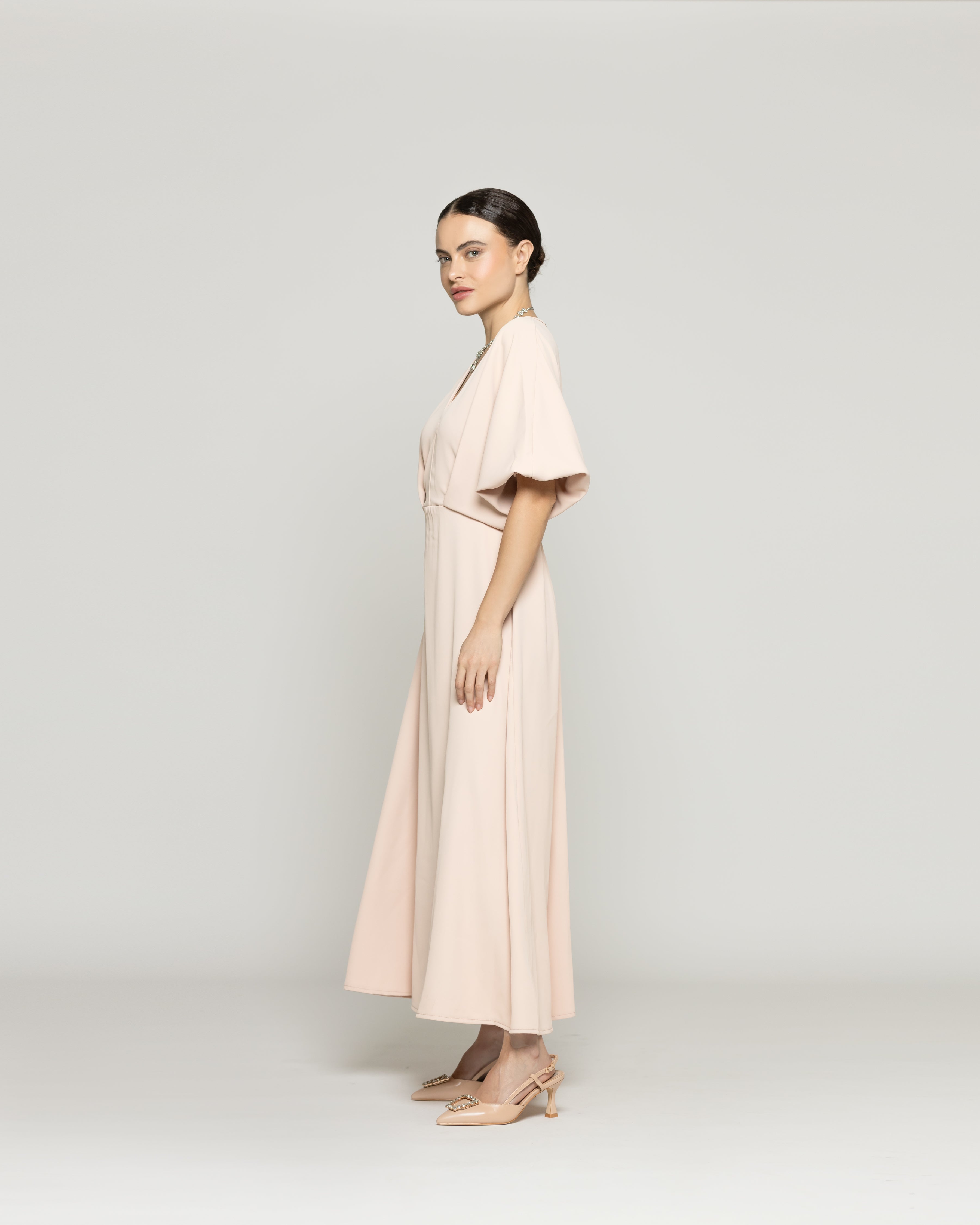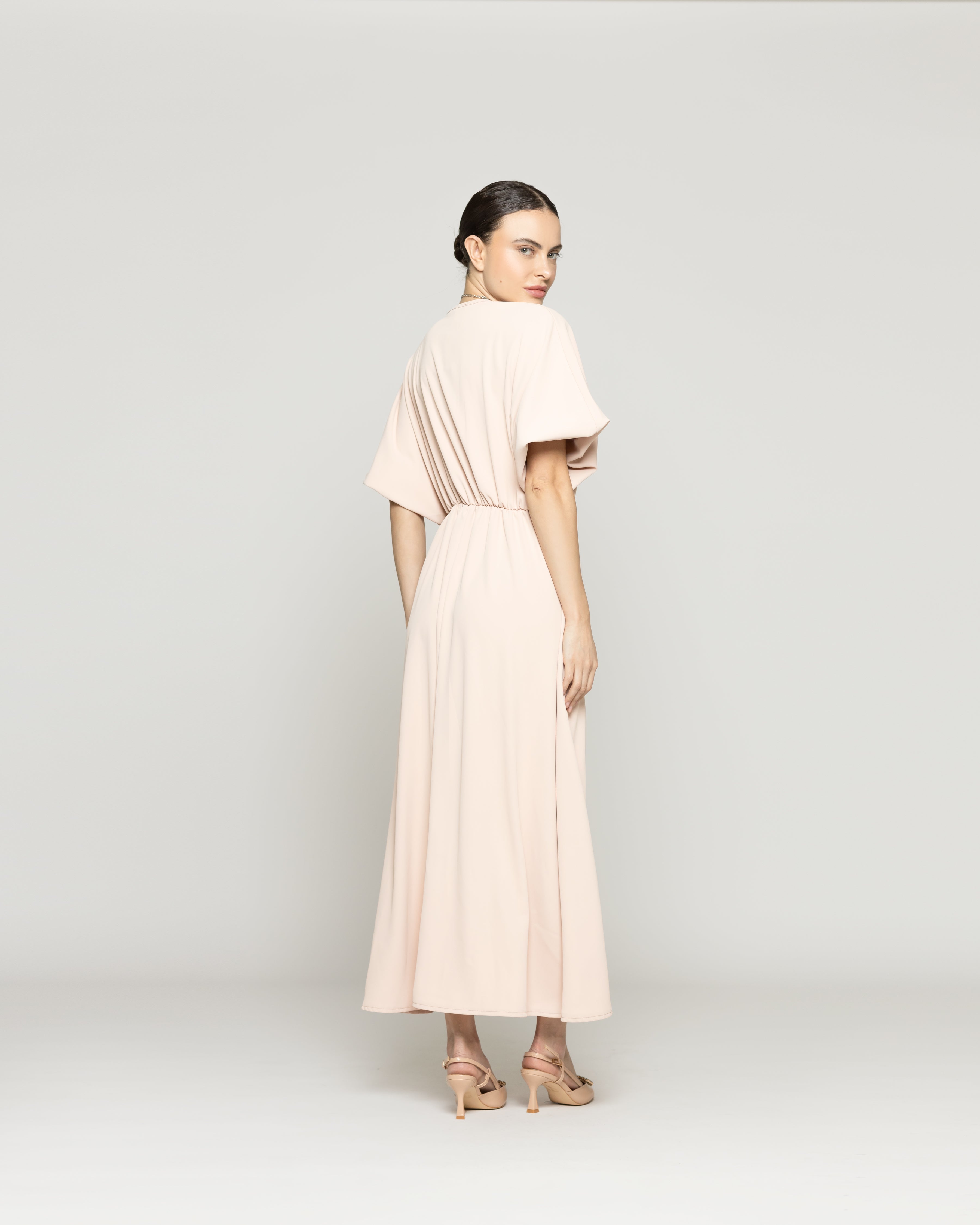 Vestido Viridiana Lineatre irradia elegancia atemporal en cada costura. Su diseño largo y fluido, en un delicado tono rosa empolvado, presenta un escote en V cruzado que favorece el busto y mangas cortas tipo globo que aportan movimiento y sofisticación. La cintura se ajusta suavemente para estilizar la silueta sin perder comodidad. Confeccionado en un tejido liviano de excelente caída, es ideal para ocasiones especiales, ceremonias o eventos donde el estilo discreto y refinado es protagonista. Combínalo con accesorios metálicos y tacones delicados para un look armónico y femenino.
