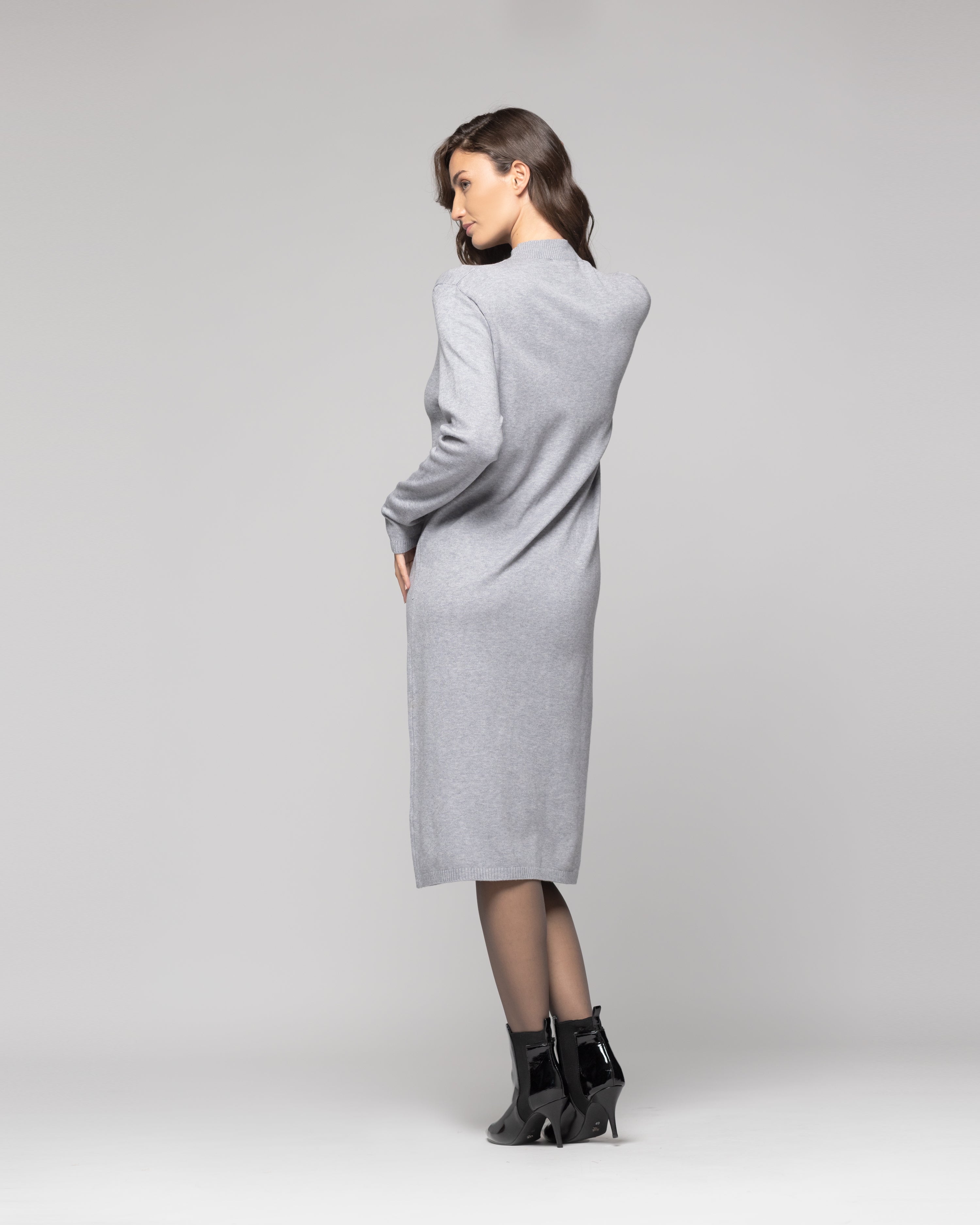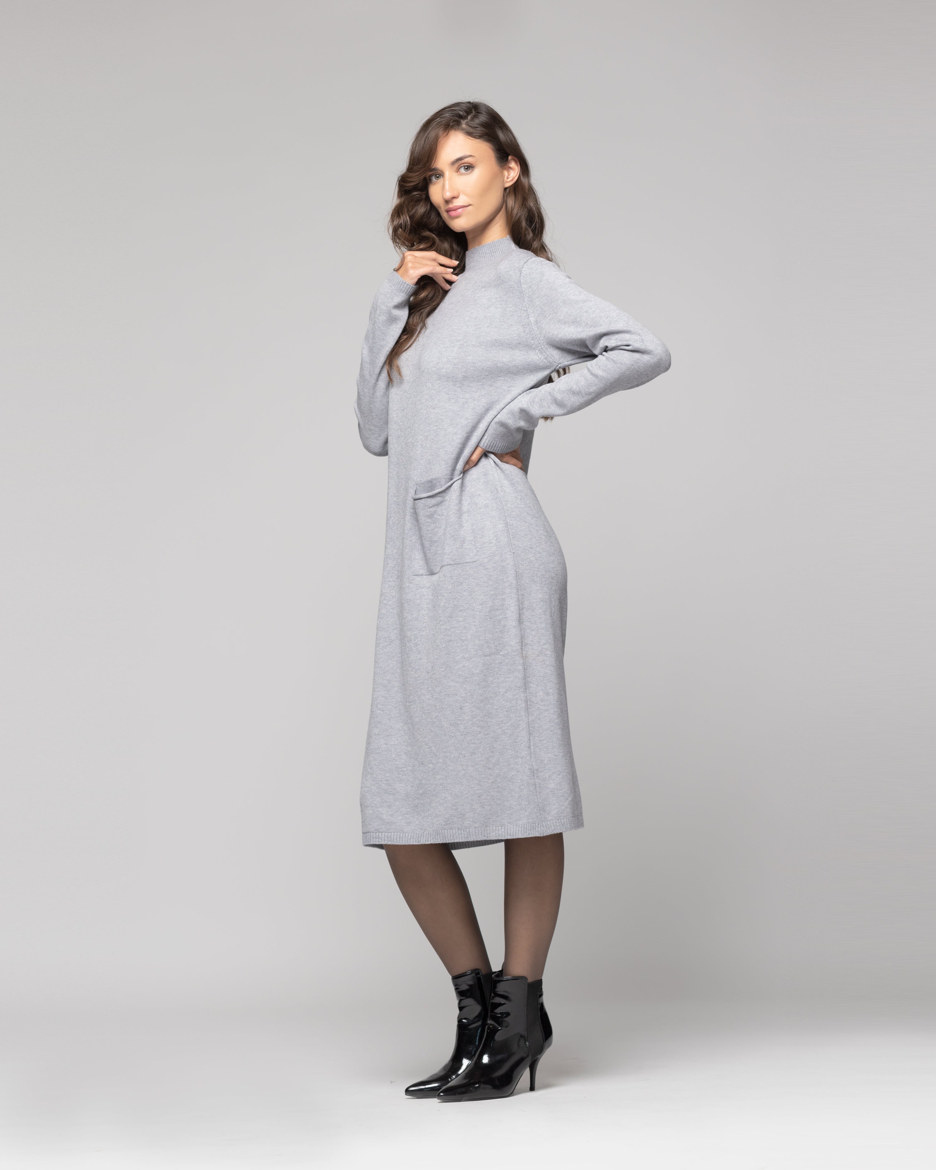 Vestido midi tejido gris, con silueta recta y cuello semi alto. Presenta mangas largas de corte clásico con puño ajustado y un bolsillo frontal tipo parche en el lado izquierdo que aporta un detalle sutil y funcional. Puede combinarse fácilmente con botines o zapatillas urbanas para un look casual pero cuidado.