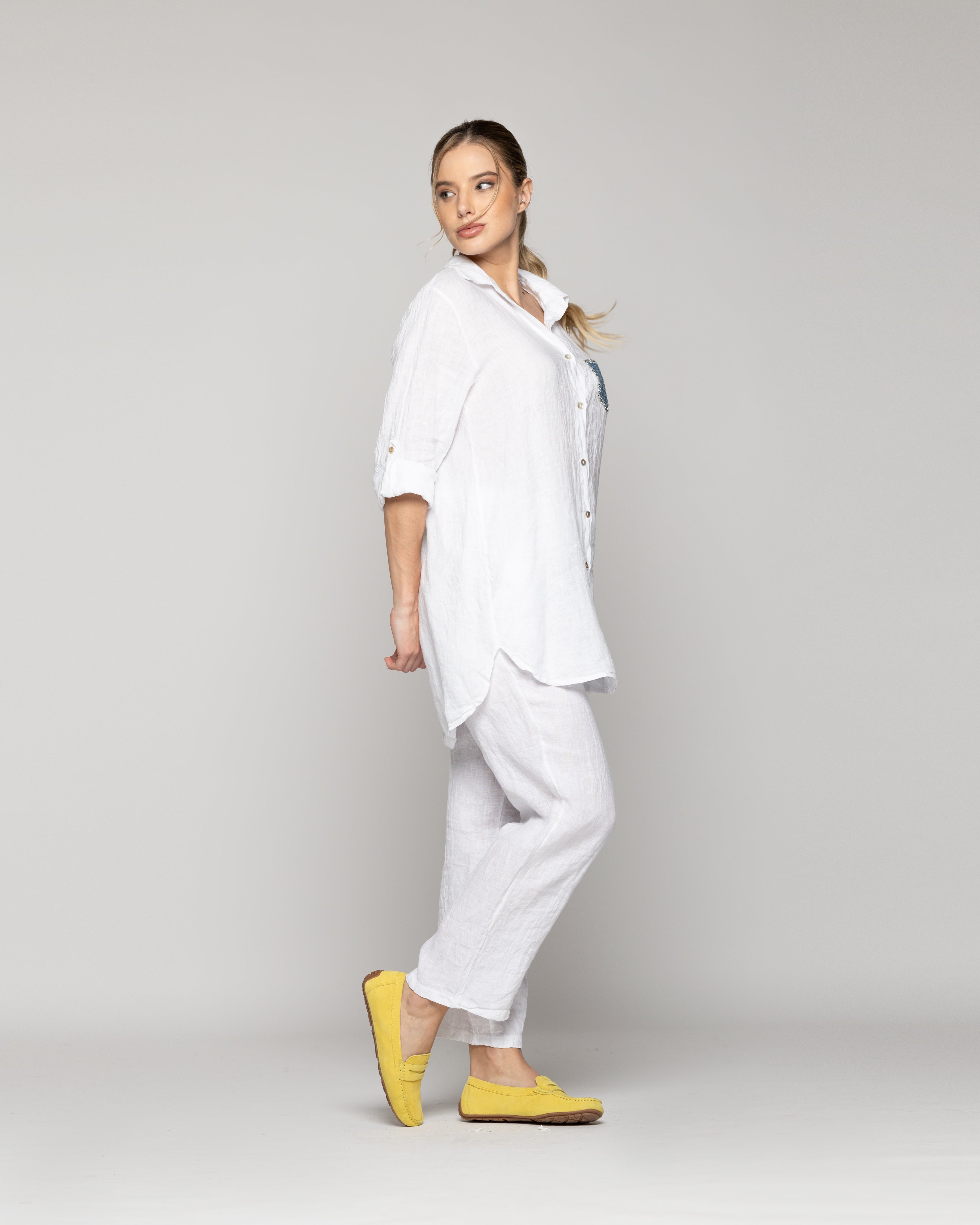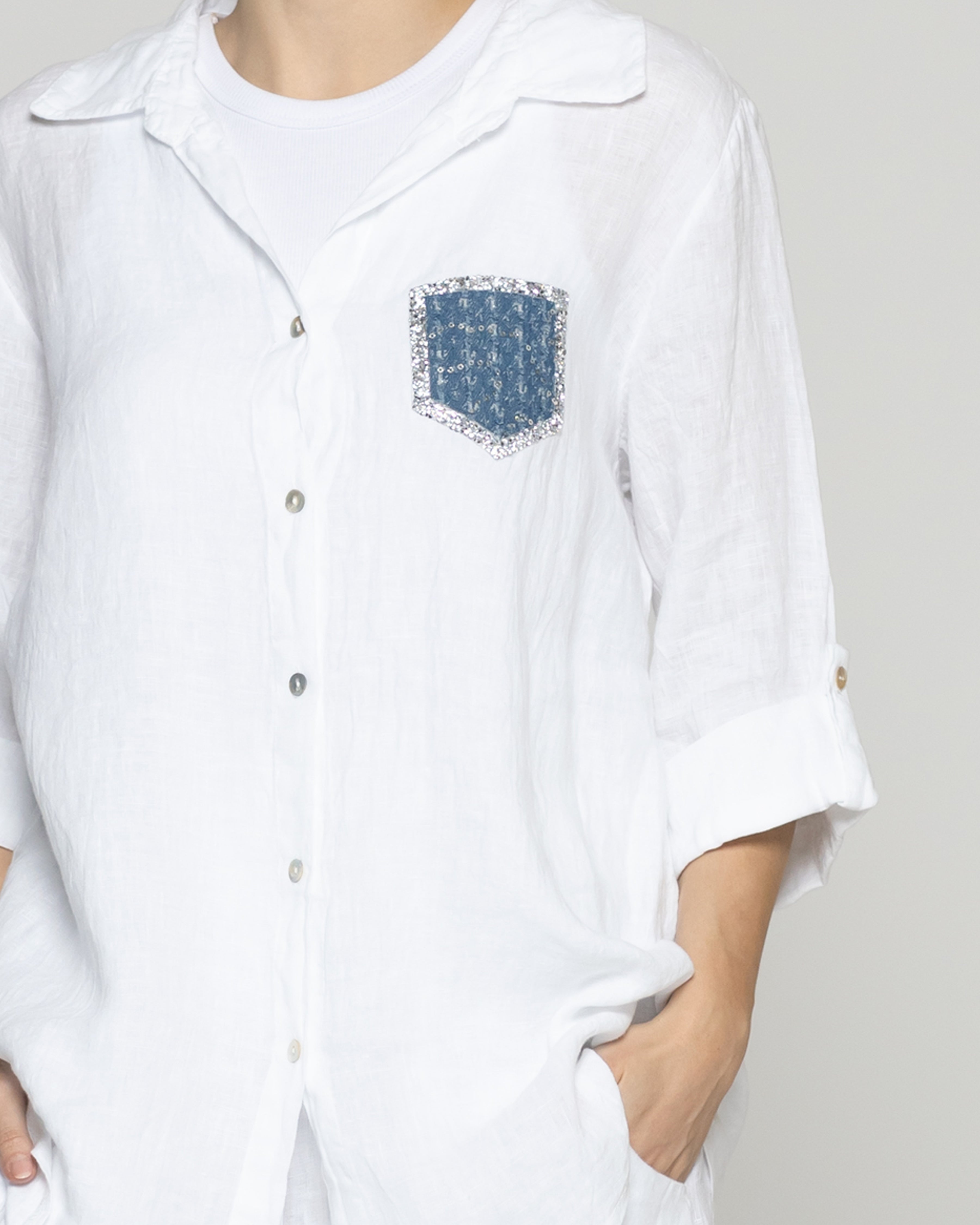 Blusa Benita Lineatre es una prenda 100% lino que combina frescura, funcionalidad y un toque distintivo. Confeccionada en un tejido liviano y natural, su diseño destaca por su corte suelto y relajado. Tiene mangas largas con opción de ajuste mediante trabilla interna, permitiendo llevarlas arremangadas para un look más casual. El detalle protagonista es su bolsillo decorativo en denim azul con bordado y ribete de lentejuelas plateadas, que aporta un acento moderno y artesanal al diseño clásico. Combínala con pantalones de lino blancos, beige o jeans claros para un look fresco y natural. Perfecta para días de calor, fines de semana o vacaciones con estilo relajado.