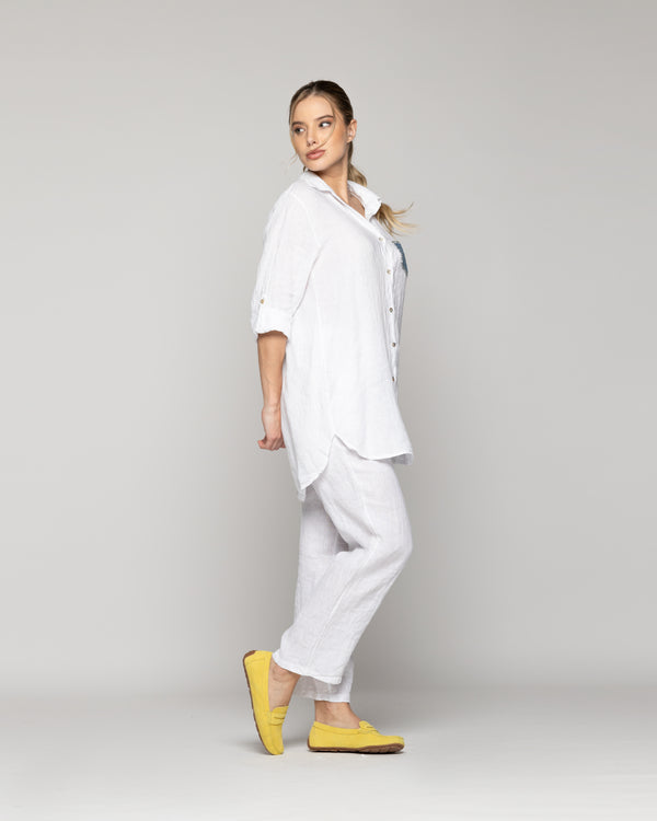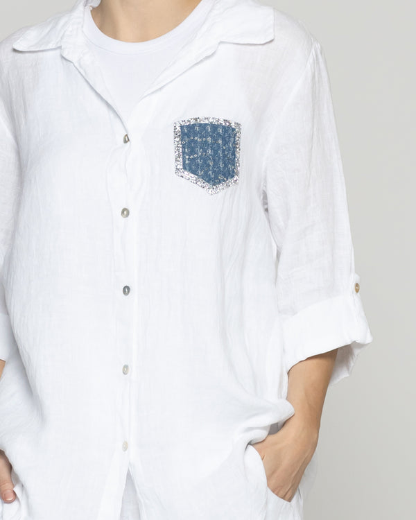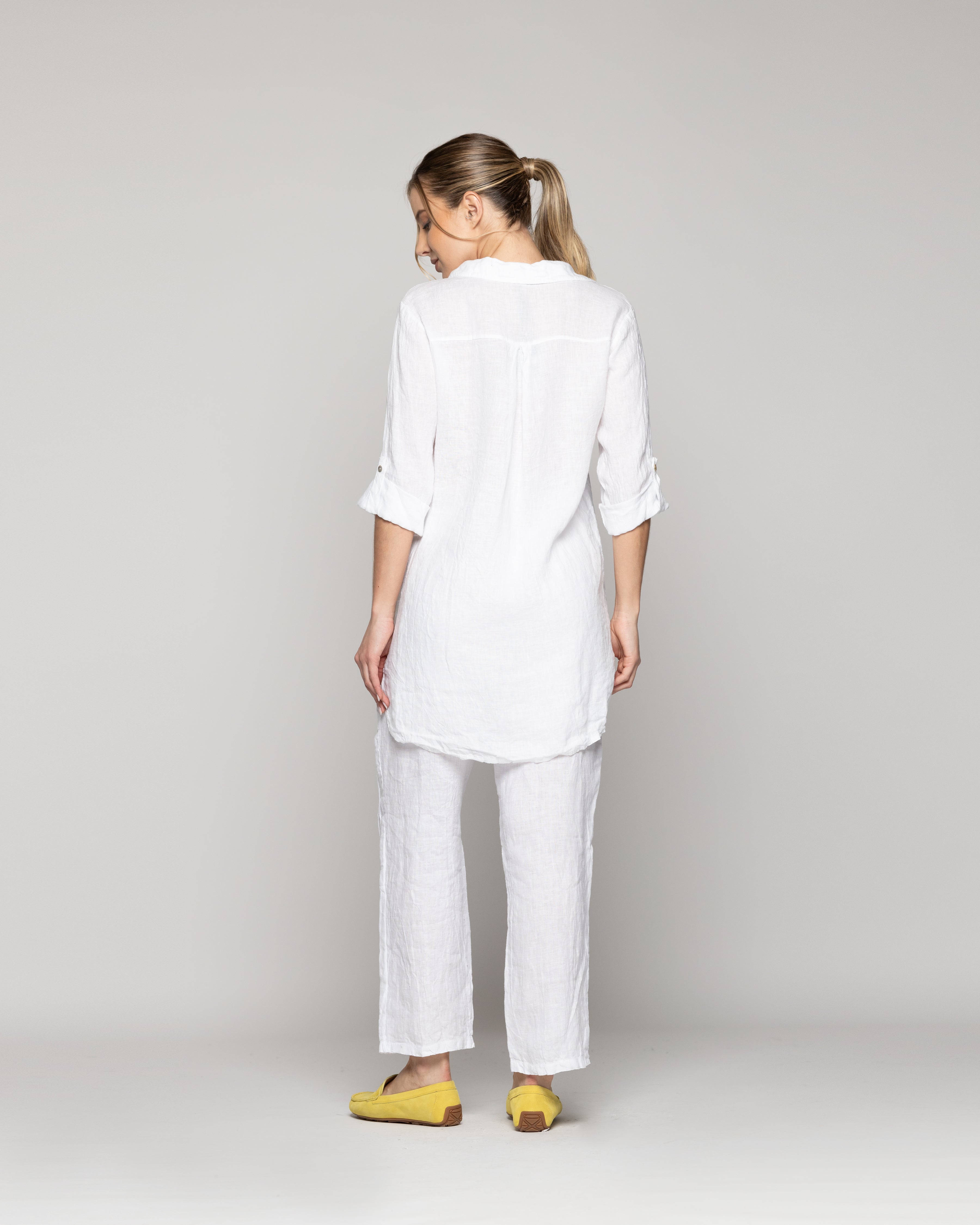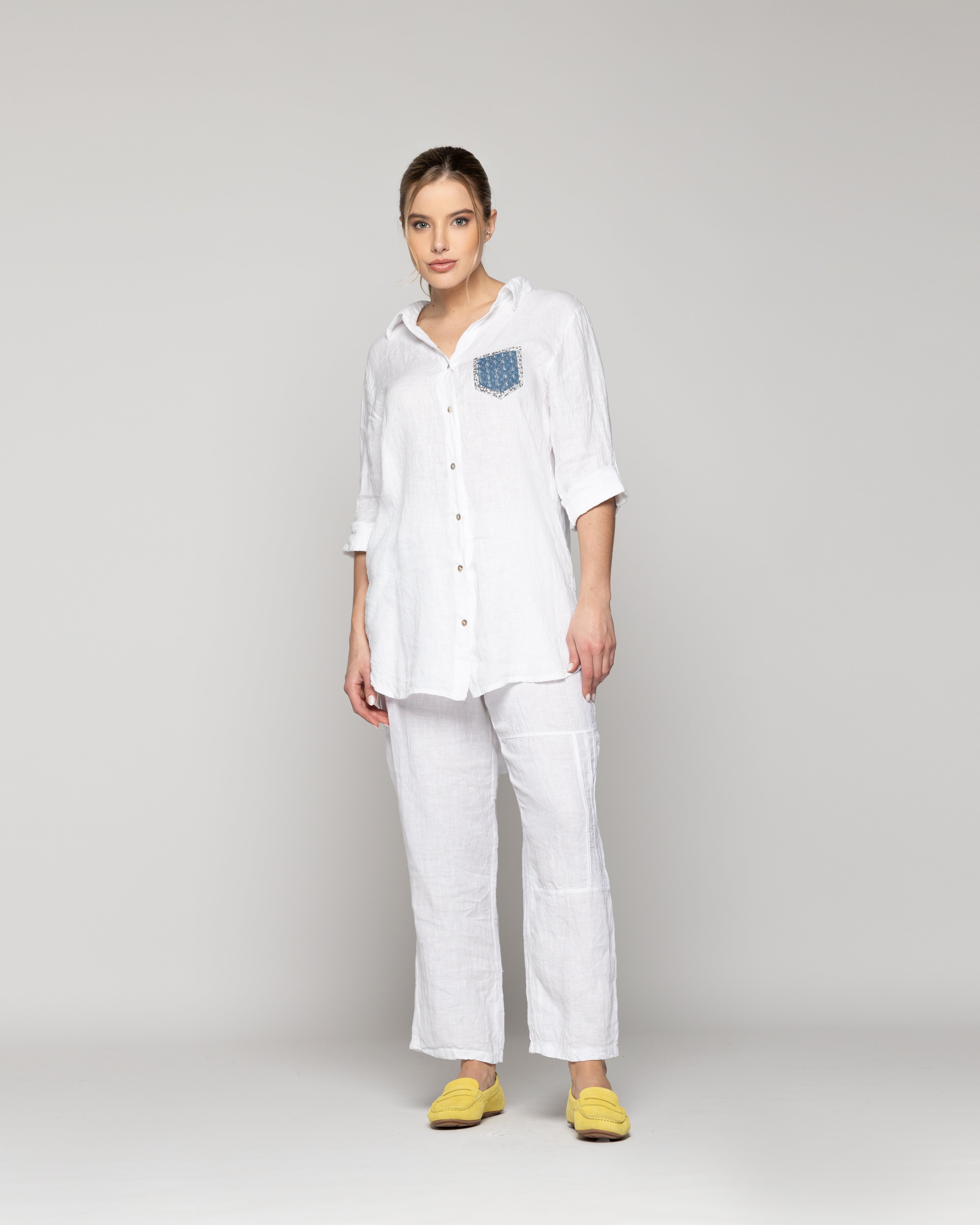 Blusa Mujer Benita De Lino Manga Larga Blanca Con Bolsillo Lineatre