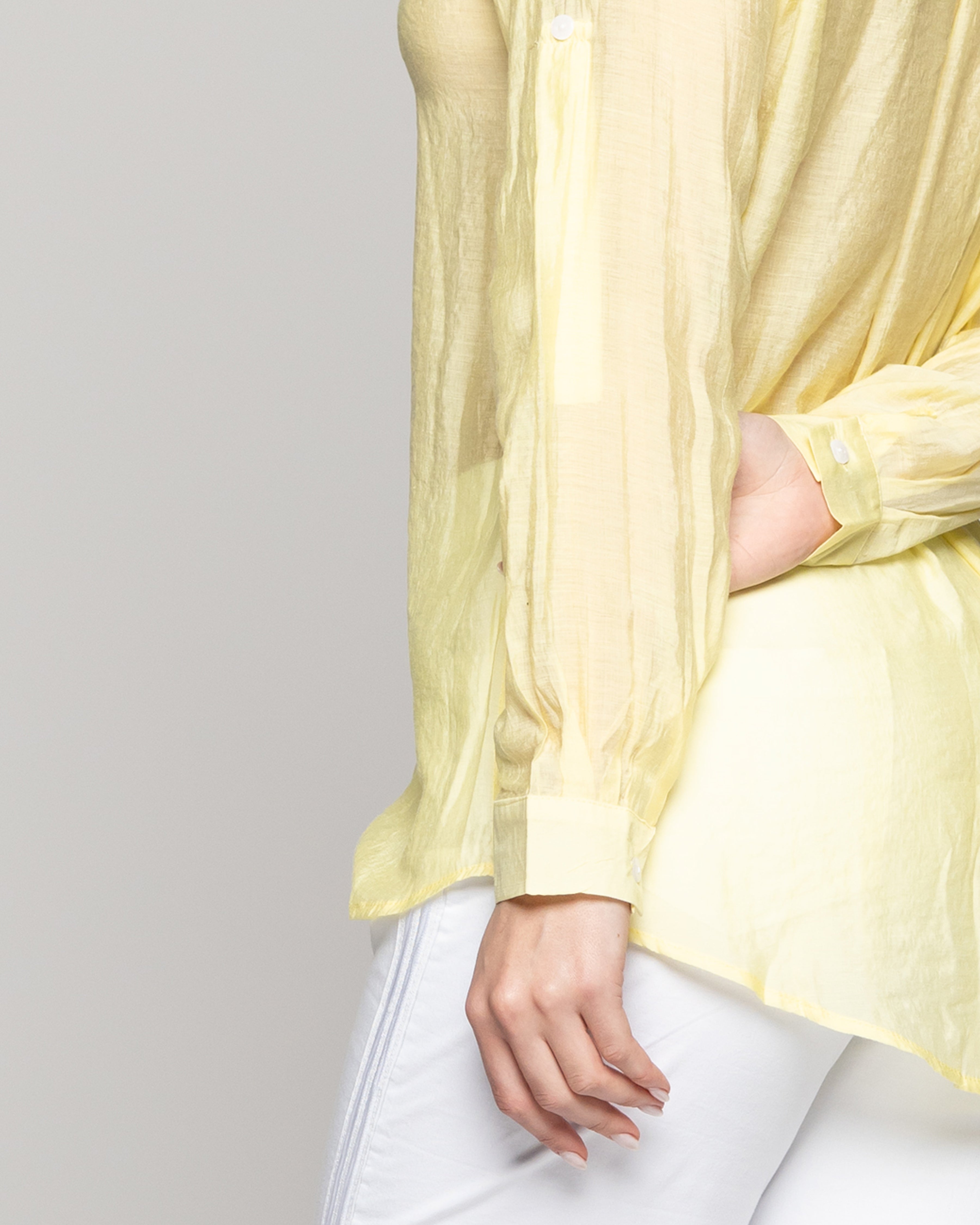 Blusa Brunella tiene un diseño básico de calce regular y manga larga que puede arremangaarse mediante un botón. Con una mezcla pensada para el confort y la suavidad, esta prenda combina la fluidez de la viscosa, la frescura natural del algodón y el toque sedoso de la seda. El resultado es una textura liviana, suave al tacto y con un sutil brillo que la hace perfecta para un look cómodo pero sofisticado.