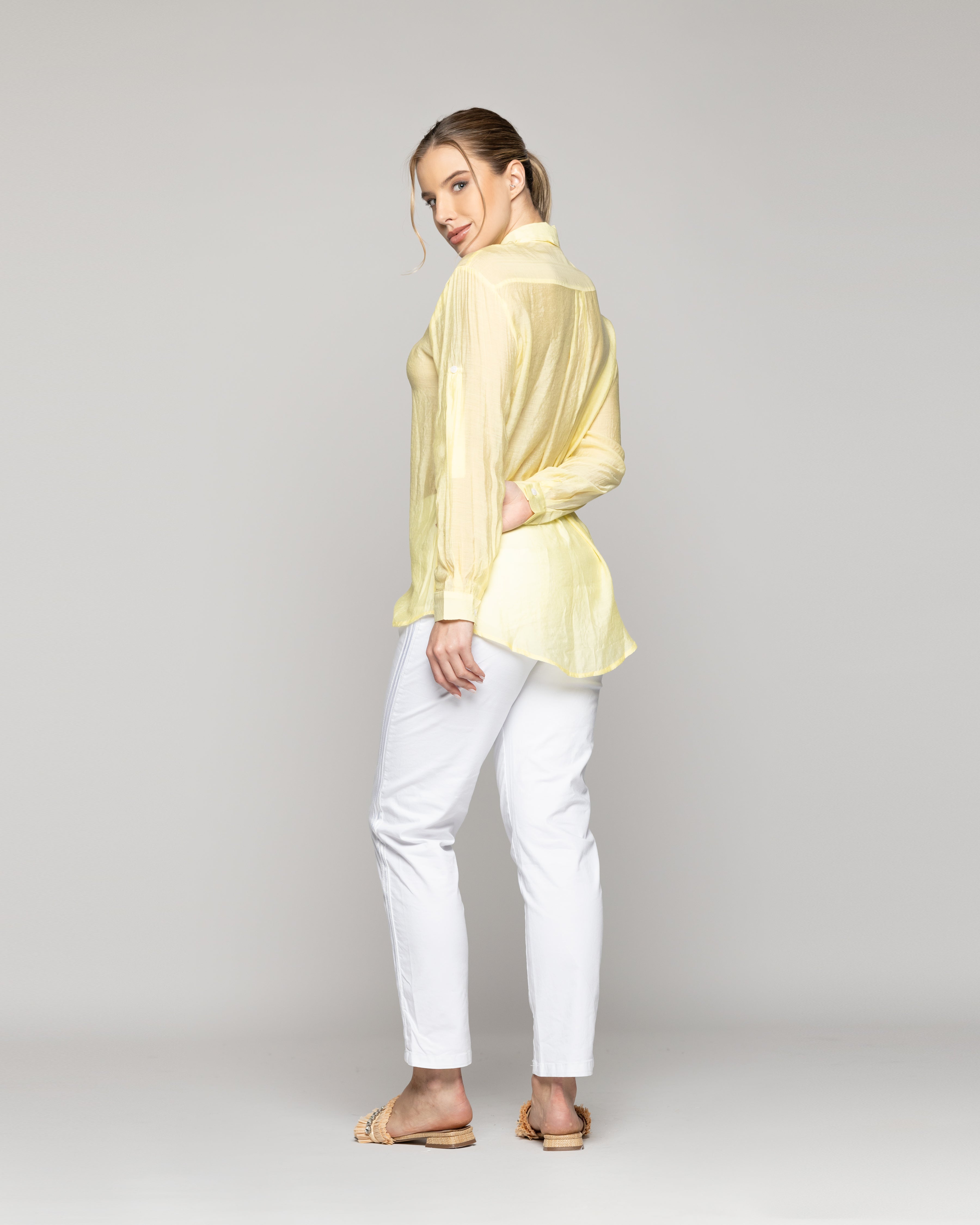Ideal para climas cálidos o de media estación. Combina bien con pantalones en tonos claros o jeans. Puede usarse sola o con top debajo debido a su transparencia. Disponible en varios colores.