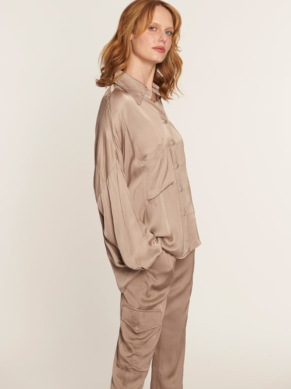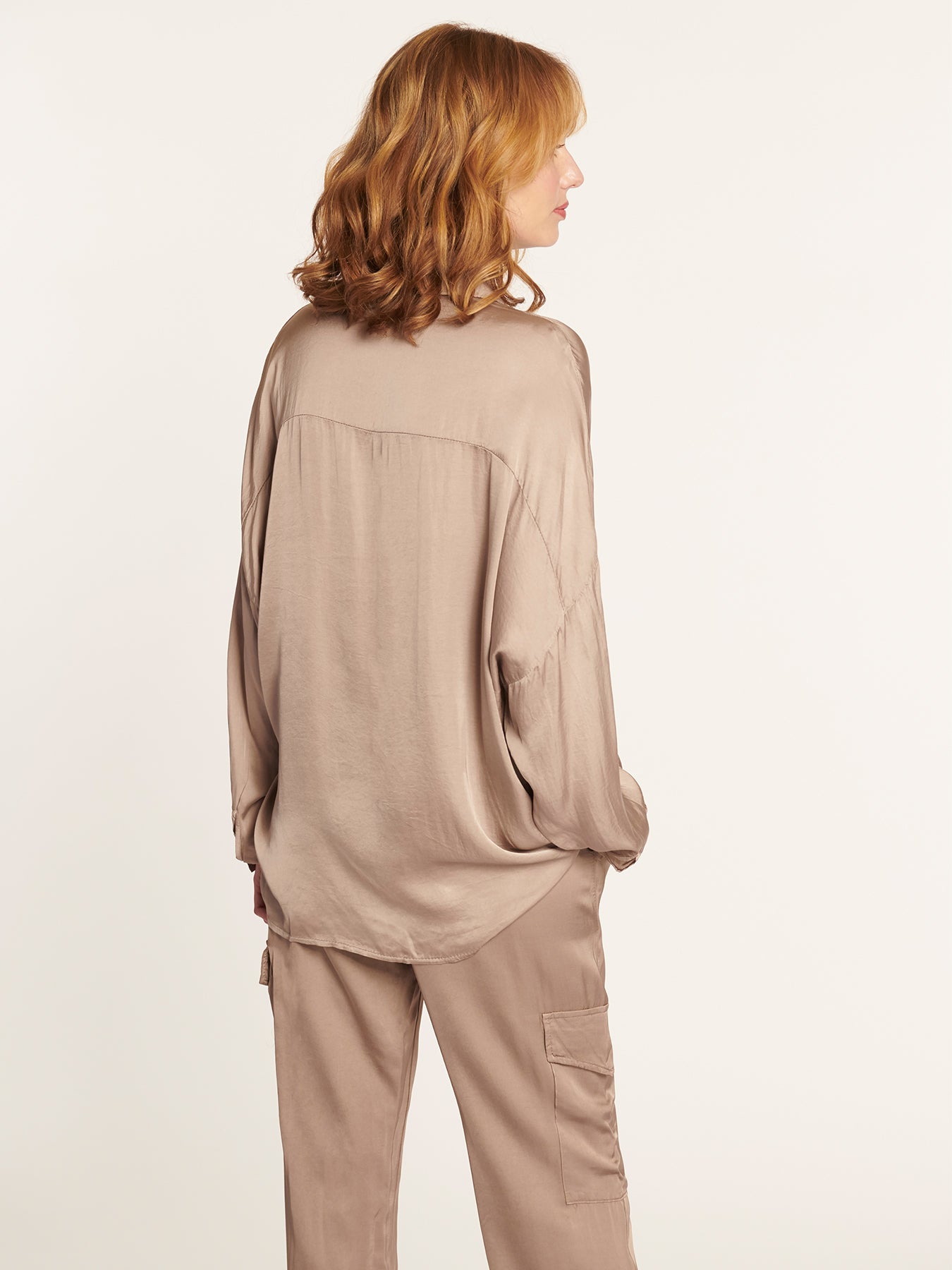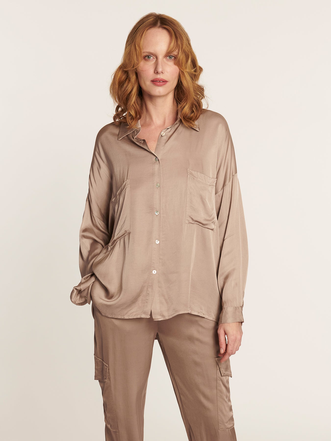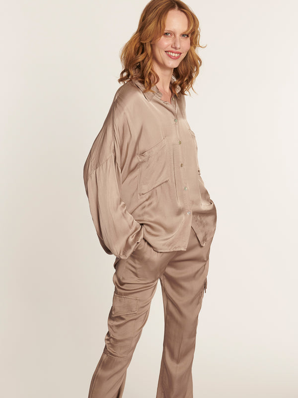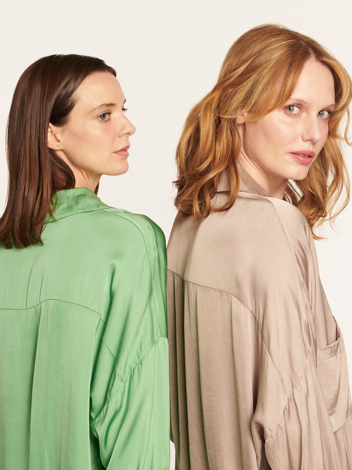 Blusa de viscosa, ligera, con bolsillos, botones planos, mangas caídas, anchas y detalle de costura en los brazos.
