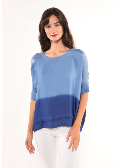 Blusa manga 3/4 y detalles en plateado, con degradé y silueta asimétrica. Ideal para usarla con jeans.