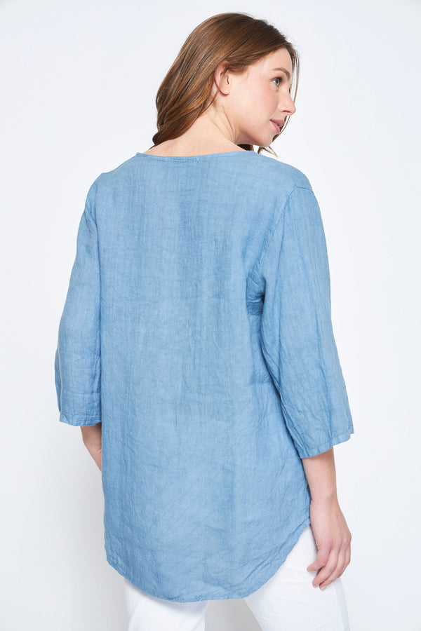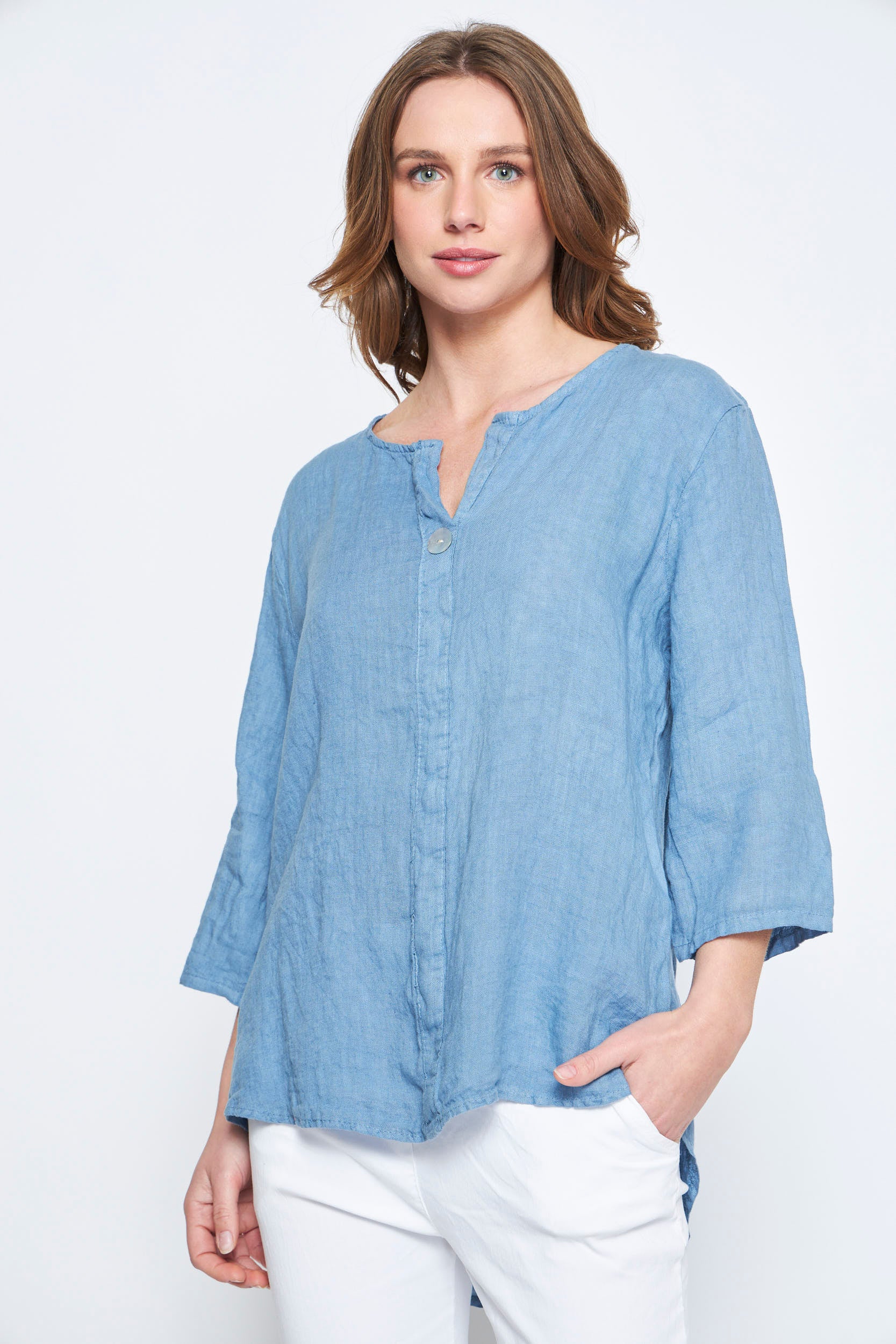 - Descripción: Esta elegante blusa de lino presenta un escote en V y mangas 3/4, adornada con un botón decorativo que añade un toque de sofisticación a tu atuendo diario.