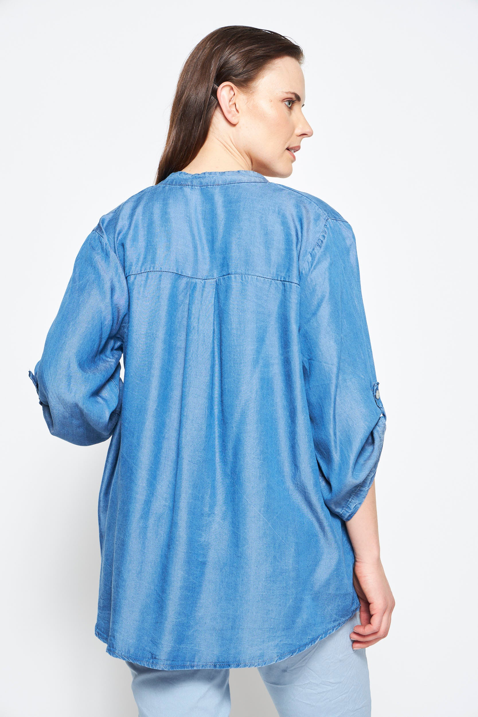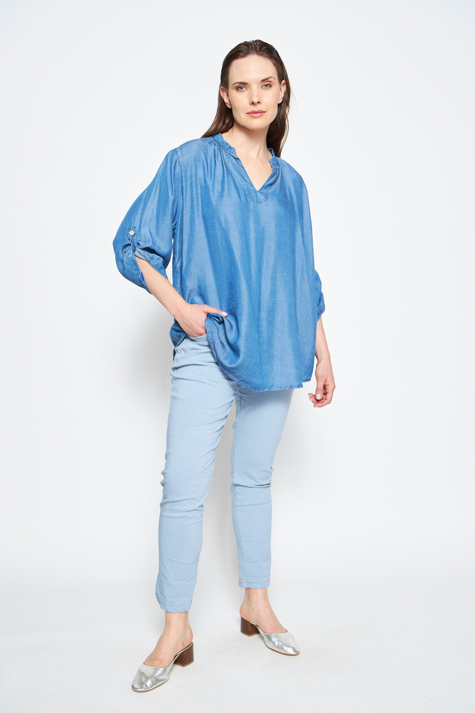 - Descripción: Esta blusa holgada con manga 3/4 y escote en V es la elección perfecta para un look casual y elegante. Su diseño fluido proporciona comodidad y estilo, ideal para cualquier ocasión.