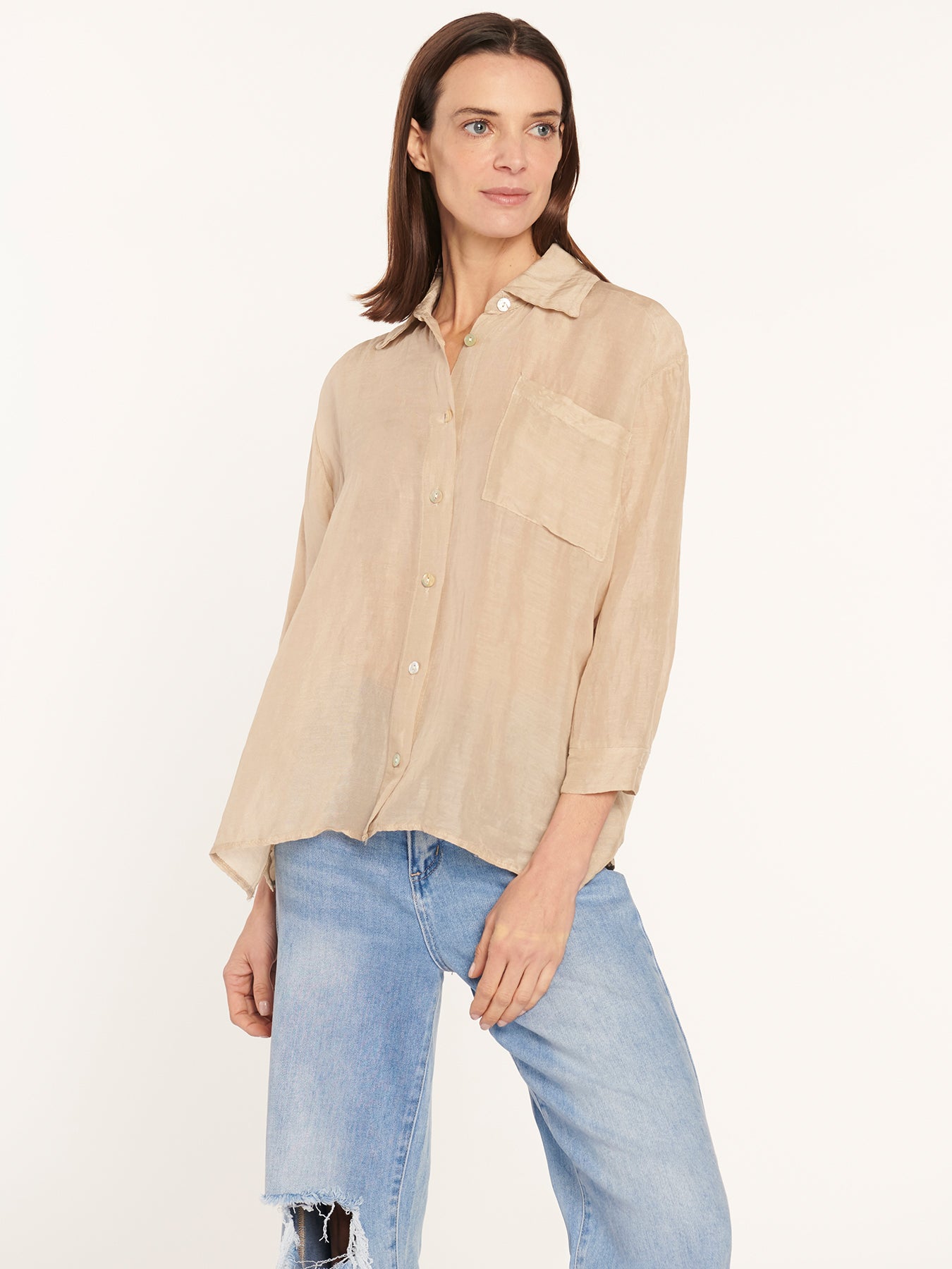 Blusa abotonada, mangas 3/4, con un bolsillo en la parte frontal izquierda, cuello camisero, con apertura en sus costados y botón en ambos puños.
