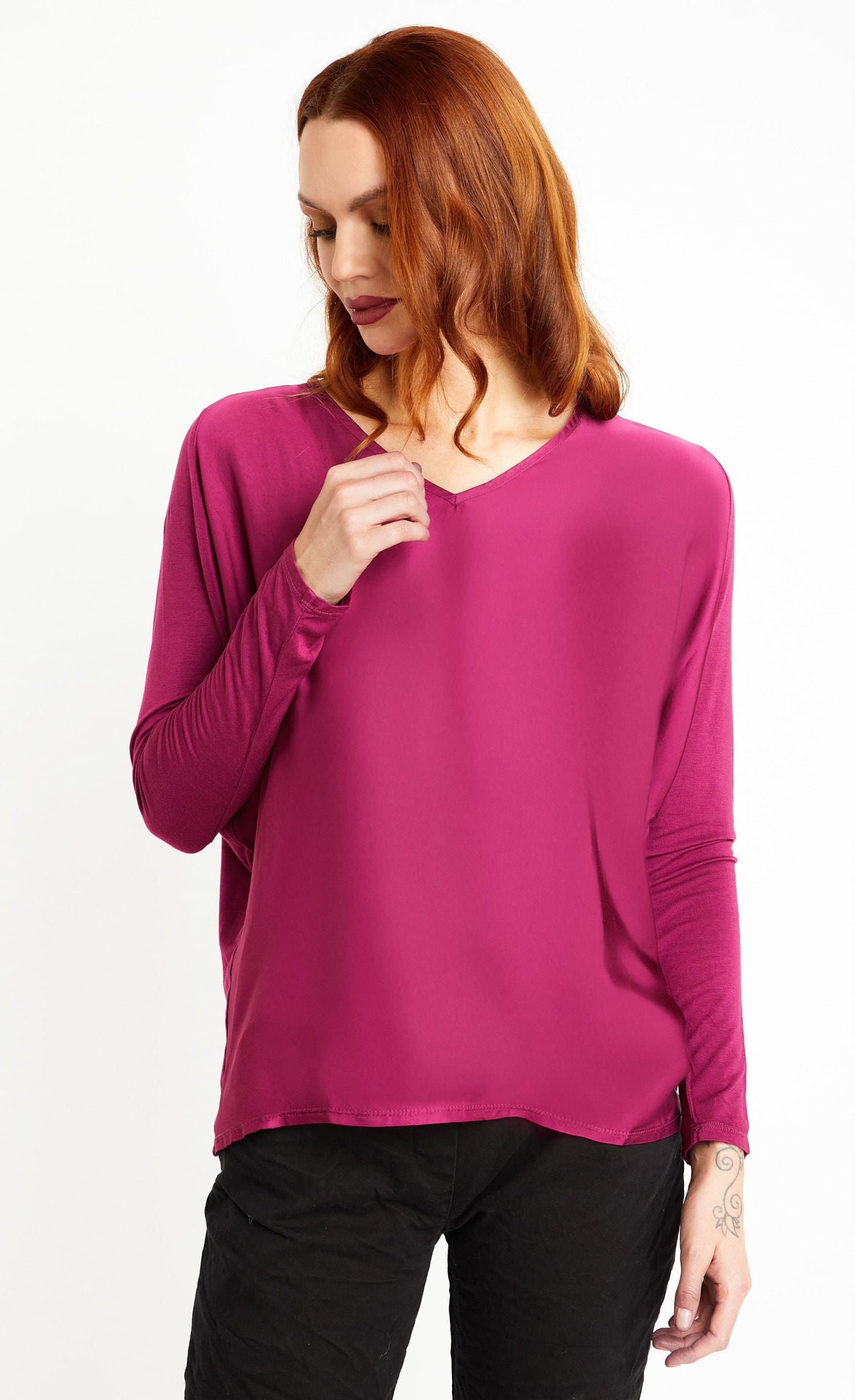 Blusa cuello en V, manga larga, acabado brillante, ideal para looks casuales