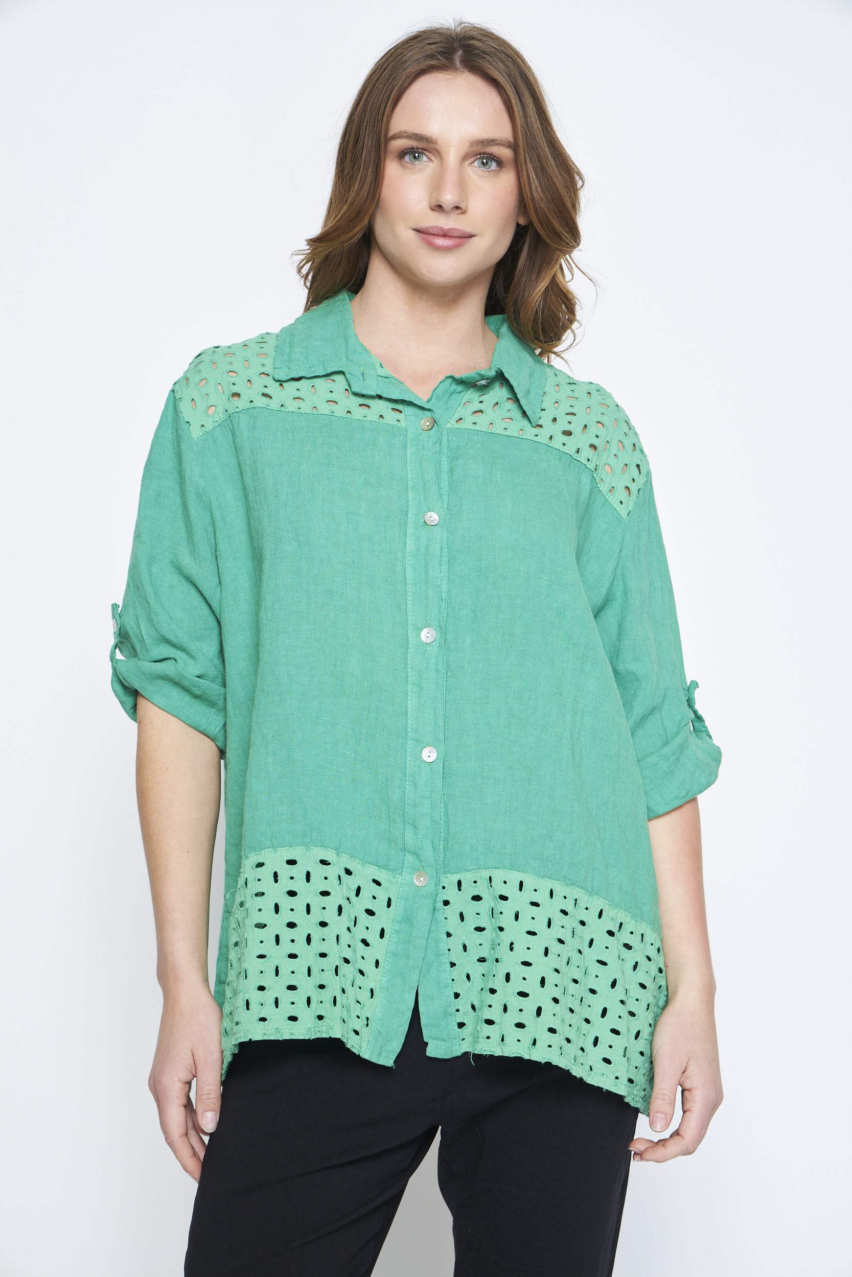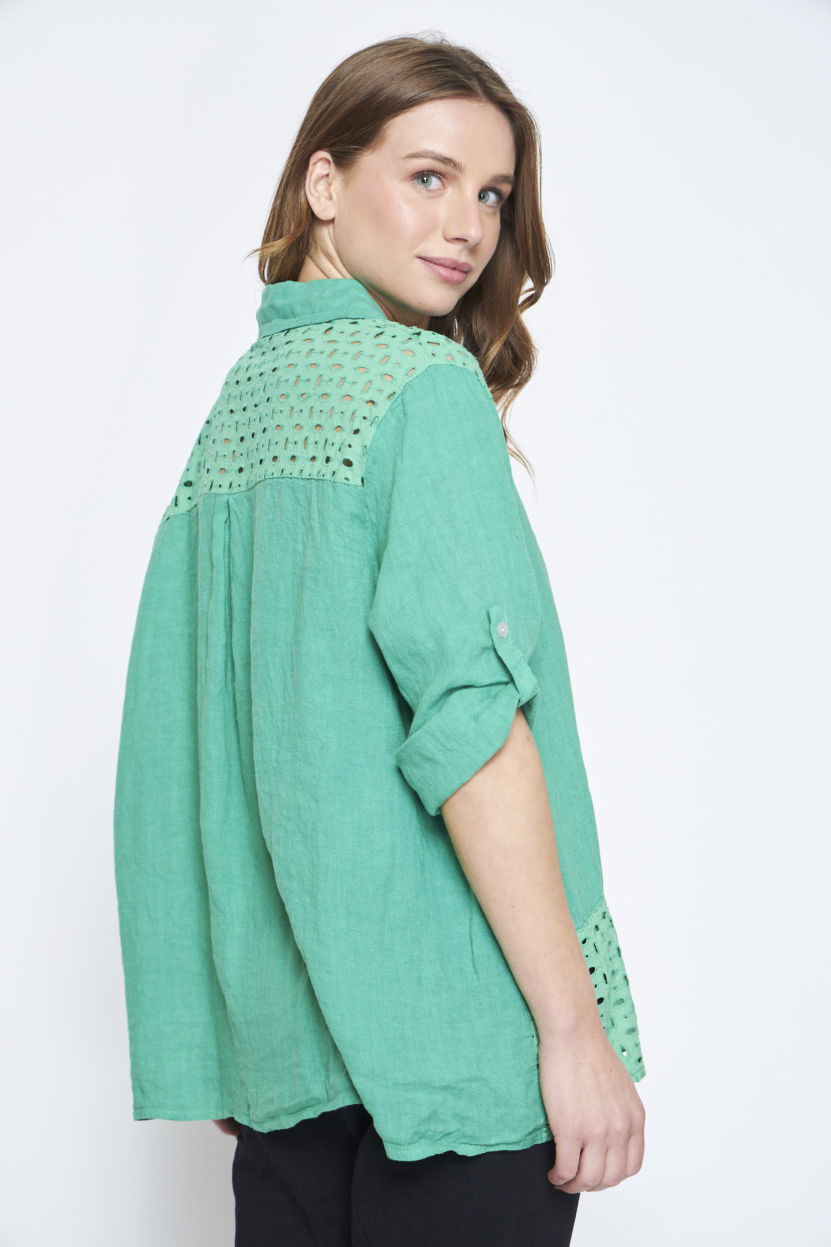 - Descripción: Blusa de lino abotonada con un toque elegante y fresco. Las mangas con presilla ajustable y los detalles estilo broderie añaden un encanto especial a esta prenda versátil.
