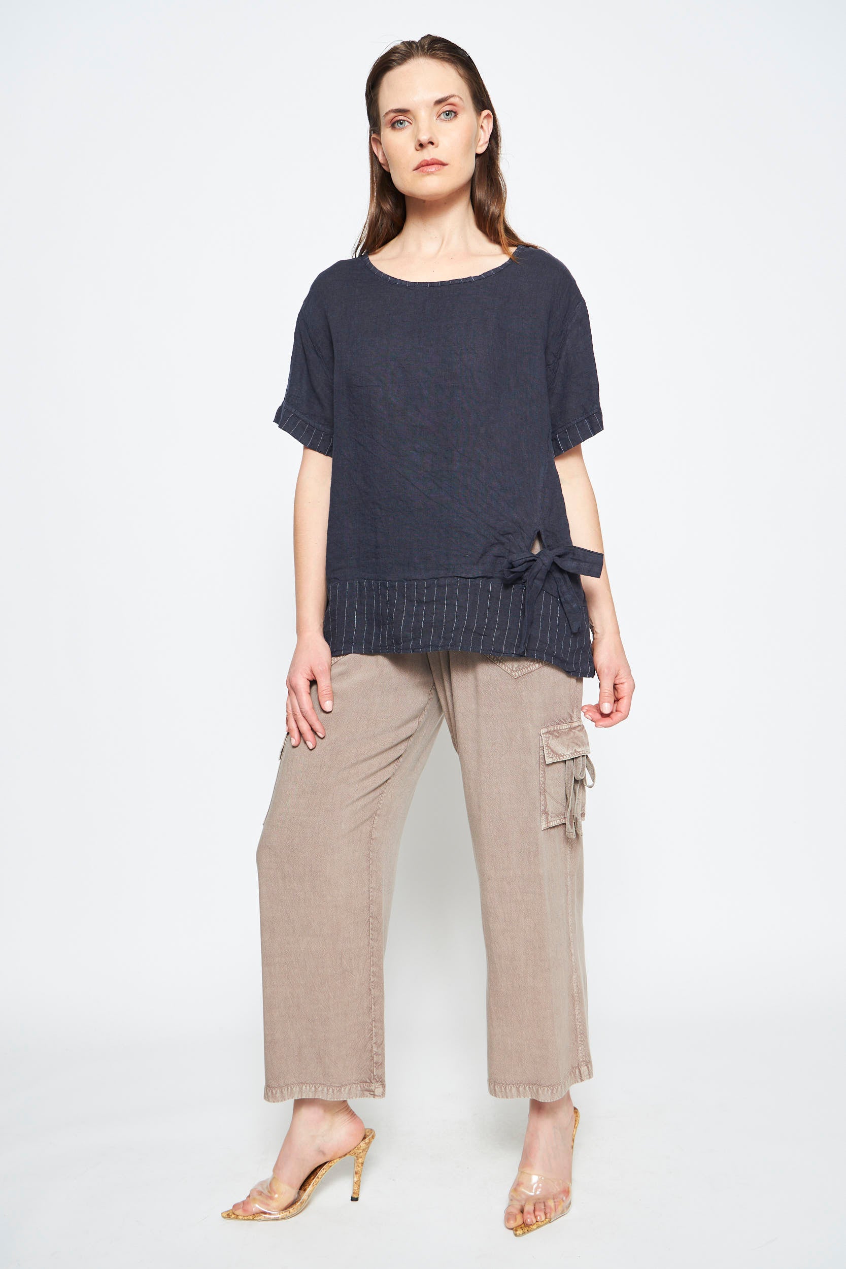 - Descripción: Blusa ancha de lino con un diseño elegante y cómodo. Presenta un cuello redondo y mangas cortas, complementada con un lazo en un costado que añade un toque distintivo y femenino.