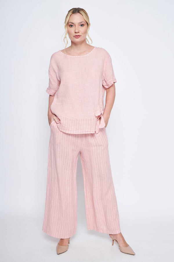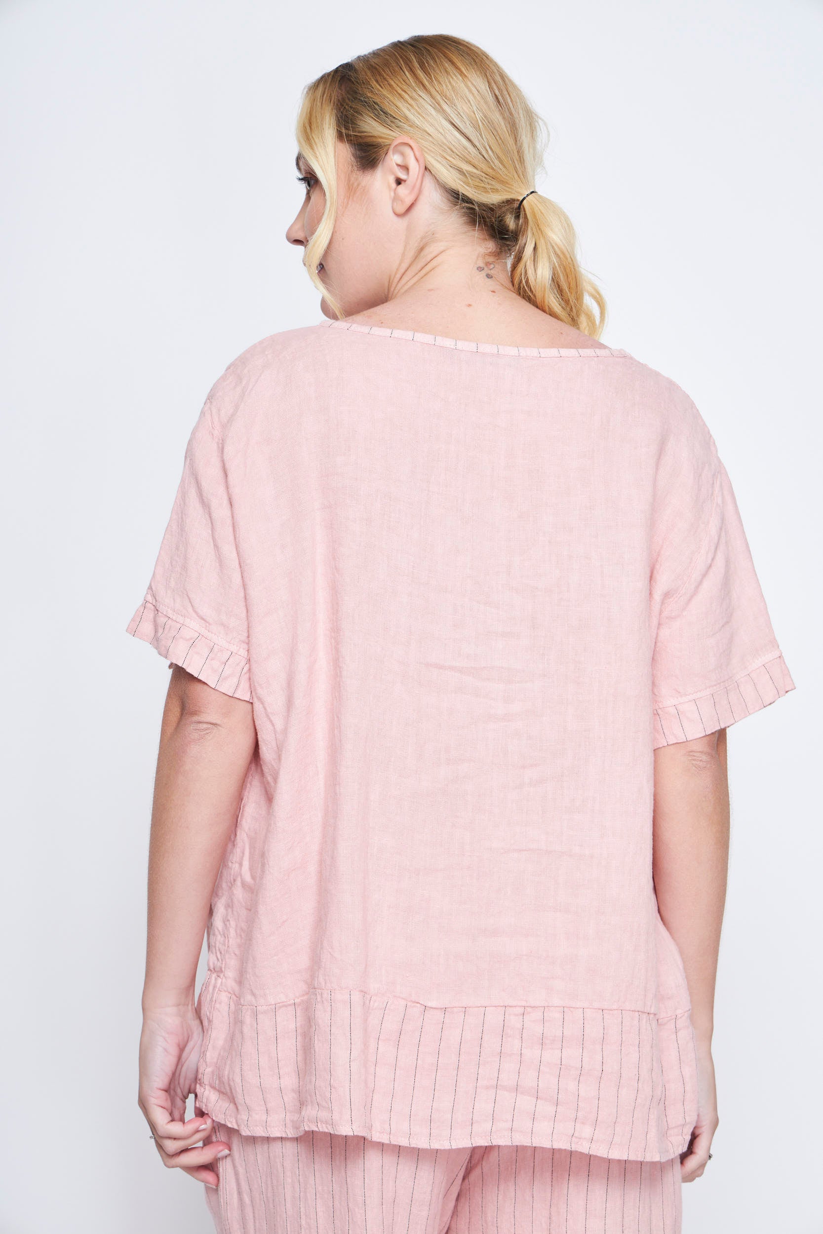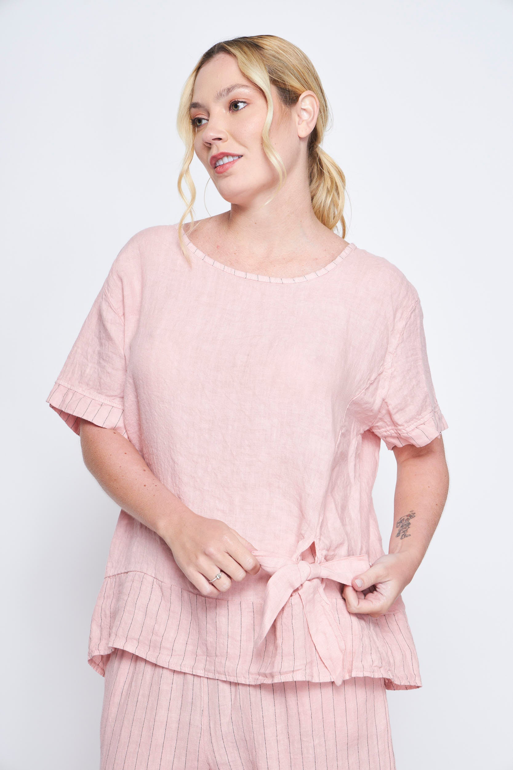 - Descripción: Blusa ancha de lino con un diseño elegante y cómodo. Presenta un cuello redondo y mangas cortas, complementada con un lazo en un costado que añade un toque distintivo y femenino.