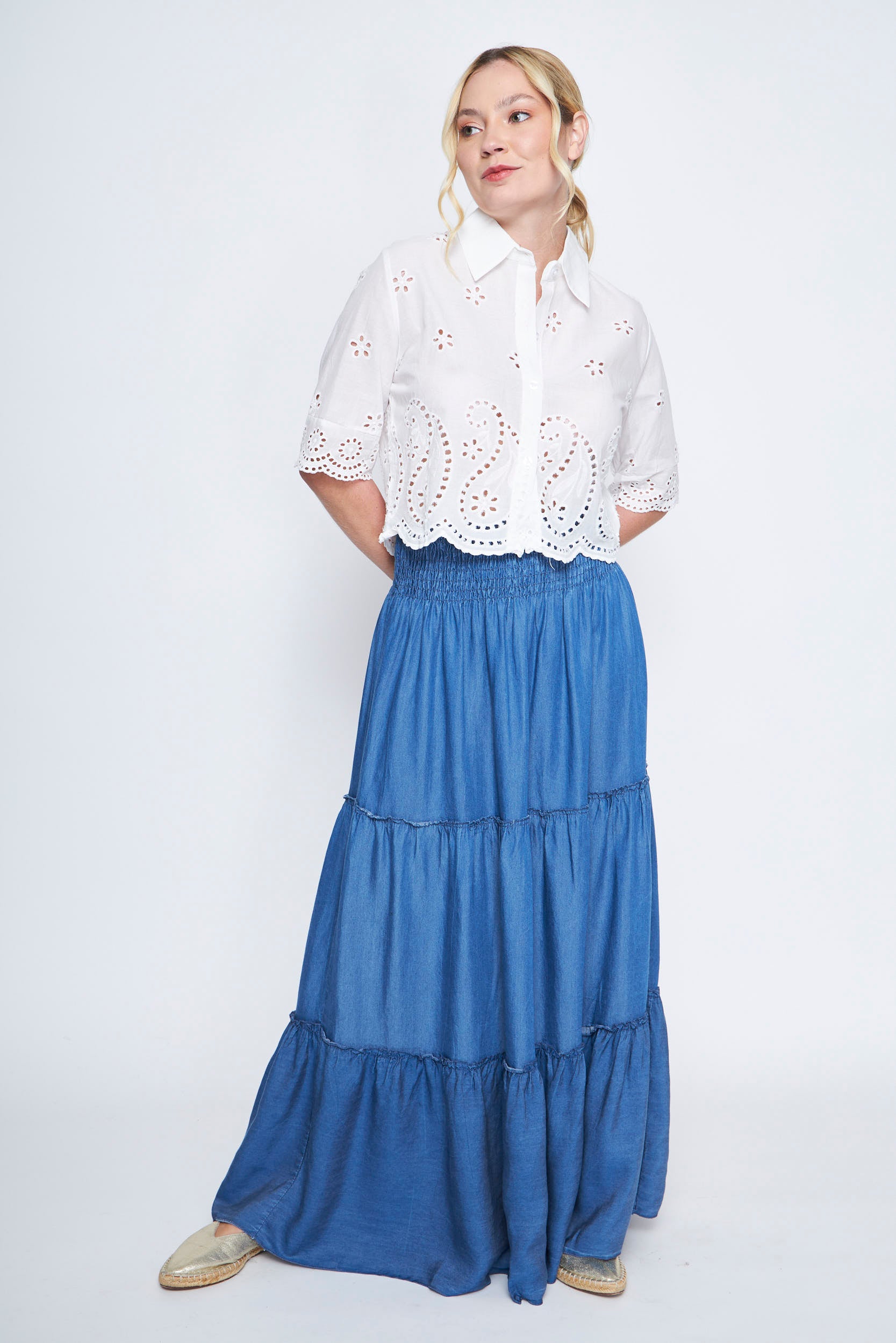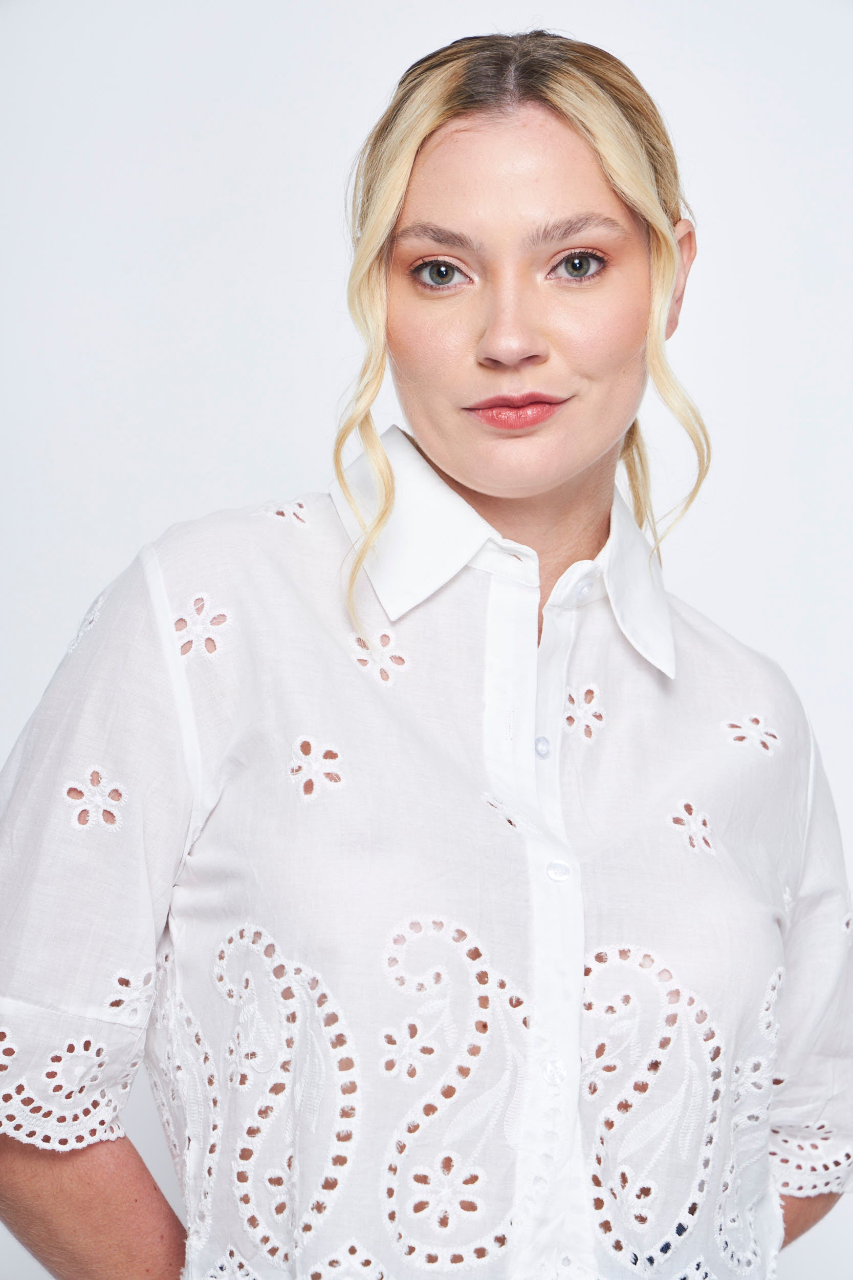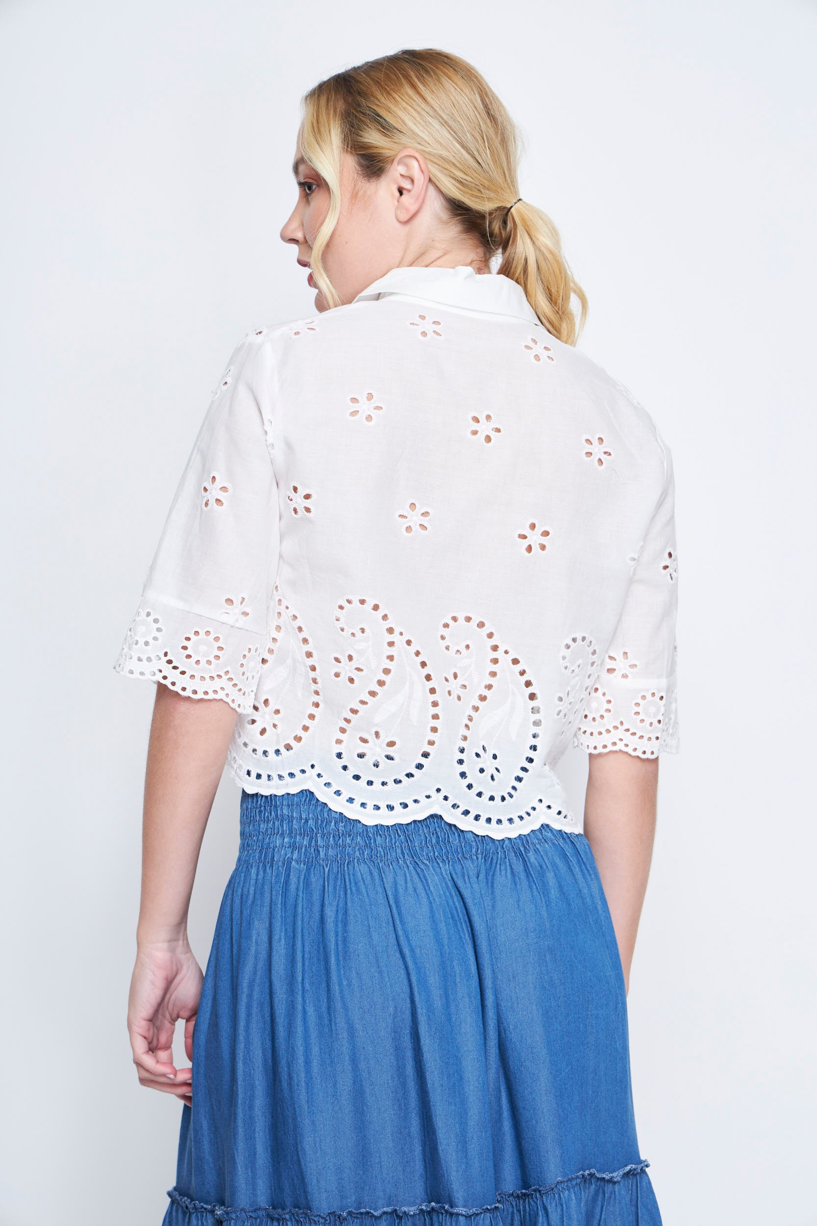 - Descripción: Esta blusa corta de broderie es la elección perfecta para un look fresco y elegante. Confeccionada con un diseño delicado y detalles intrincados, es ideal para cualquier ocasión, desde una salida casual hasta un evento especial.