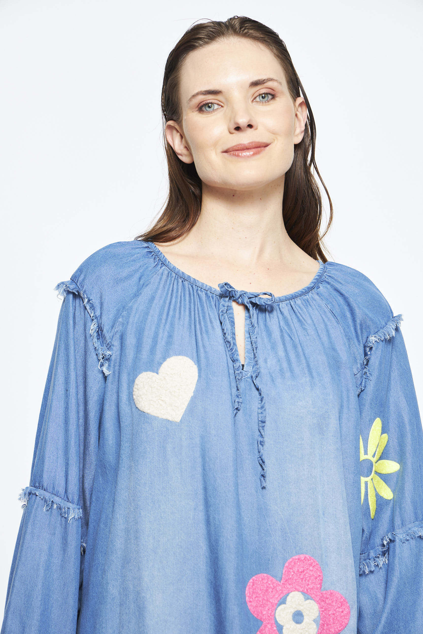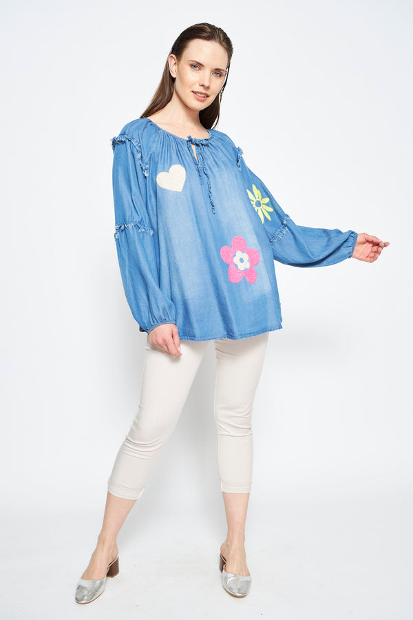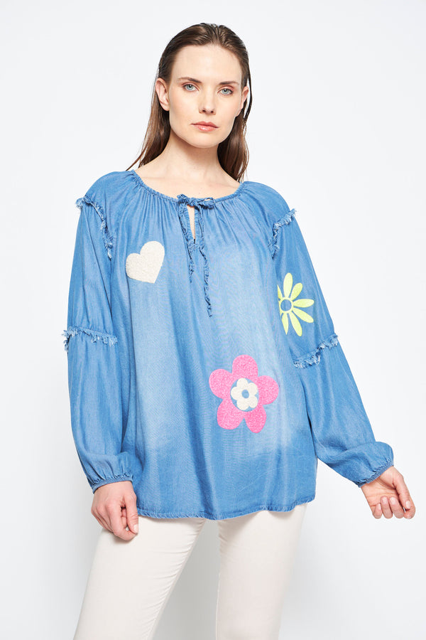 - Descripción: Blusa holgada de manga larga con un diseño único que incluye flequillos y parches decorativos de flores y corazones. Perfecta para un look bohemio y chic.
