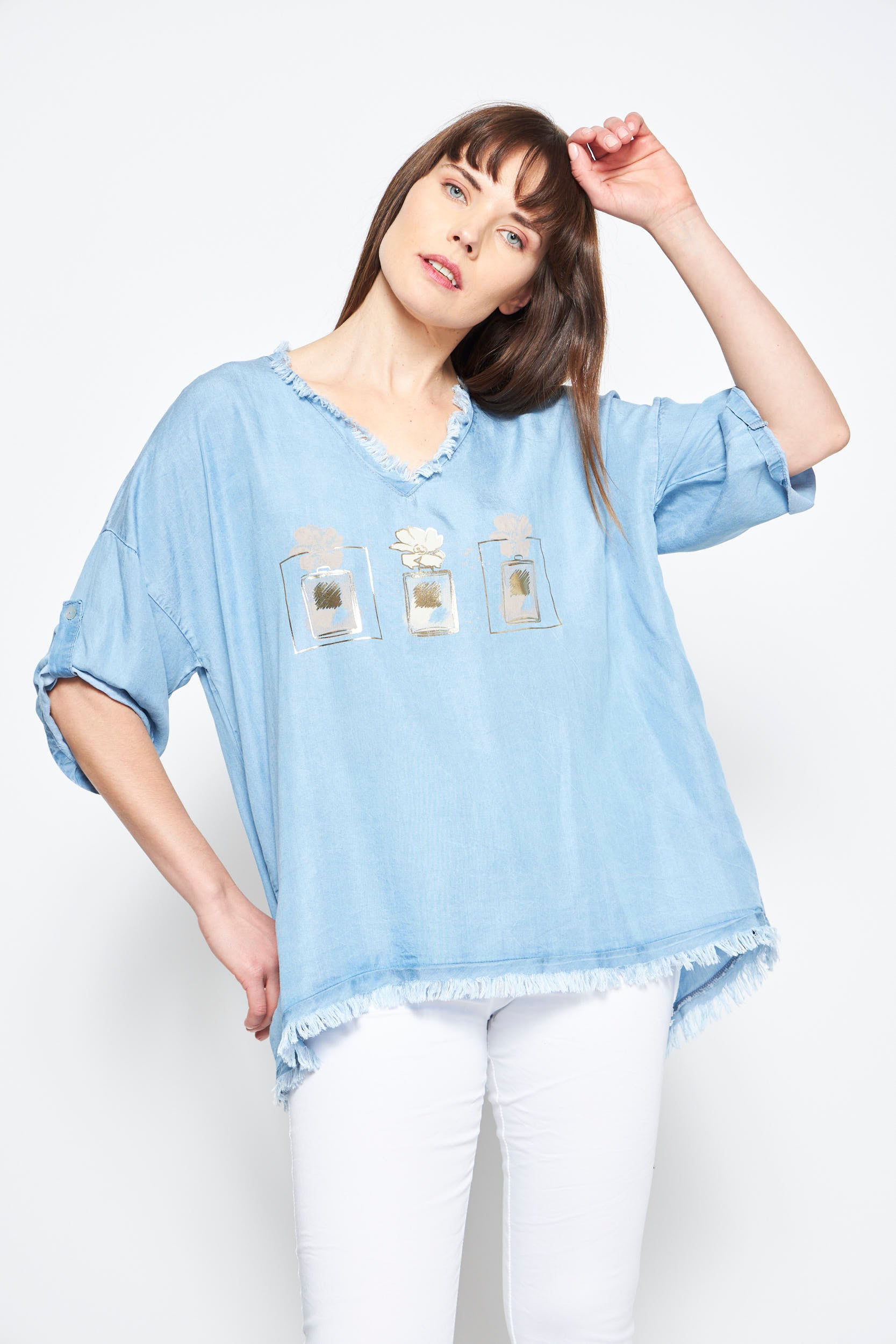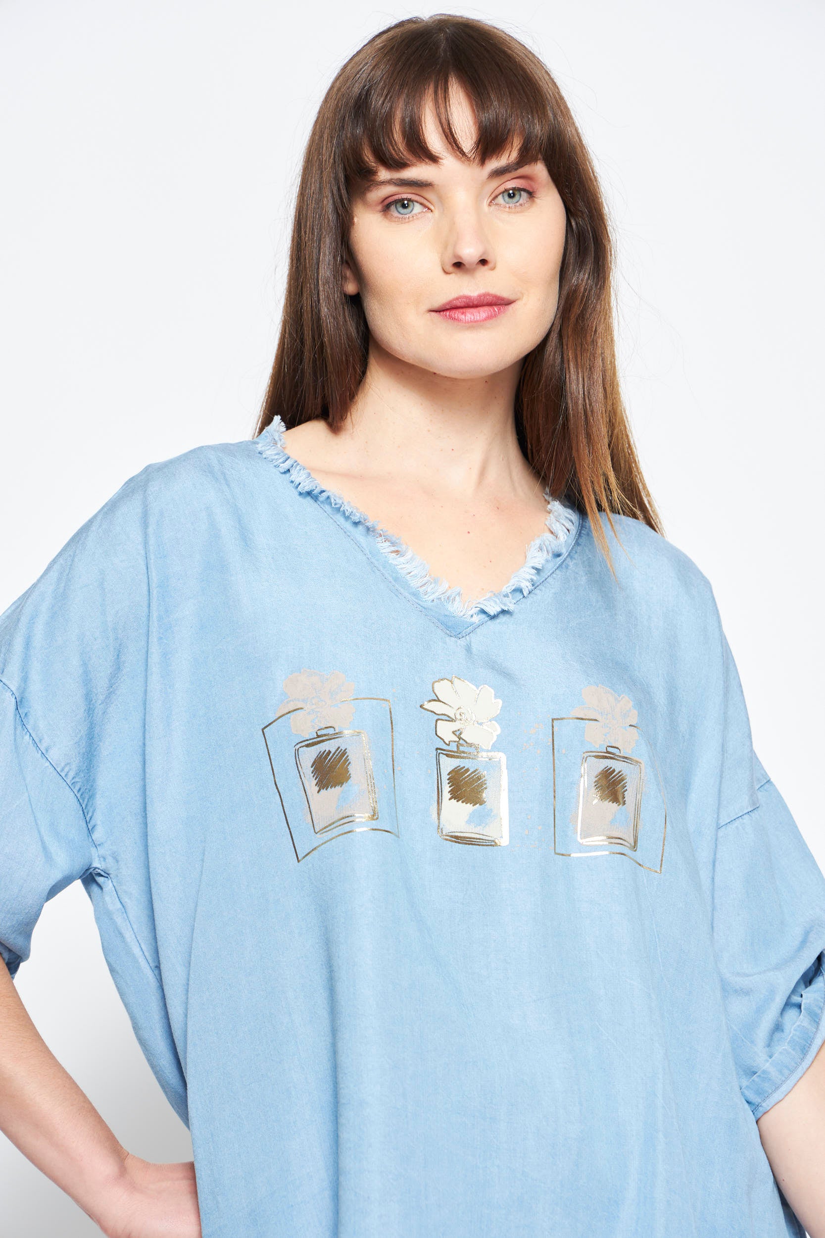 - Descripción: Esta elegante blusa de manga corta presenta un diseño sofisticado con detalles de flequillos y un escote en V que realza tu figura. El estampado dorado añade un toque de glamour, perfecto para cualquier ocasión especial.