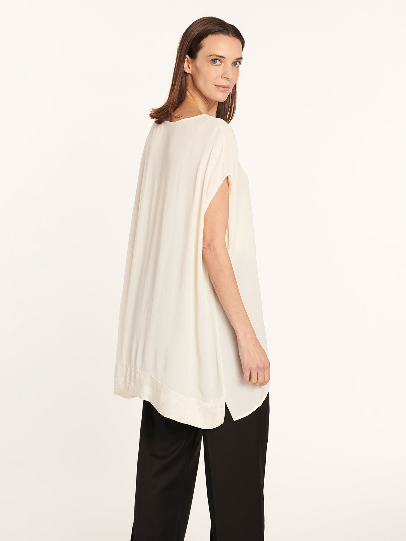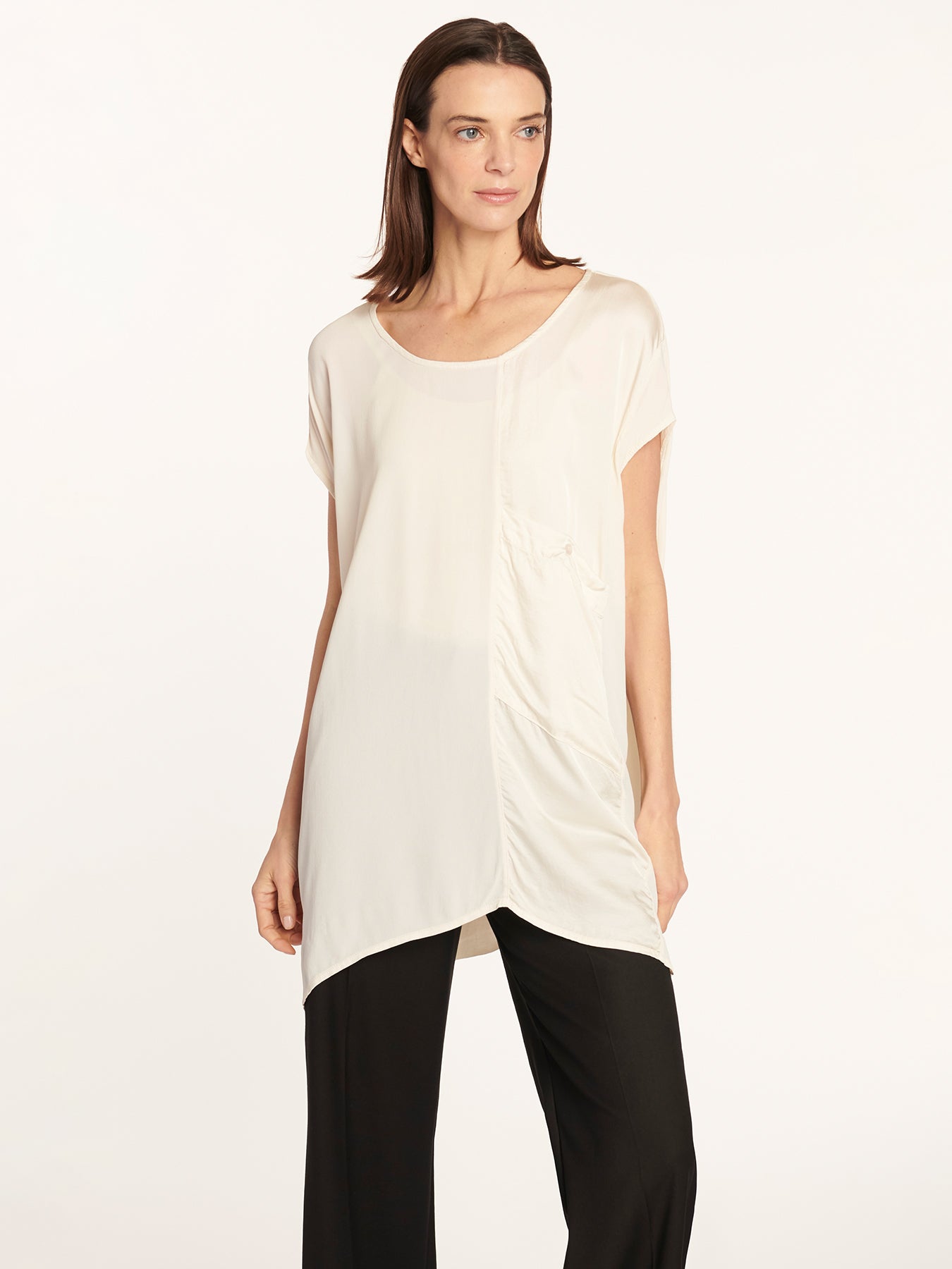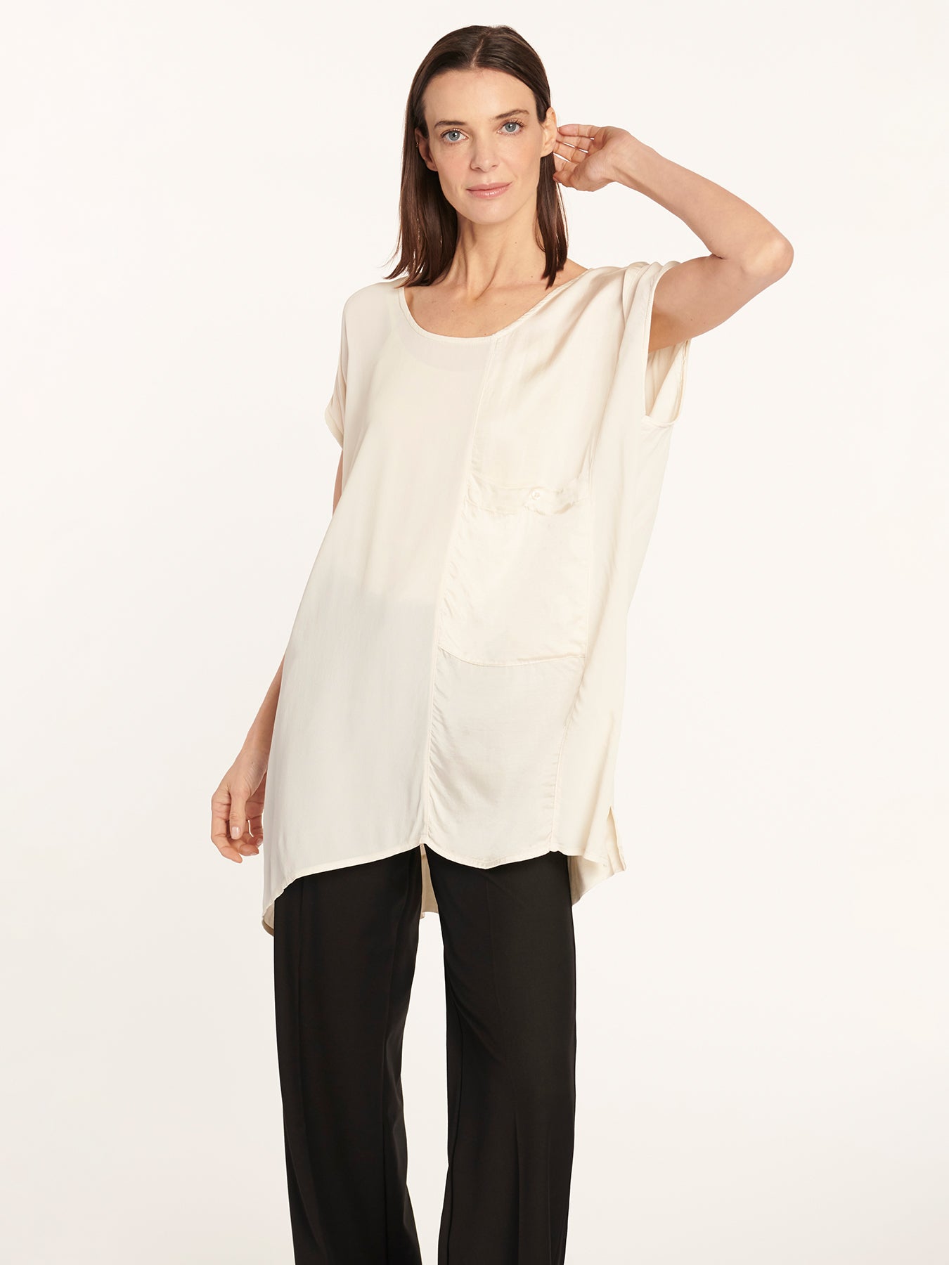Blusa holgada sin mangas con detalle de amplio bolsillo en la parte frontal izquierda con un botón, pequeña apertura en los costados para darle fluidez a la caída.