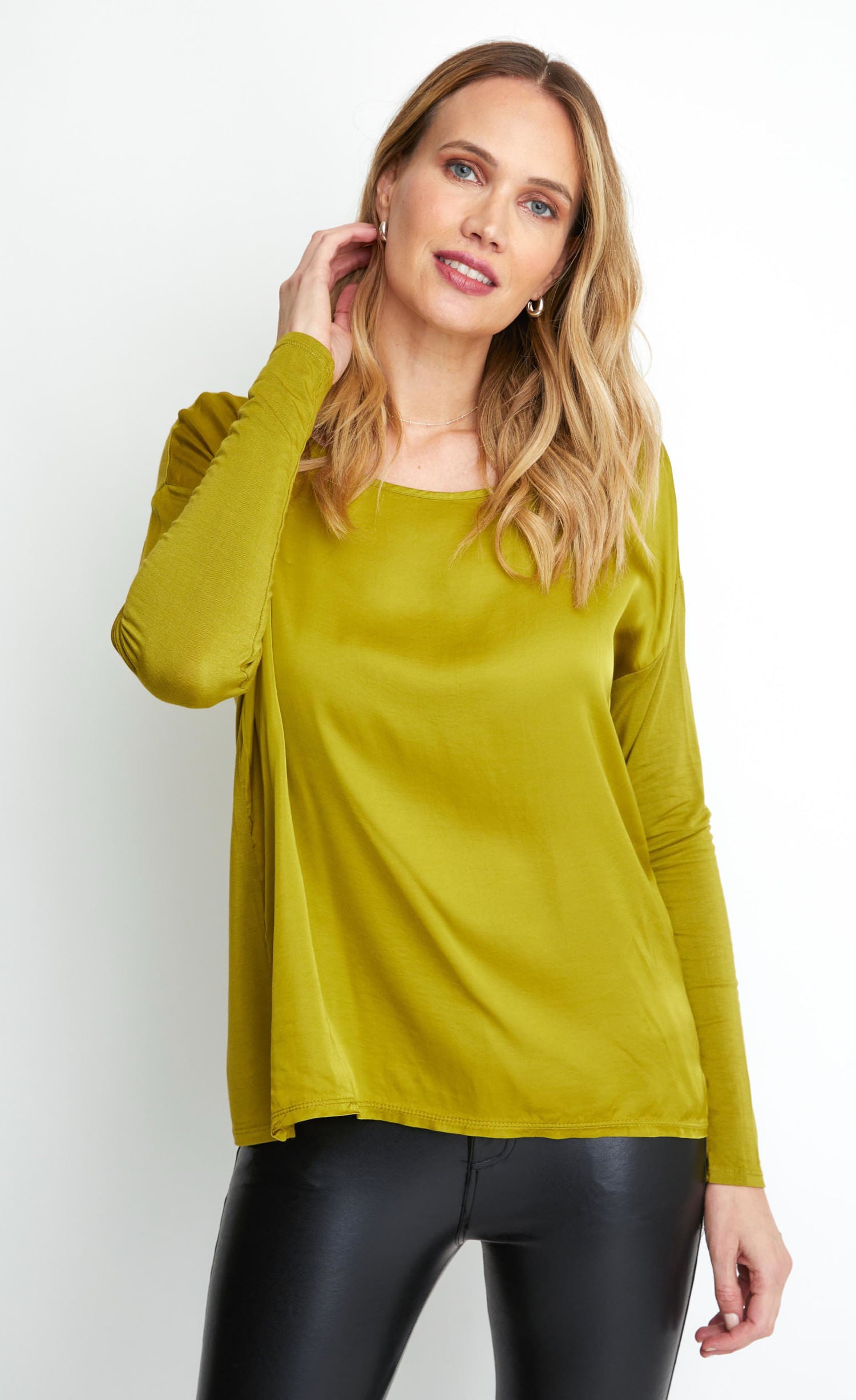 Blusa cuello U, manga larga, y efecto seda. Ideal para looks casuales