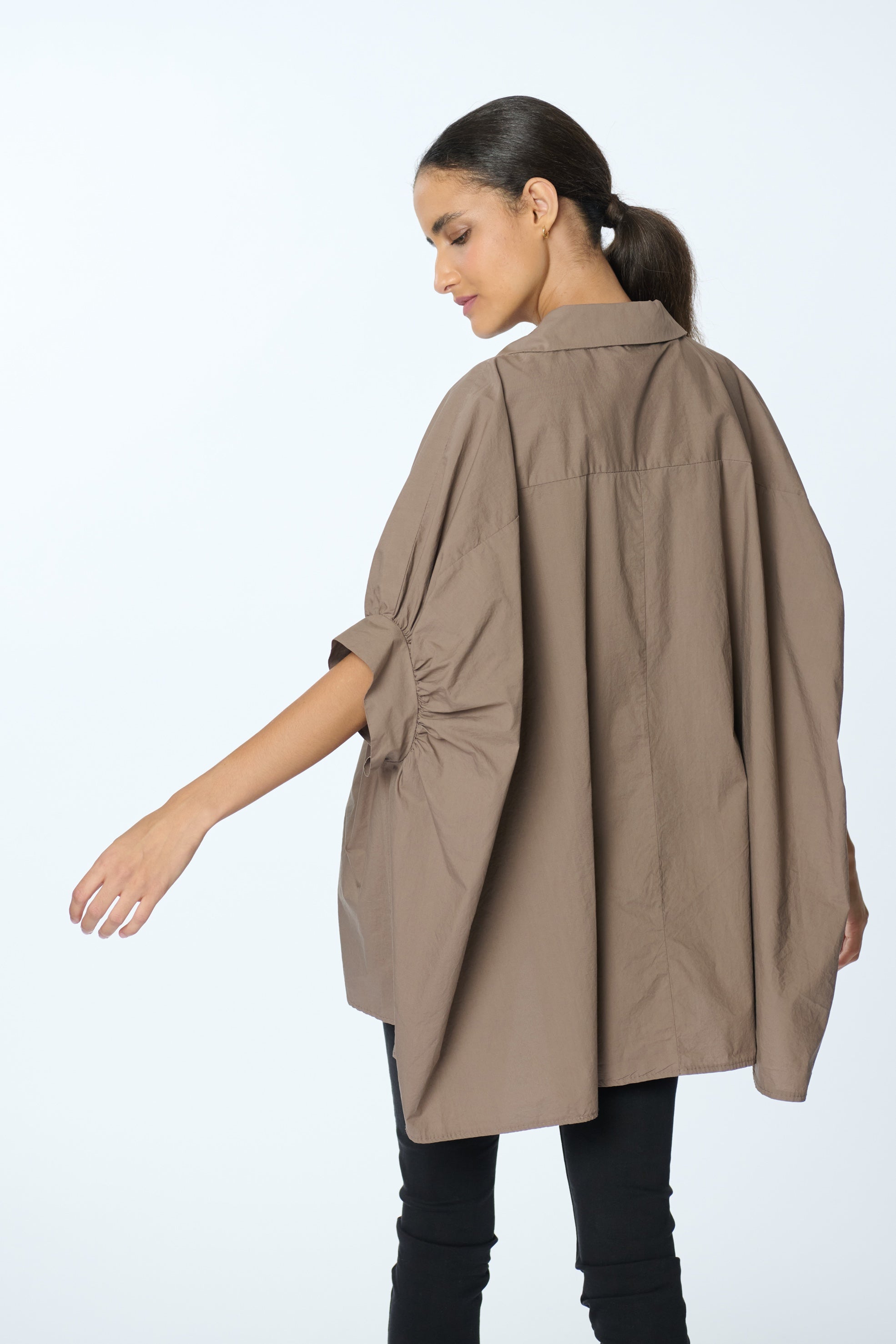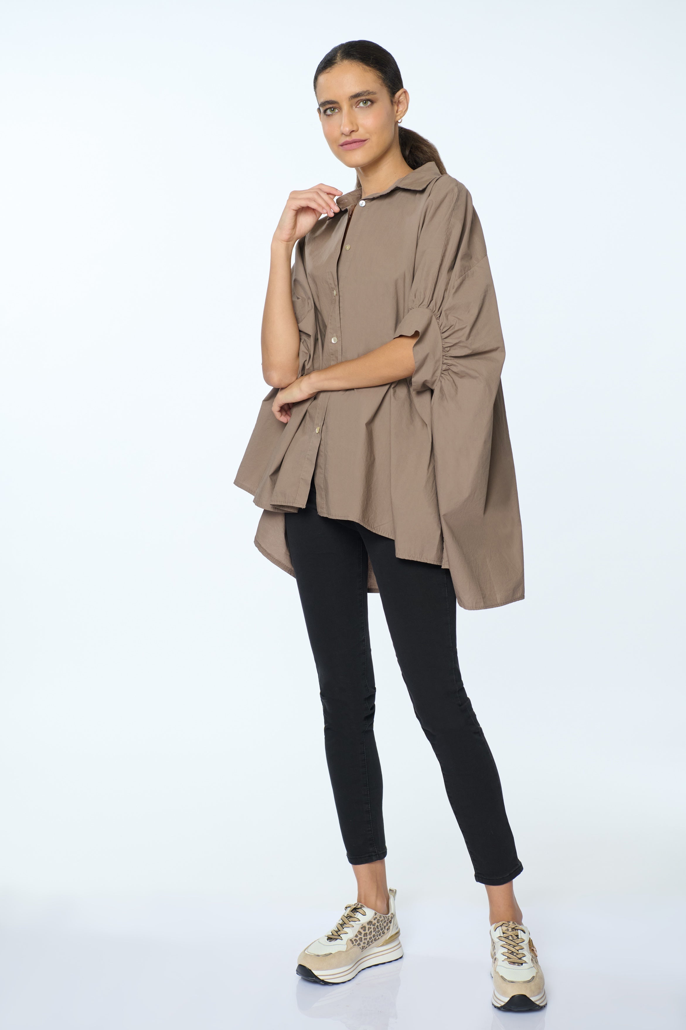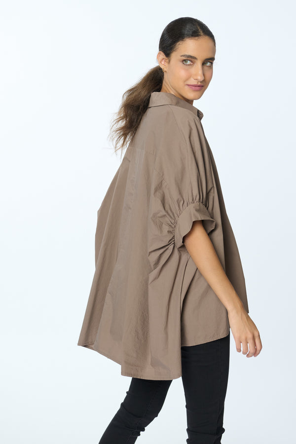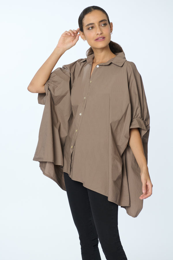 Blusón casual de manga murciélago 3/4 y botones decorativos de concha y perla, ideal para una silueta relajada.