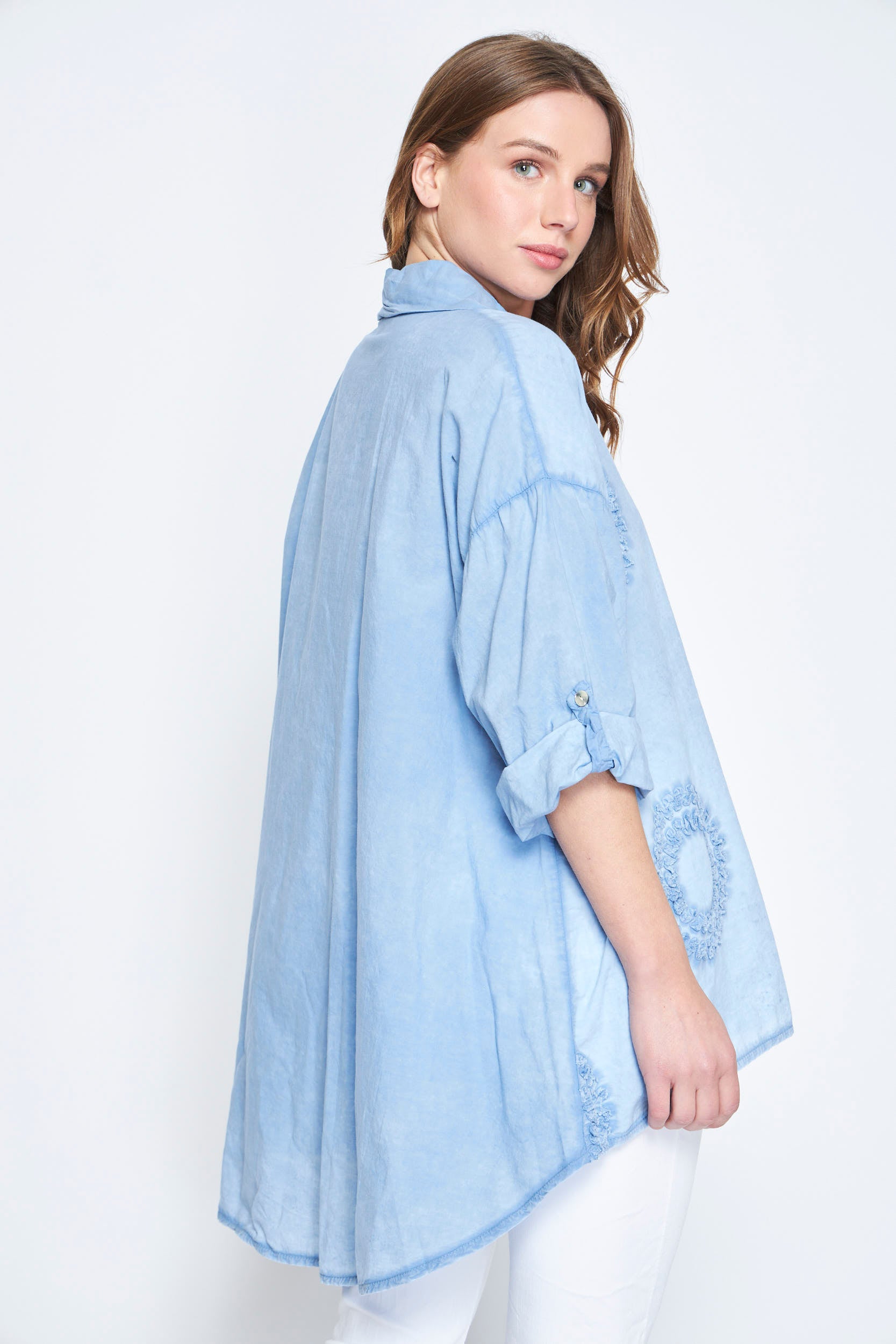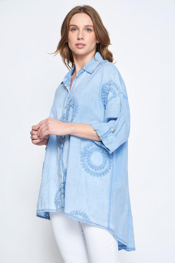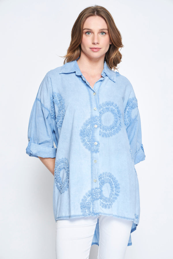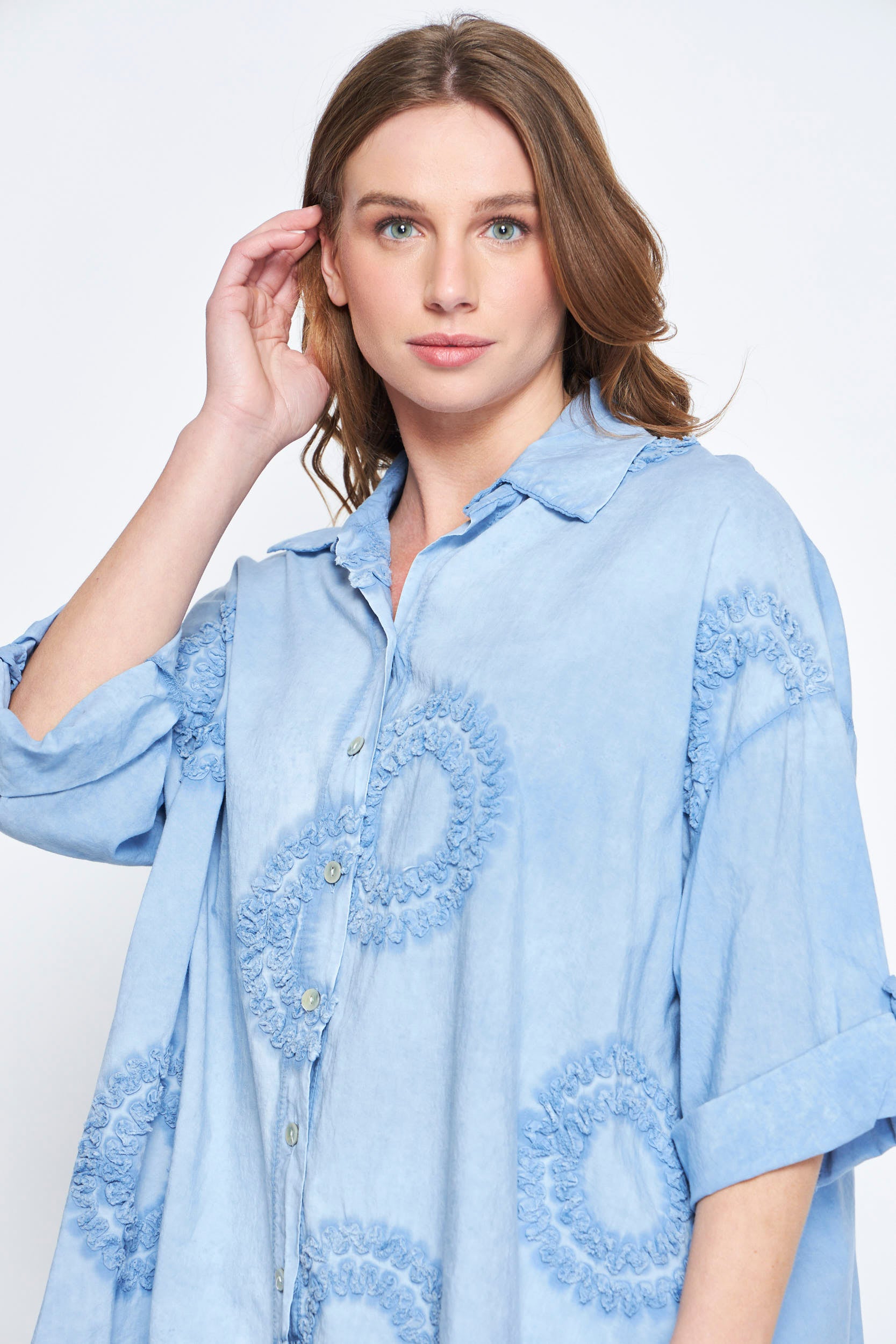 - Descripción: Este elegante blusón abotonado presenta un diseño único con círculos decorativos, ideal para añadir un toque de sofisticación a tu guardarropa. Su manga larga con presilla ajustable permite un ajuste personalizado y cómodo.