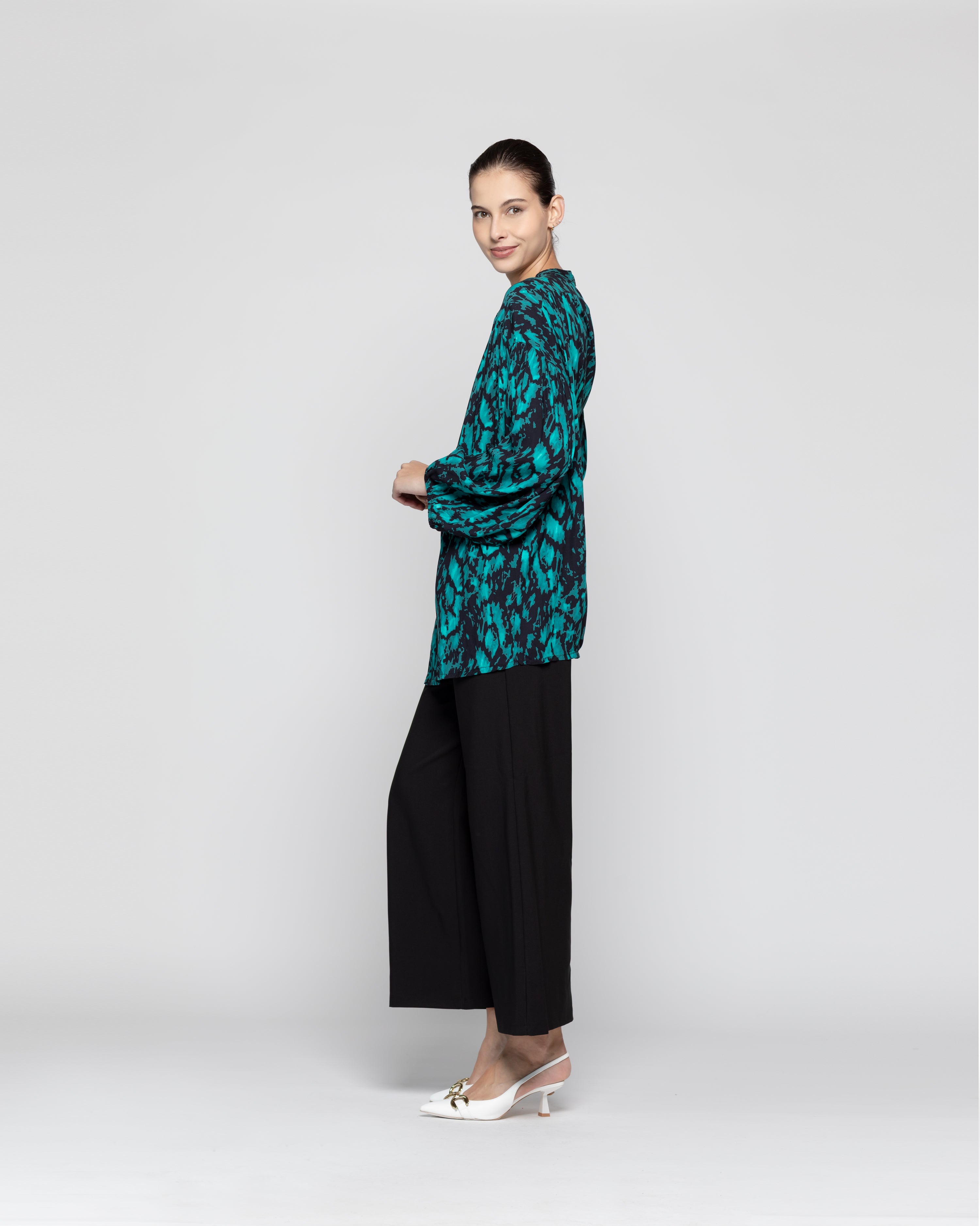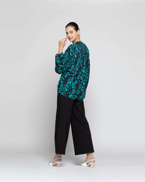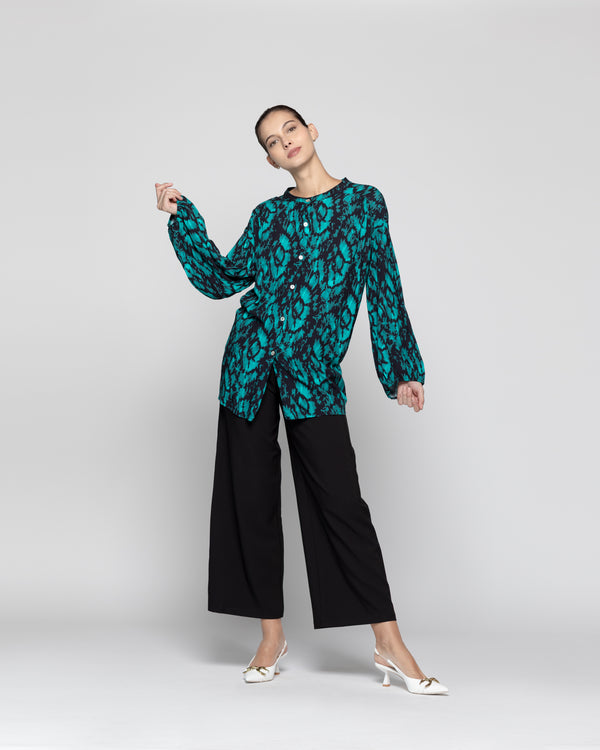Blusa estampada en tonos negro y verde turquesa que con calce oversized, mangas anchas y cuello redondo. Tiene puño con elastico y ajuste con botones blancos pequeños. La elección perfecta para marcar un punto de distinción. Combínala con pantalones negros para un look elegante.