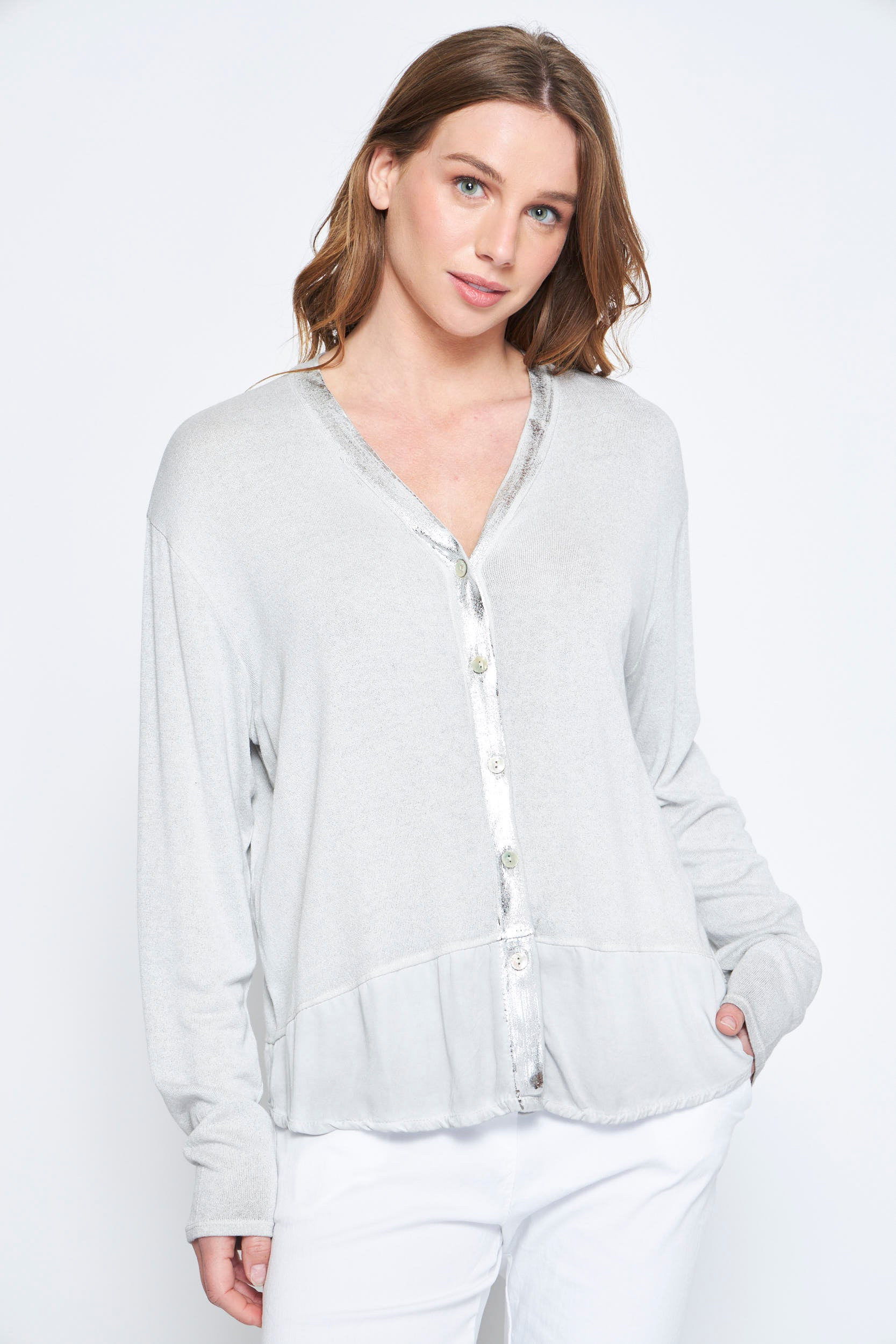 - Descripción: Este elegante cardigan abotonado de manga larga presenta detalles de folia plateada que añaden un toque de sofisticación a cualquier atuendo. Perfecto para ocasiones formales o para darle un giro chic a tu look diario.