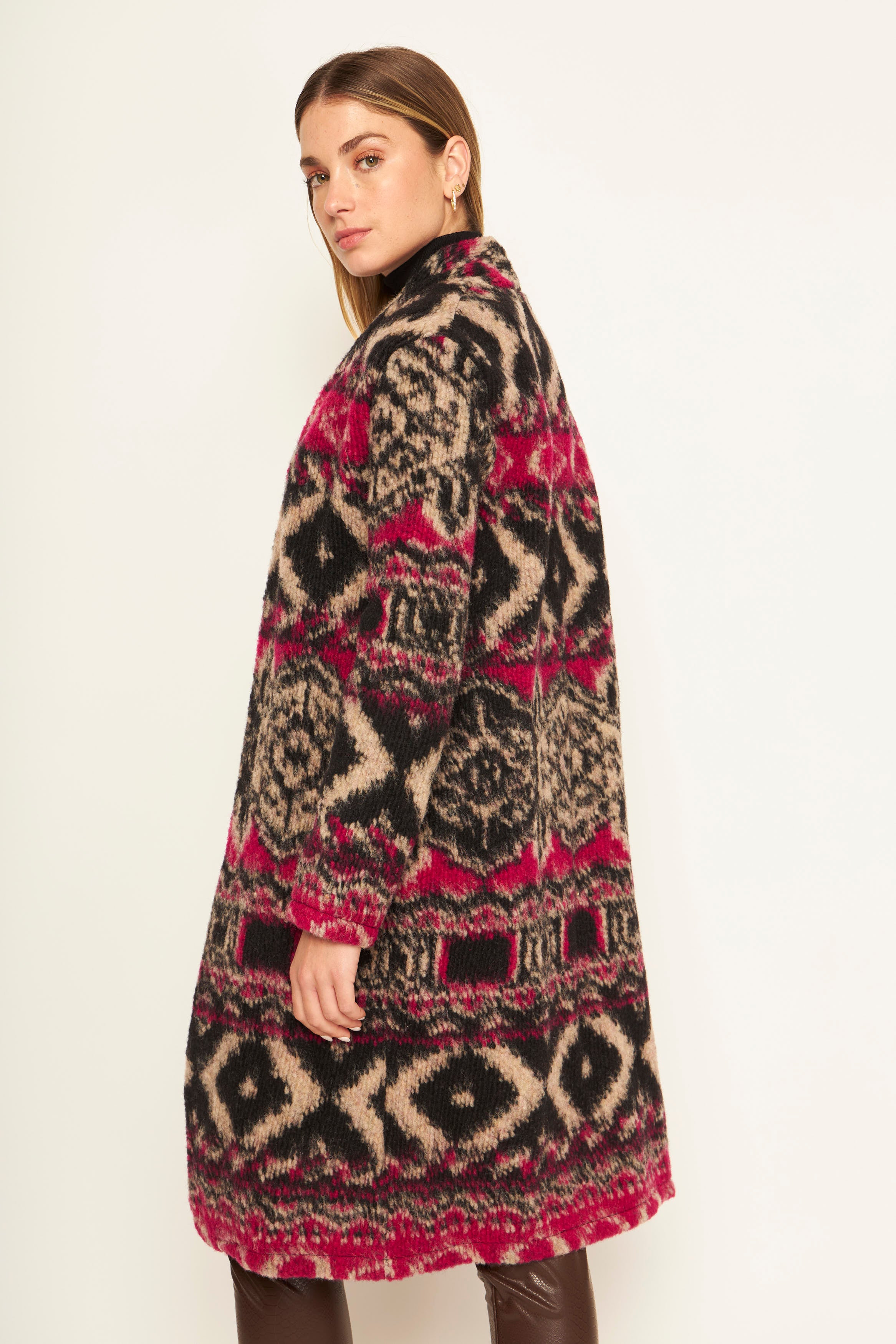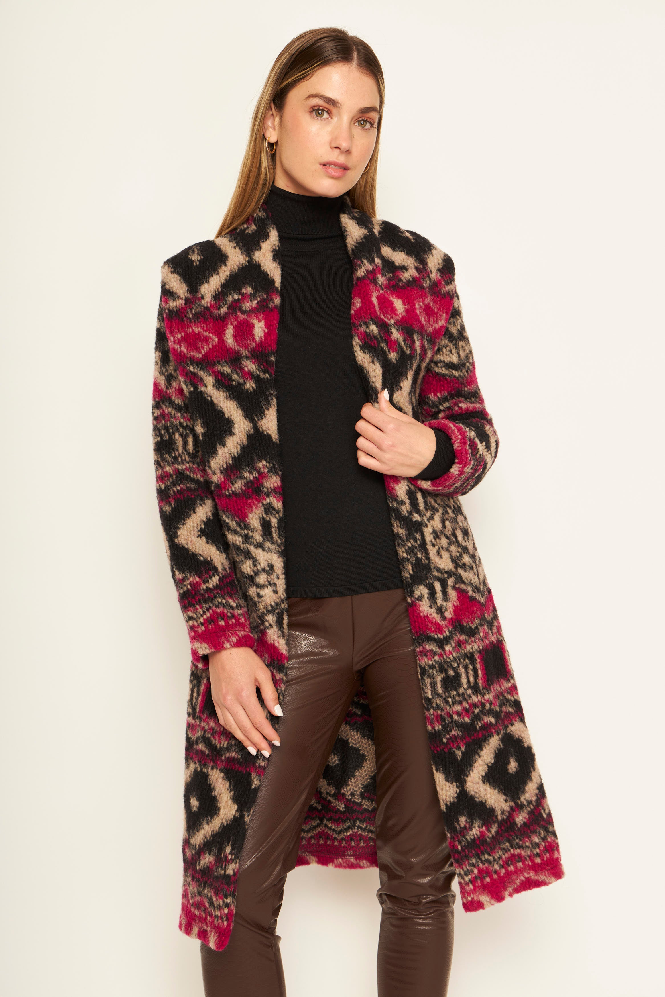 Cardigan largo de lana estampado fucsia, una opción versátil y colorida para la temporada.