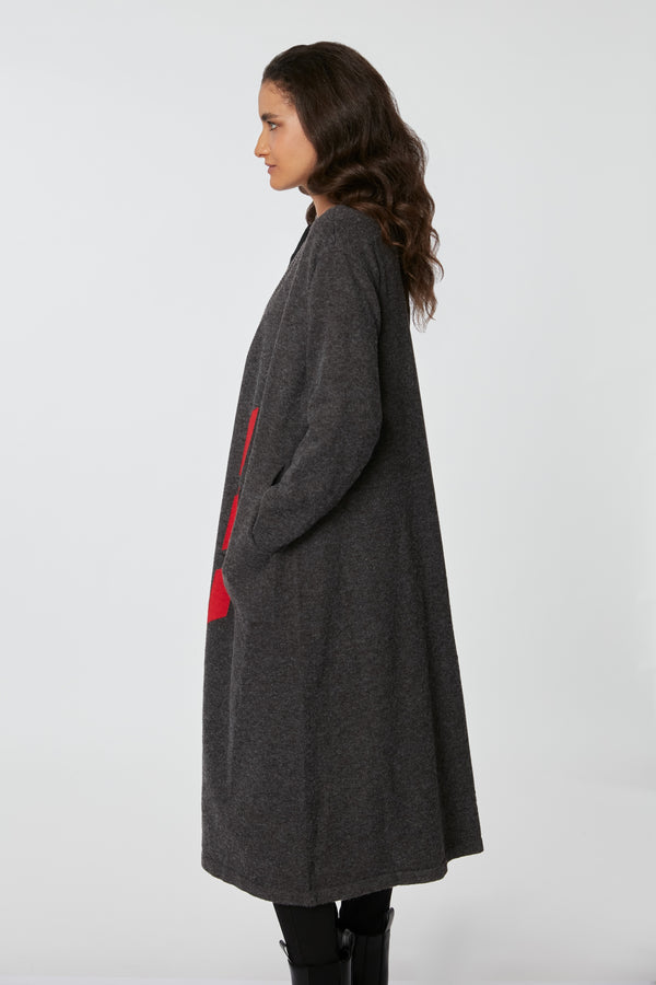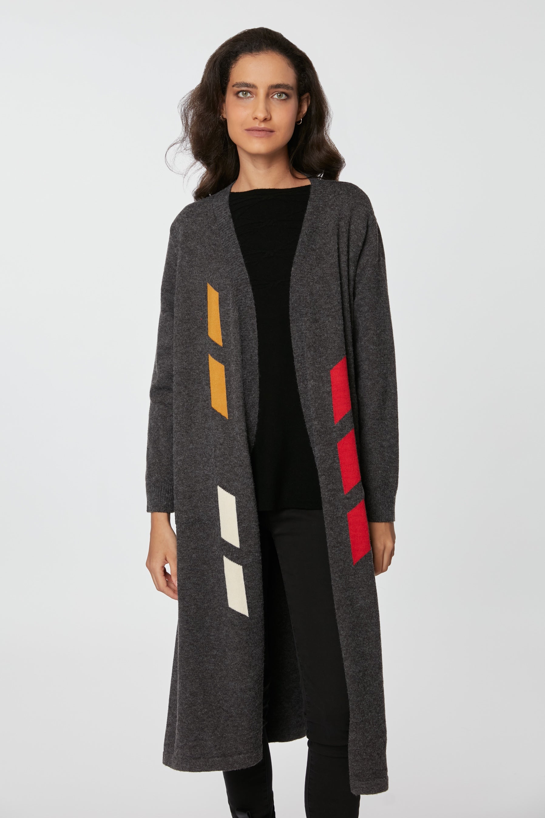 Cárdigan largo con bolsillos camuflados y colores decorativos, perfecto para un día de trabajo o para el fin de semana.
