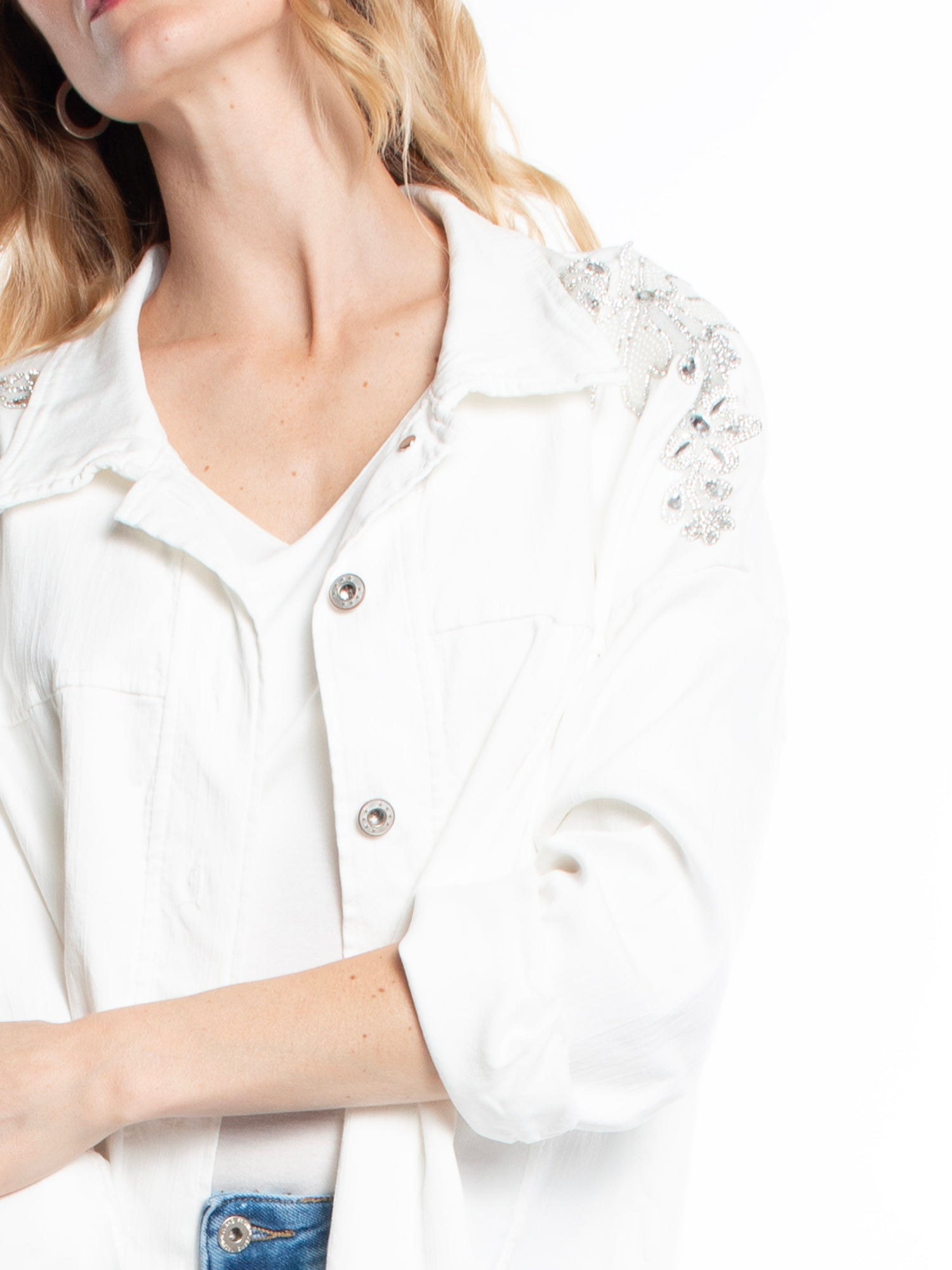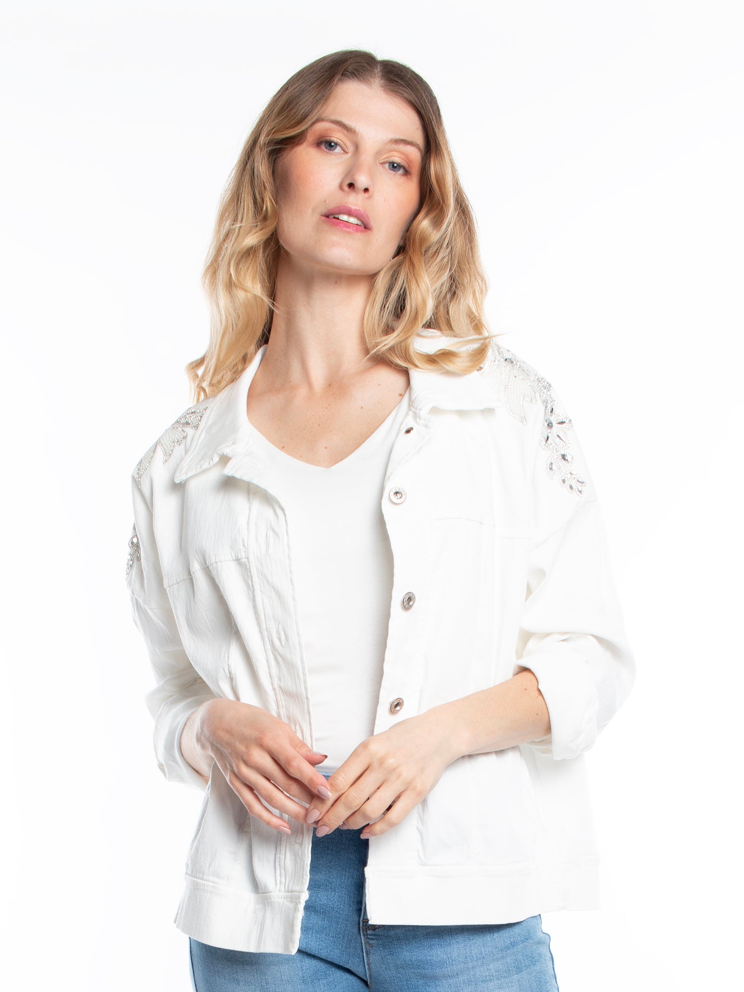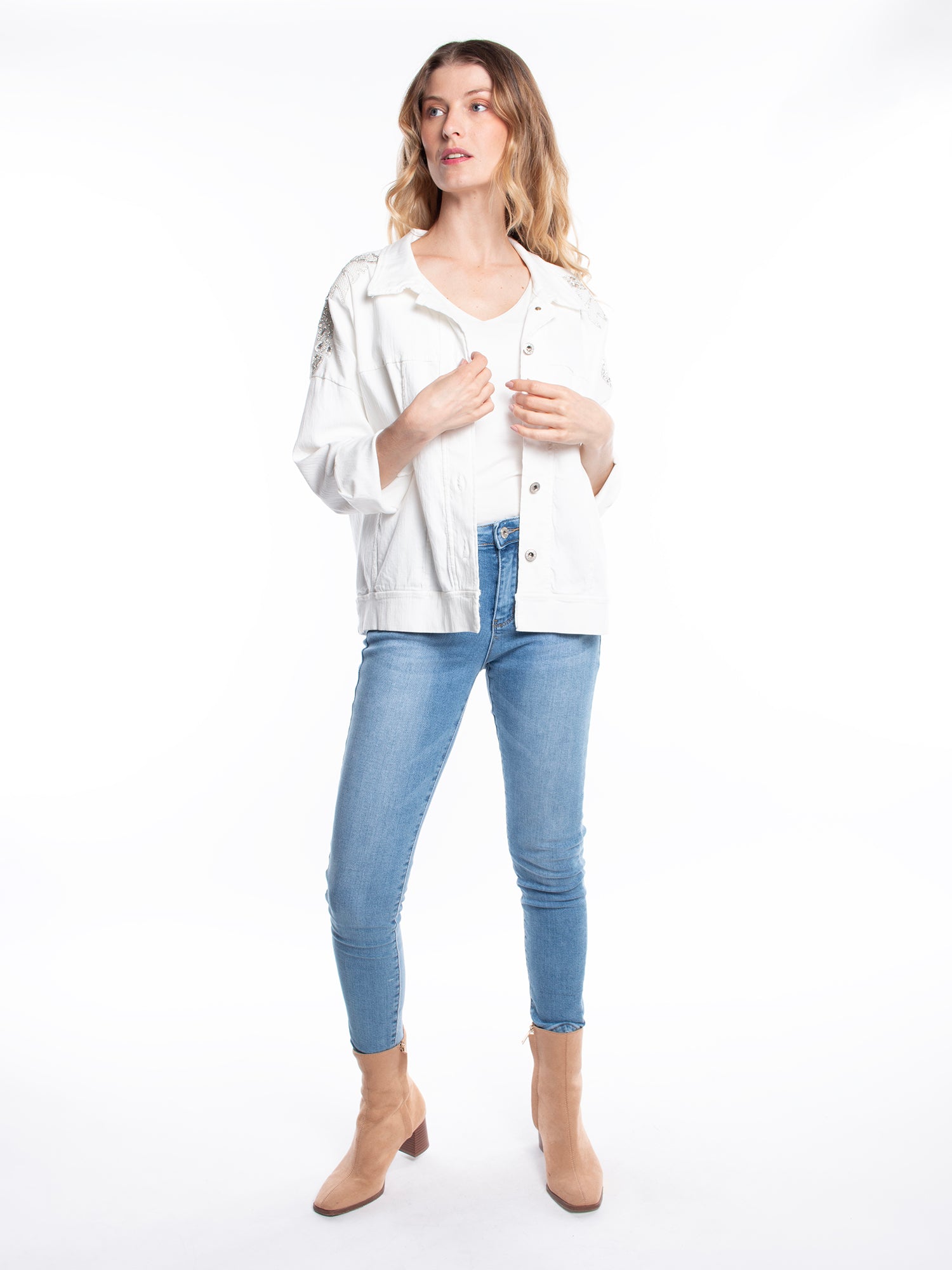 chaqueta mezclilla . estampado con brillos. corte recto. ideal para look casual y fiesta