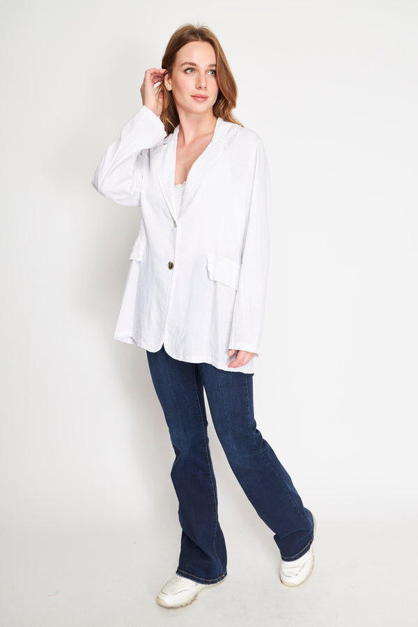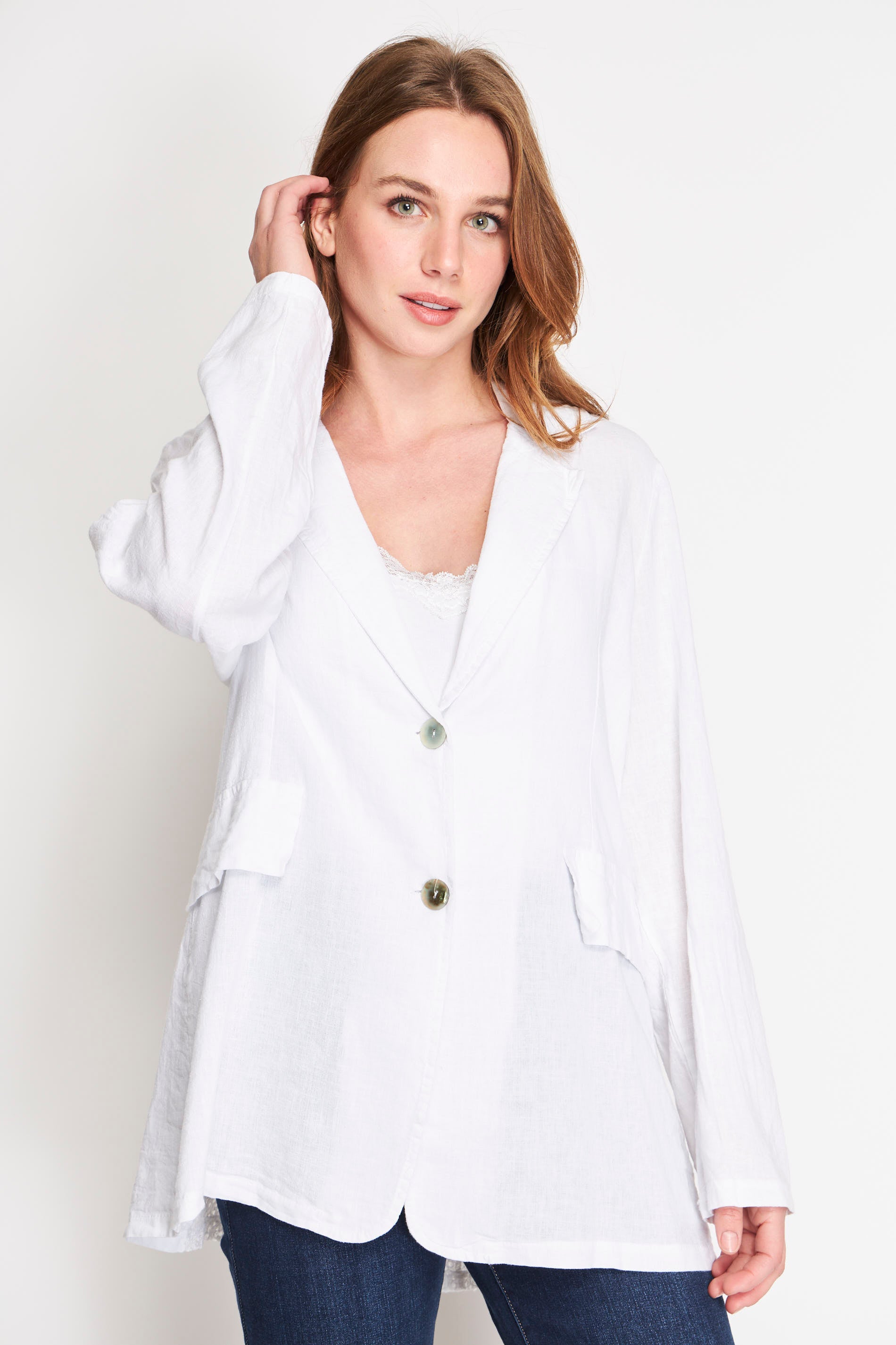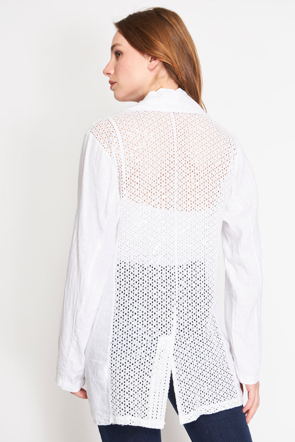 Chaqueta de lino con espalda decorada, perfecta para un look sofisticado. Úsala con falda y tacones.